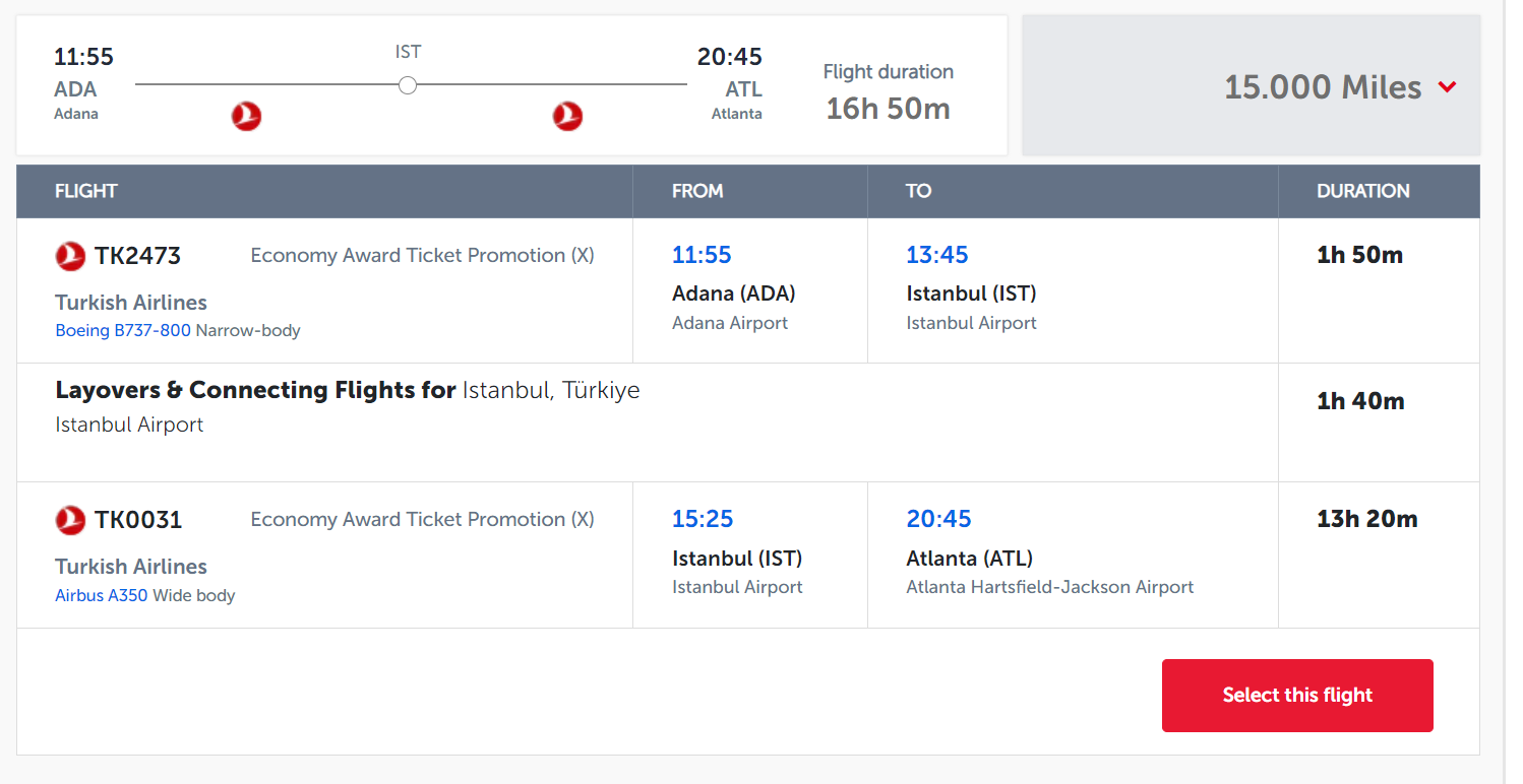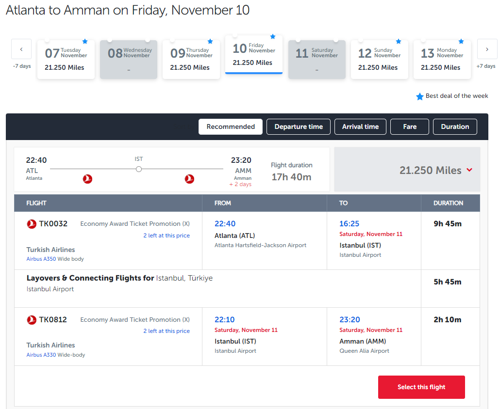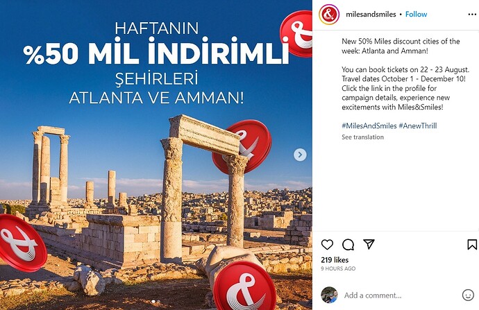 土航每周会随机选择两个目的地,里程价五折往返土耳其(包括伊斯坦布尔以外的土国机场)。目的地在土航的IG公布。本周令人意外的是,土航选择了亚特兰大 (ATL) 和约旦首都安曼 (AMM)。折扣仅限经济舱。