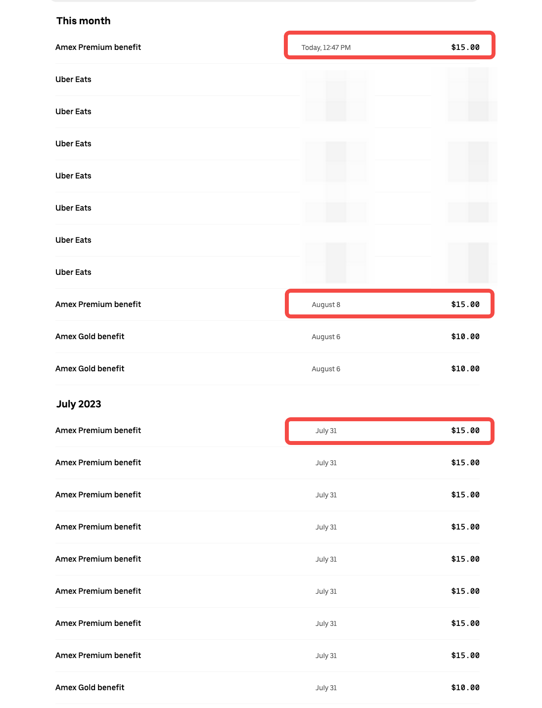 2021.8 升级到amex platinum拿upgrade offer,从此开始每个月同时给$10 + $15 Uber credit