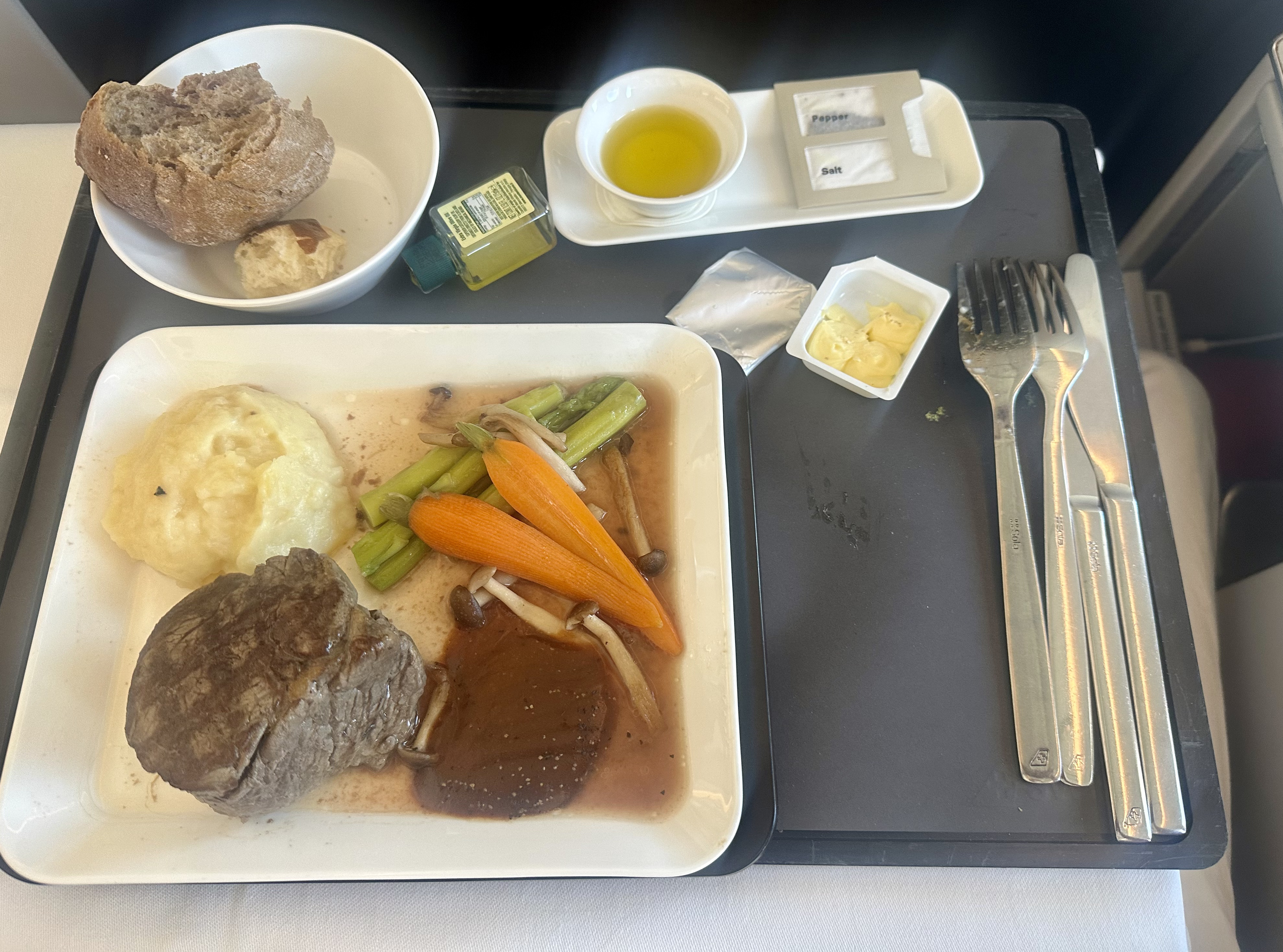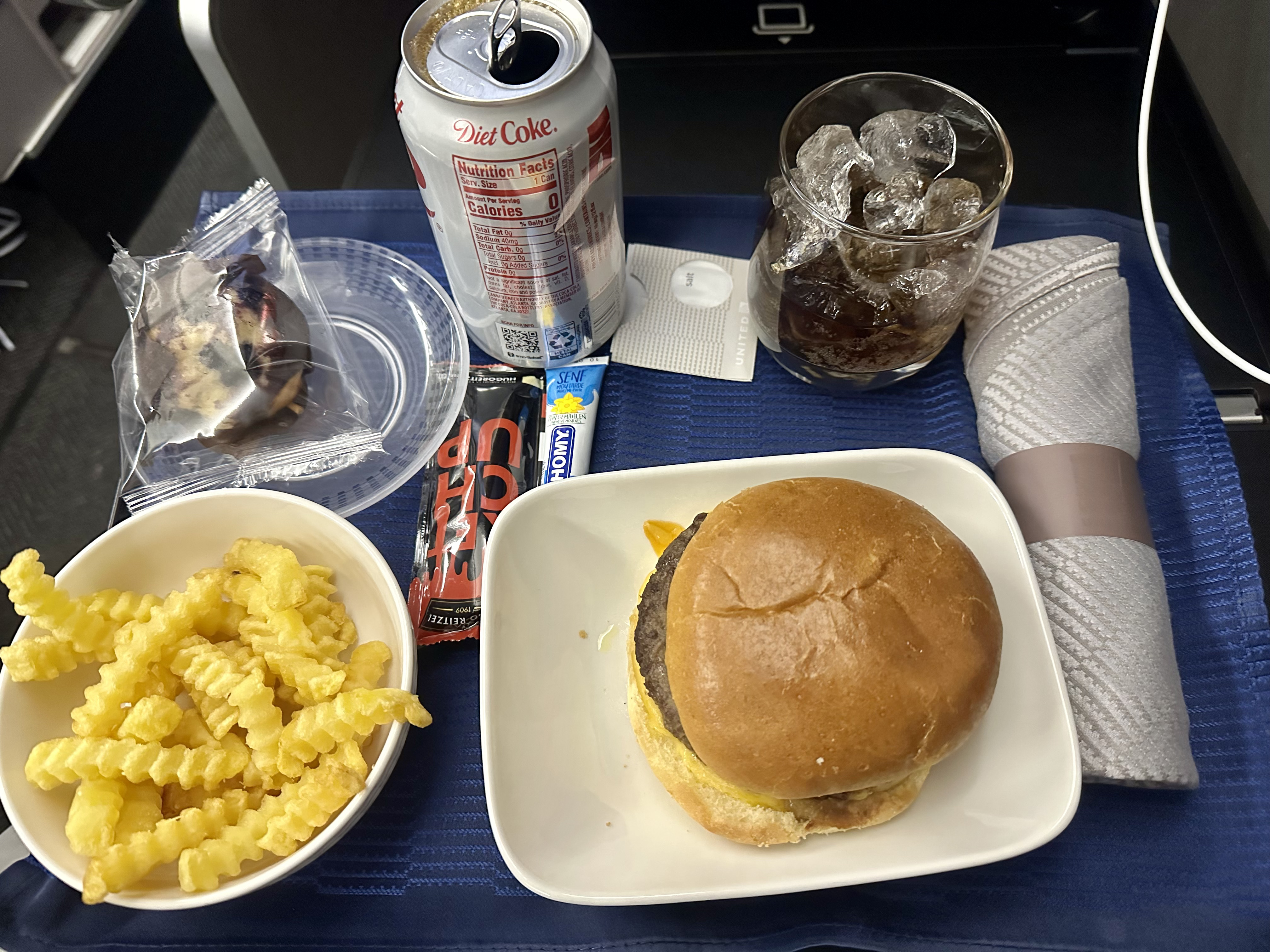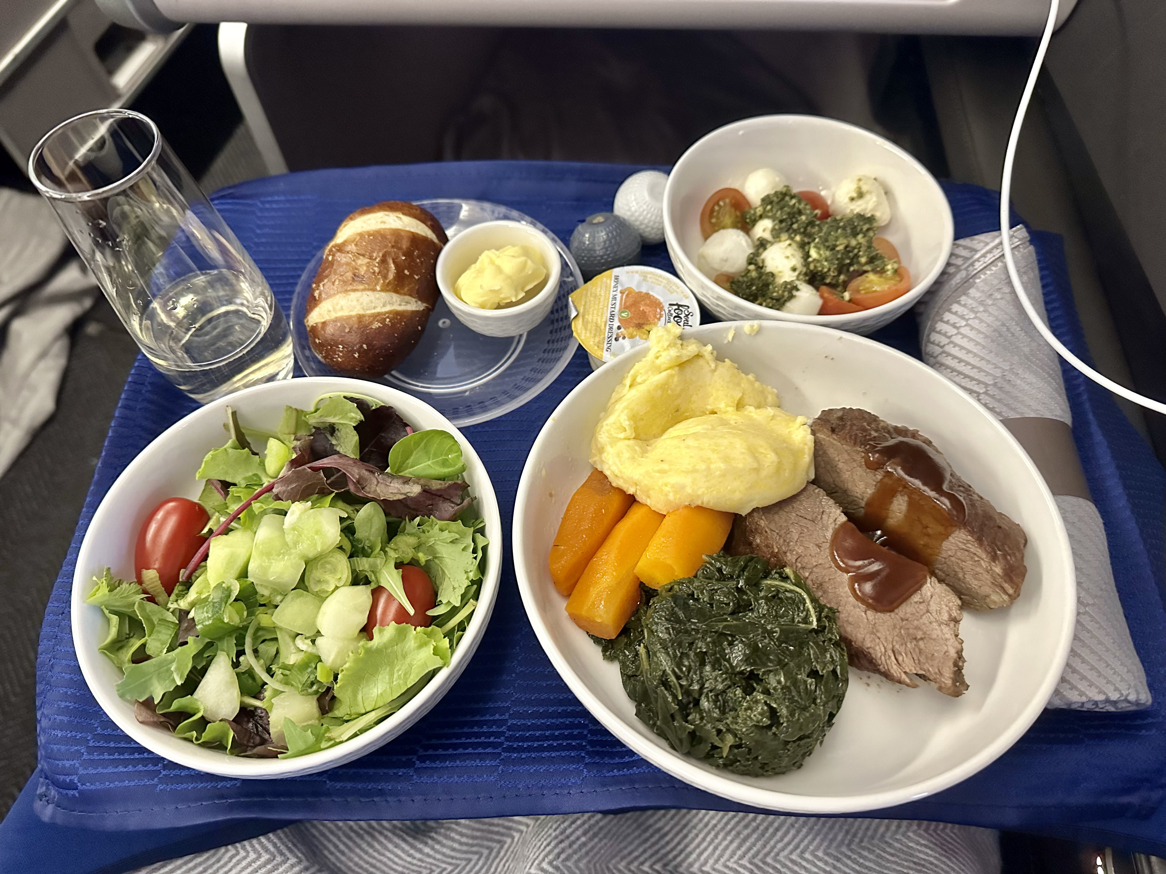 United 26年机龄的767-300ER,上飞机前本来不抱啥希望,但是实际乘坐体验还可以,飞机内部也是前些年翻新过的。安全带的设计很有意思,是那种老式的扣子。空少非常客气,菜品也不错,就是热量爆炸,不过遗憾也不能选两道主菜。。。