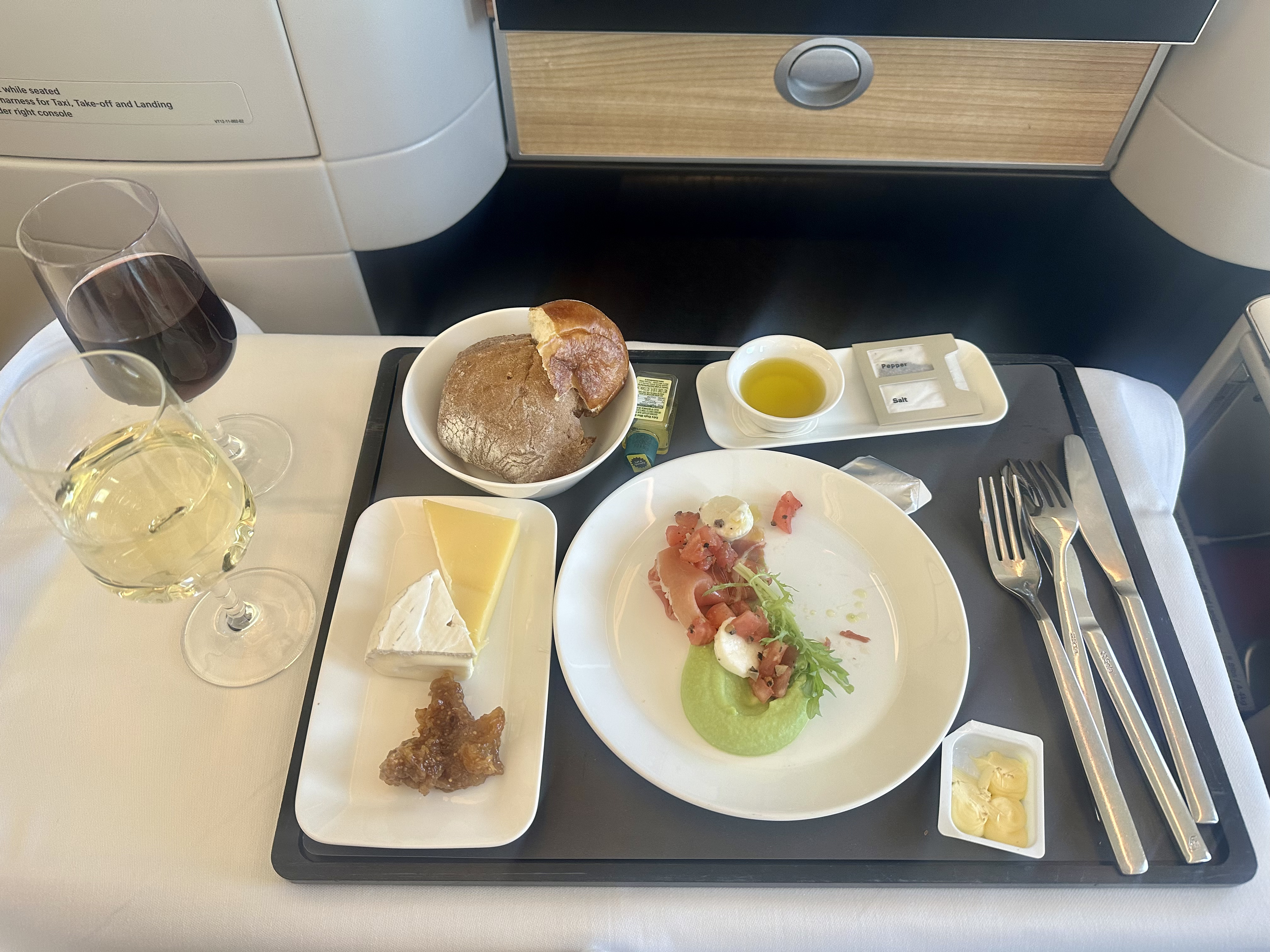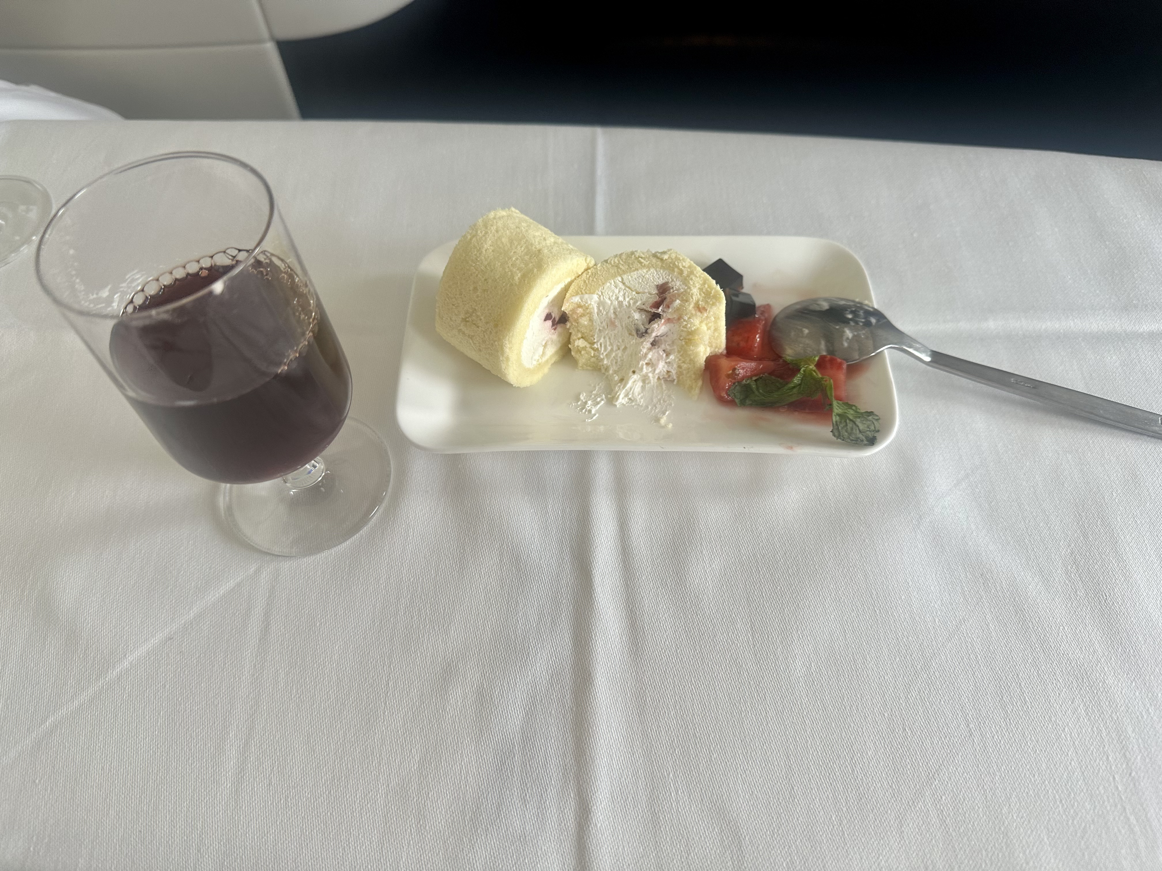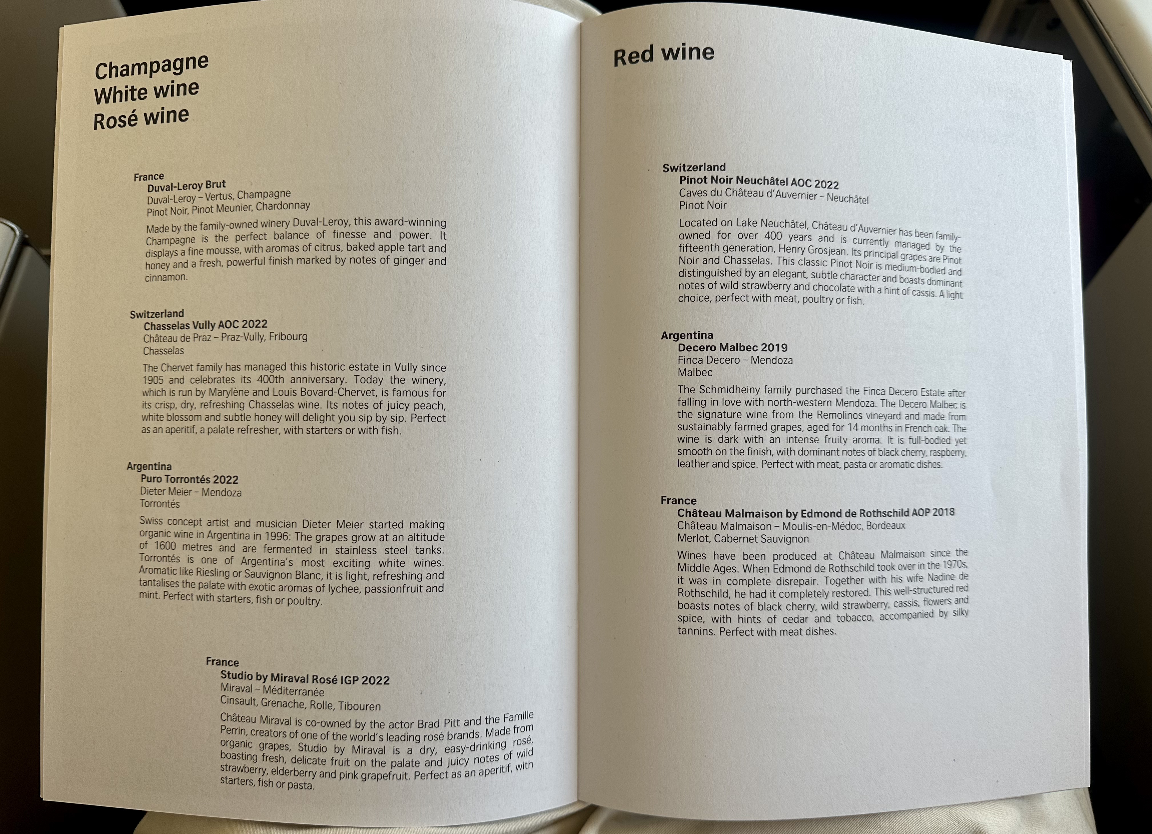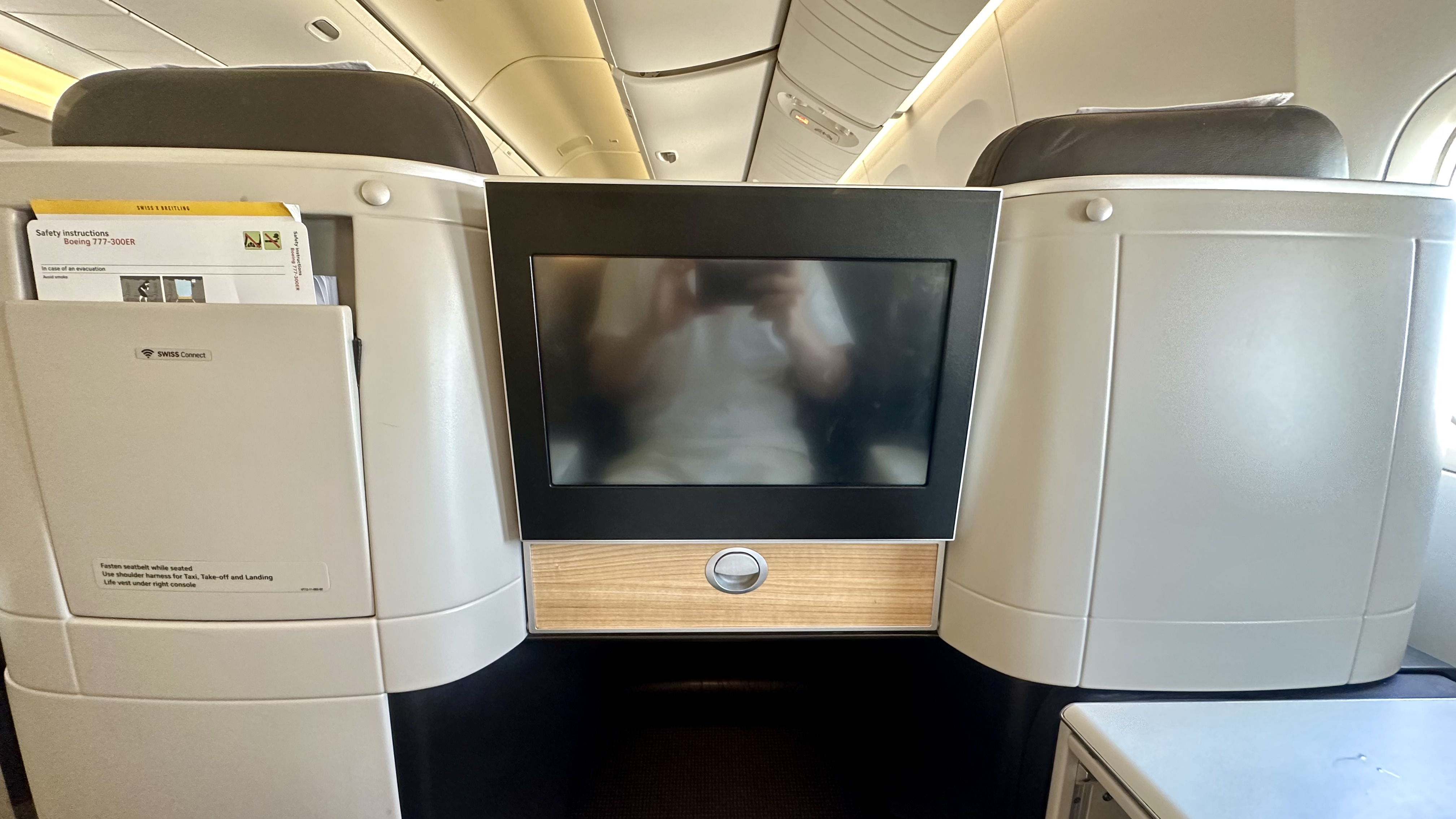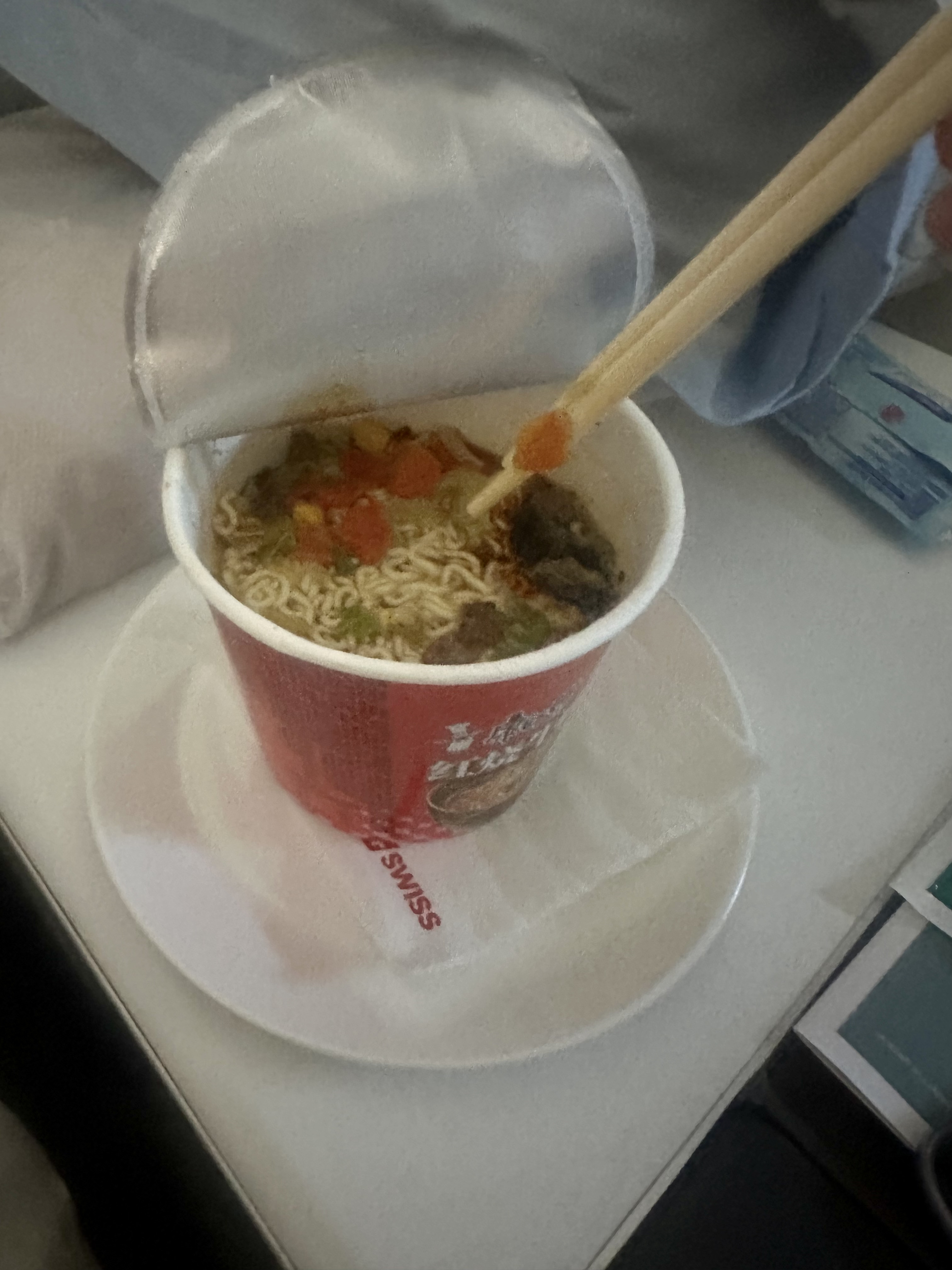SWISS当天值飞是全新777-300ER,机龄2.5年,很幸运的选到了偶数的单边靠窗坐(布局2-2-1,solo throne seat,外号王座),宽敞舒服并且隐私性很强。食物很一般,微波炉10分熟牛排你说能有多好吃,香槟也是比较普通的Duval Leroy,不过餐后酒有波特酒可选还蛮惊艳的,搭配甜品非常合适。期间想尝下其他主菜被中国空姐无情拒绝了,被告知过了正餐时间不给加餐,小吃只有色拉和鸡蛋面可以选择,而且还不保证都有,无奈最后要了一碗泡面。落地前在飞机的屏幕上被告知需要落地后去transit center改票,大概率是由于托运时候地勤没有给到第二段登机牌,导致第二段航程没有完成Check-in,也为后续落地造成了一些不必要的奔波。