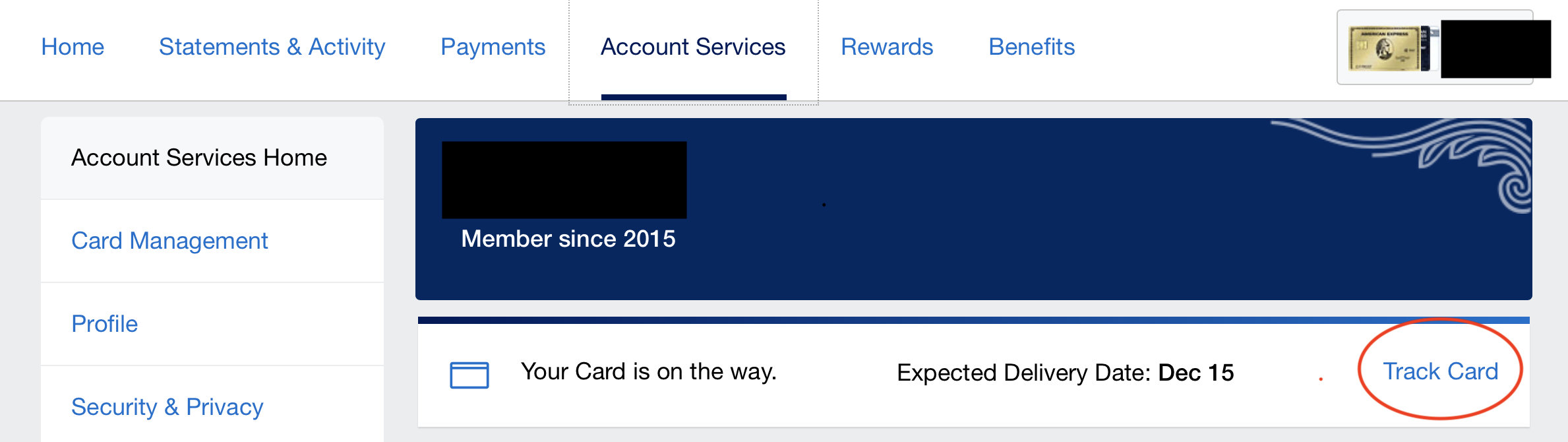 我这个是新卡,不过申请的时候是登陆状态下申的,这样不用填账户里已经有的信息(姓名、地址、etc),所以申请完就出现在online account里了。