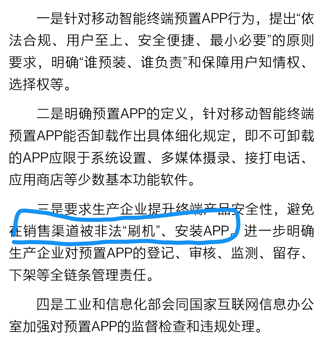 由于移动智能终端允许用户自行安装和卸载APP,在产品流通过程中就有可能会被非法“刷机”,包括被更换操作系统或安装一些非法的APP。为避免“刷机”带来的安全风险,保护用户权益,《通告》要求生产企业完善移动智能终端权限管理机制,提升操作系统安全性,采取技术和管理措施预防“刷机”行为。