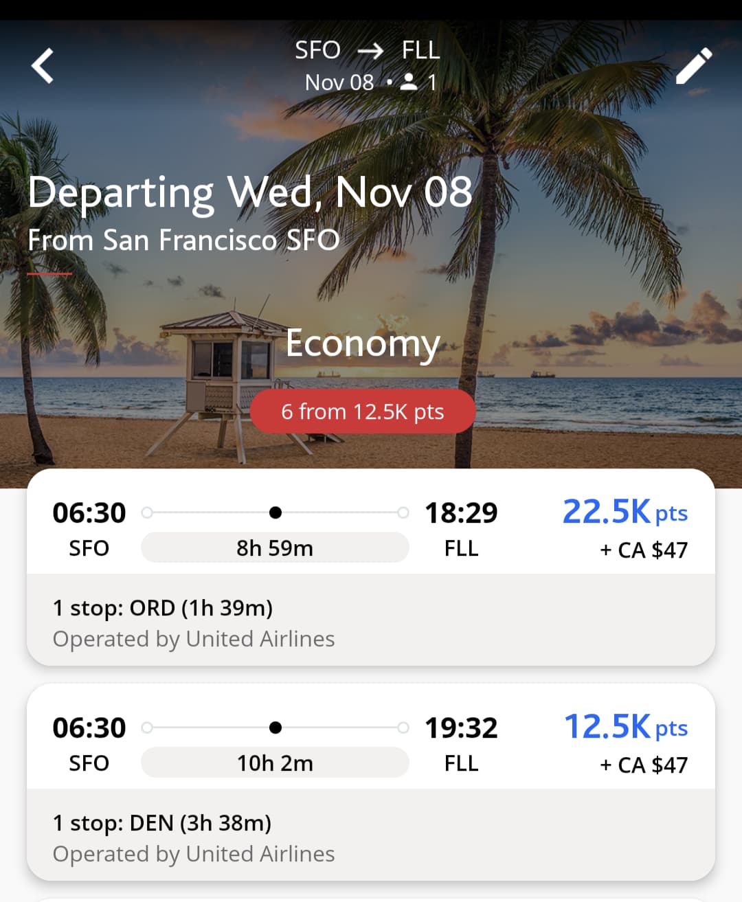 但要注意有些转机因为绕路,会让飞行距离超过2750英里,比如这个SFO-ORD-FLL路线,会进入下一档的22.5K收费。所以记住出票时候就不要选它们啦: