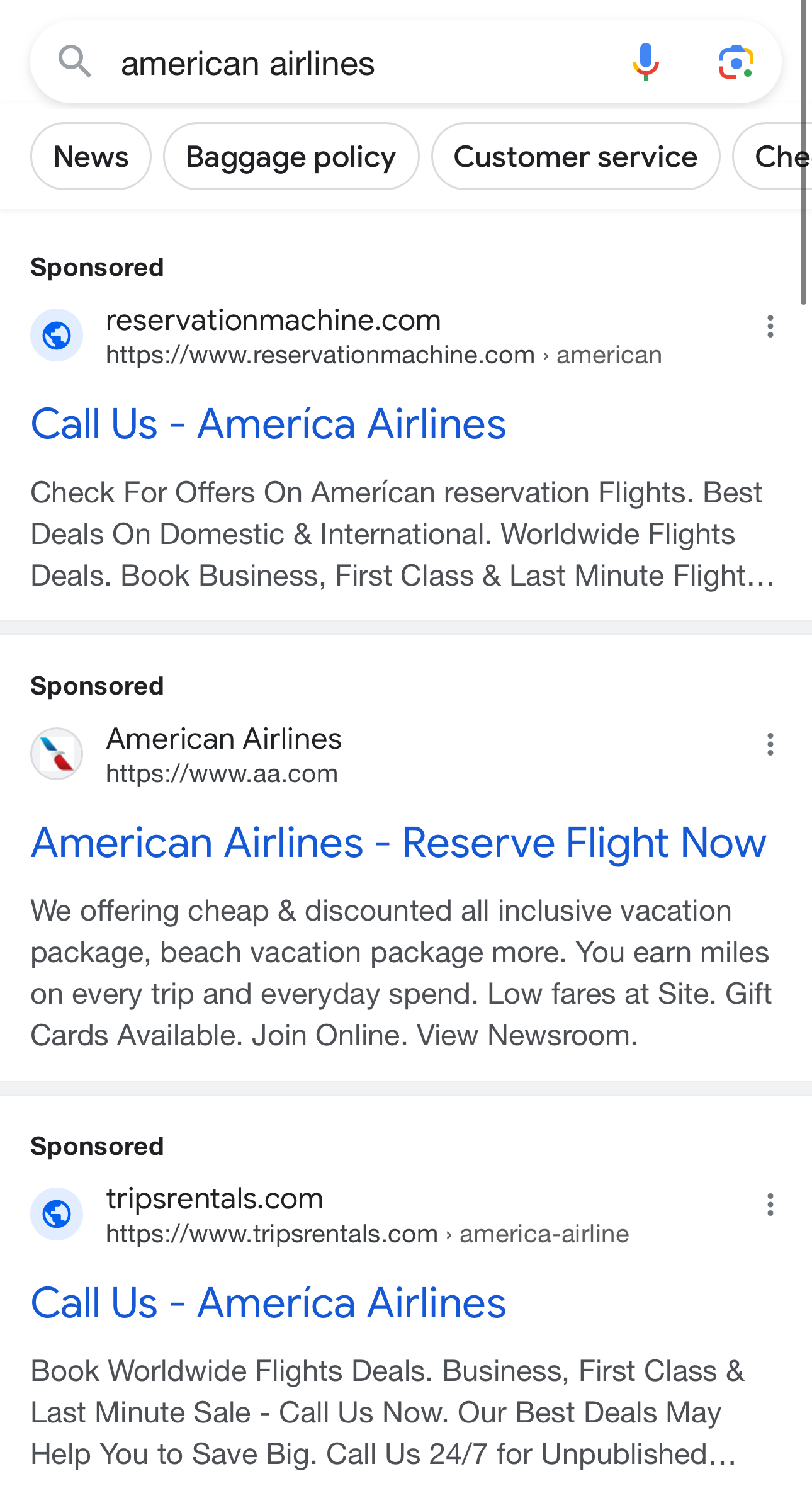 其实我去年遇到过,当时订了aa last minute,就往机场赶,但因为没有出票成功,打算在路上打给客服省点时间。因为在开车(开车不要看手机),没仔细看,就打了个奇奇怪怪的电话。接电话的一股浓浓的阿三口音,我甚至没听明白他在说啥,后面他急了,在电话那头狂问问题,这时候我意识到不对劲,感觉是打给垃圾ota去了。后面挂了电话点点点才打对客服。