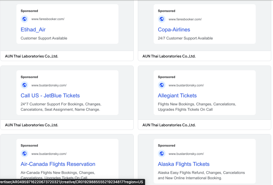 是广告投放公司故意把主标题和副标题都写成了官方的,但最后的跳转链接放的是自己的。我们在楼上讨论的那个就是,它主标题写的是American airlines,副标题写网址也写的是aa.com,但是点击的链接就是他们自己的。我特意点进那家公司投放的广告情况,有37个,其中还有united.com和delta.com的广告,都是欺骗性很强的。顺便举报了一波