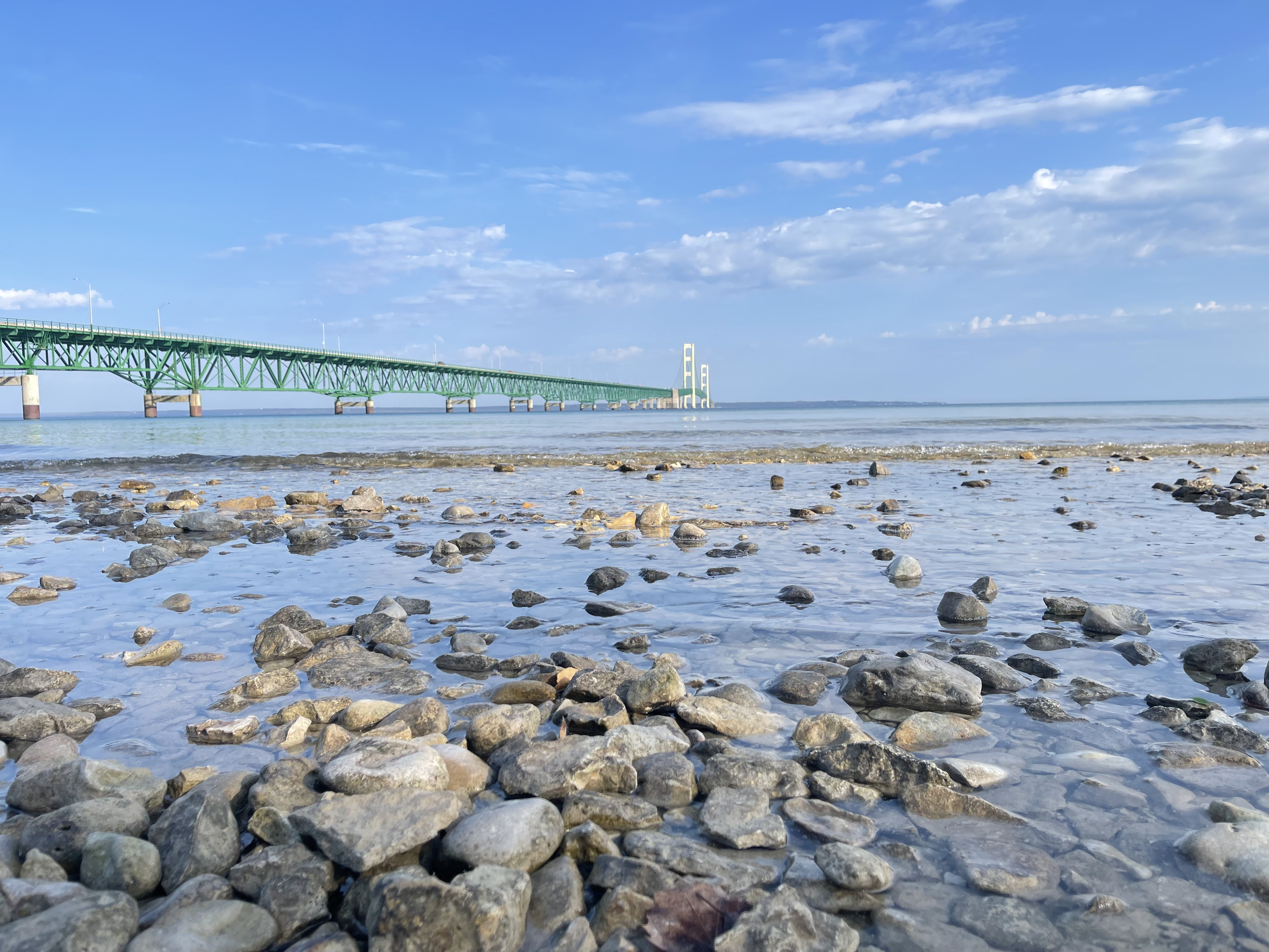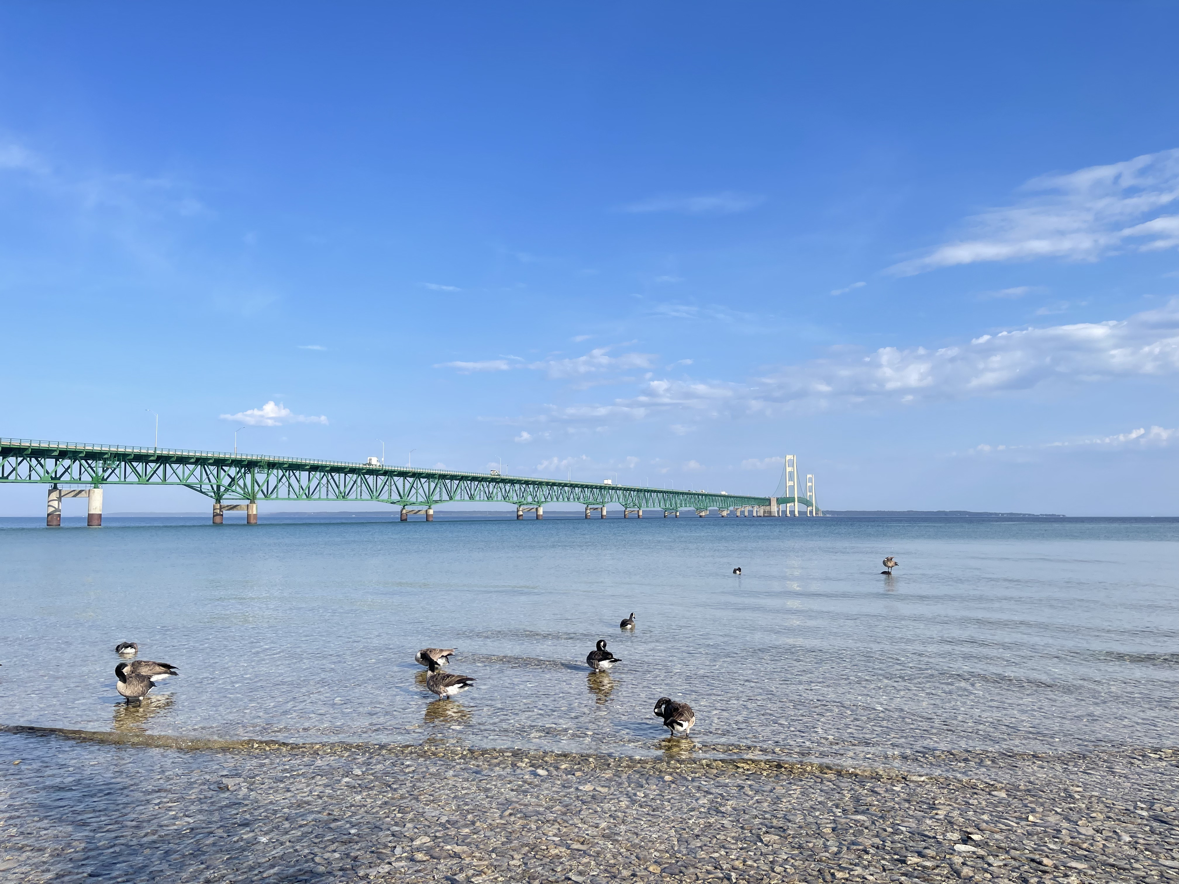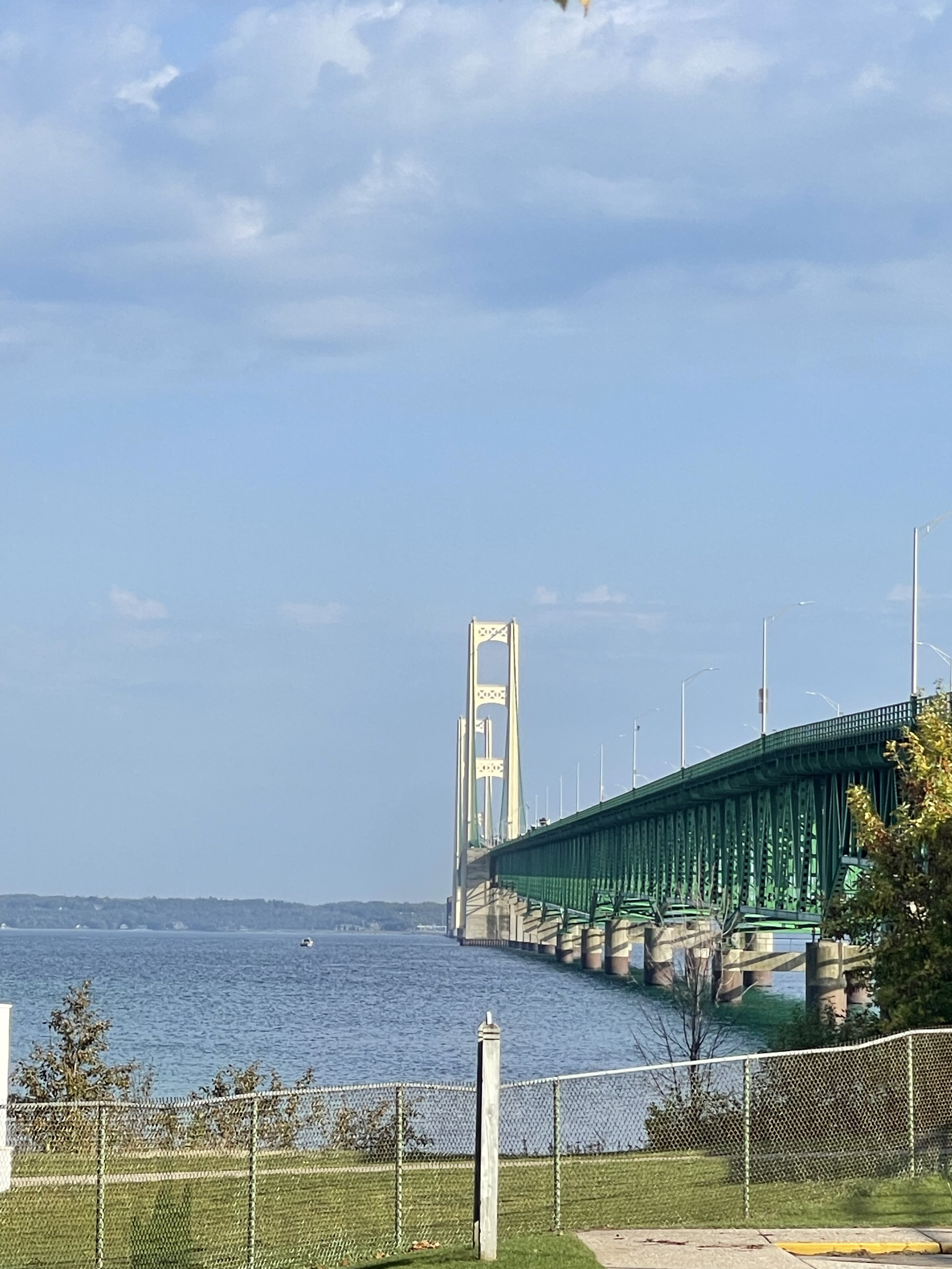 行程最后一天,打卡了正好返程途中的必经的Mackinac Bridge。Mackinac Bridge连接了密歇根州的上半岛和下半岛,横跨麦金诺海峡(Mackinac Straits)。大桥于1957年完成,是一座悬索桥,桥梁的总长度为5英里(约8公里),中间的悬索部分长度约为3800英尺(约1158米)。
