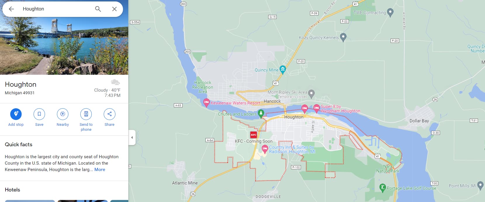 原本计划前往Copper Harbor,欣赏那一路的风景,但因为实在时间紧迫,可能转一圈需要好几个小时,所以便在附近的小镇Houghton短暂停留,还吃了唯一开着的假中餐。