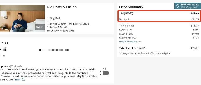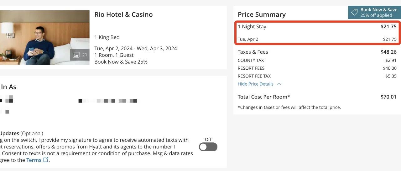 扣除了Resort Fee之后,一晚的税后房价大概是20美元出头,什么意思相信大家应该懂了,而且不要忘记凯悦的2024 Q1季度促销,每三晚回血3000积分;另外Frequent Miler表示Rio Las Vegas会在今年4-6月加入到凯悦新酒店名单里面(每晚可以拿到500积分奖励),这么算下来每三晚到回血有4500凯悦积分,而三晚的入住成本大概是70美元左右,什么意思大家应该懂了吧