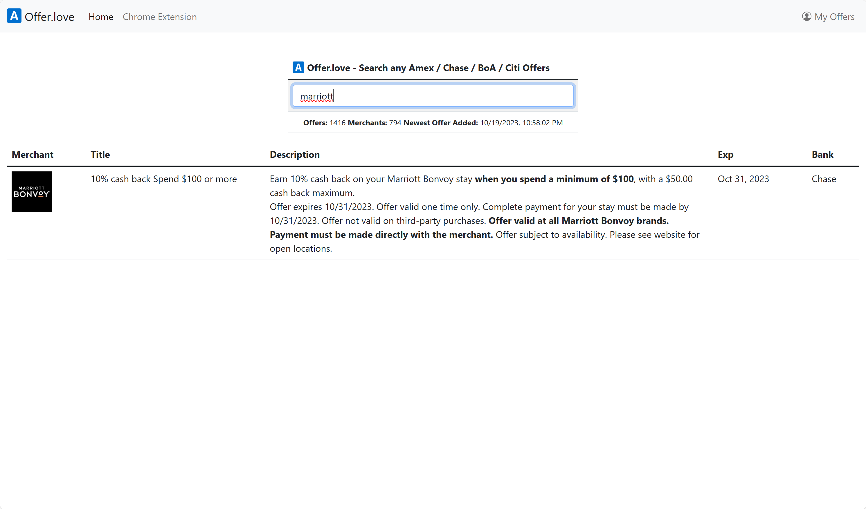 一键搜索所有的信用卡能添加的offer,目前支持四大行Amex, BoA, Chase, Citi。新offer会实时添加到搜索池里面。以后想知道哪个店有没有毛可以撸,直接搜一下就知道了。