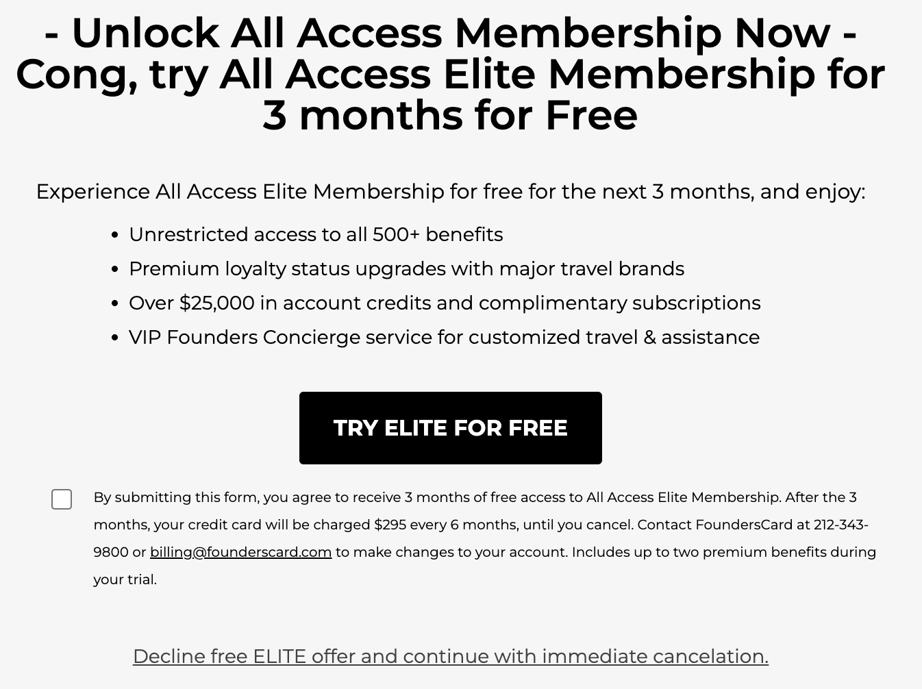 其他比较容易上车的方法就是Founderscard了,很多美国信用卡论坛博主都会吹捧这张会员卡,但总的来说这是个标准的智商税,免费版有各种限制大部分东西都不让用,付费All Access版里一堆东西里能用的上的几乎没几个,其中最有价值的可能就是Caesars Diamond