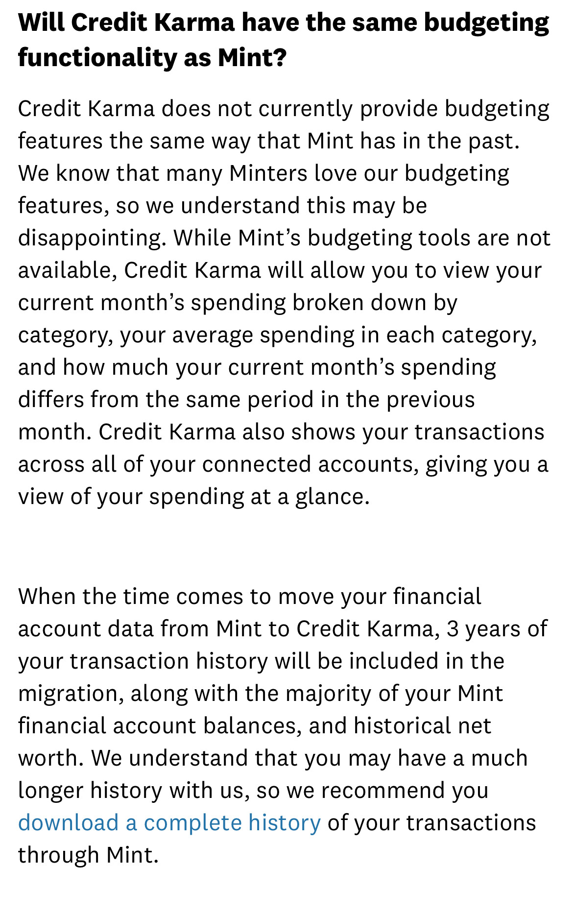 We’re excited to welcome you to Credit Karma. For now, you don’t need to do anything else. In the coming weeks, we’ll let you know, within Mint and email, when it’s time to make the move to Credit Karma.* And in just a few taps, your entire Mint net worth history and up to three years of Mint transactions will come with you.