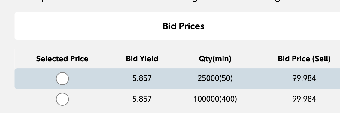 不好意思,我还是没太看懂,我截了一张fidelity图。我现在手是1月23号到期的国债,如果我出售的话,应该看Bid价格对吧(红线)?那他这个里头标的98.851(篮圈)是不是就代表着我如果卖面额为100块钱的一个短期国债能收入98.81?然后想问问最后这个第三方的98.812(黄圈)又代表什么东西?