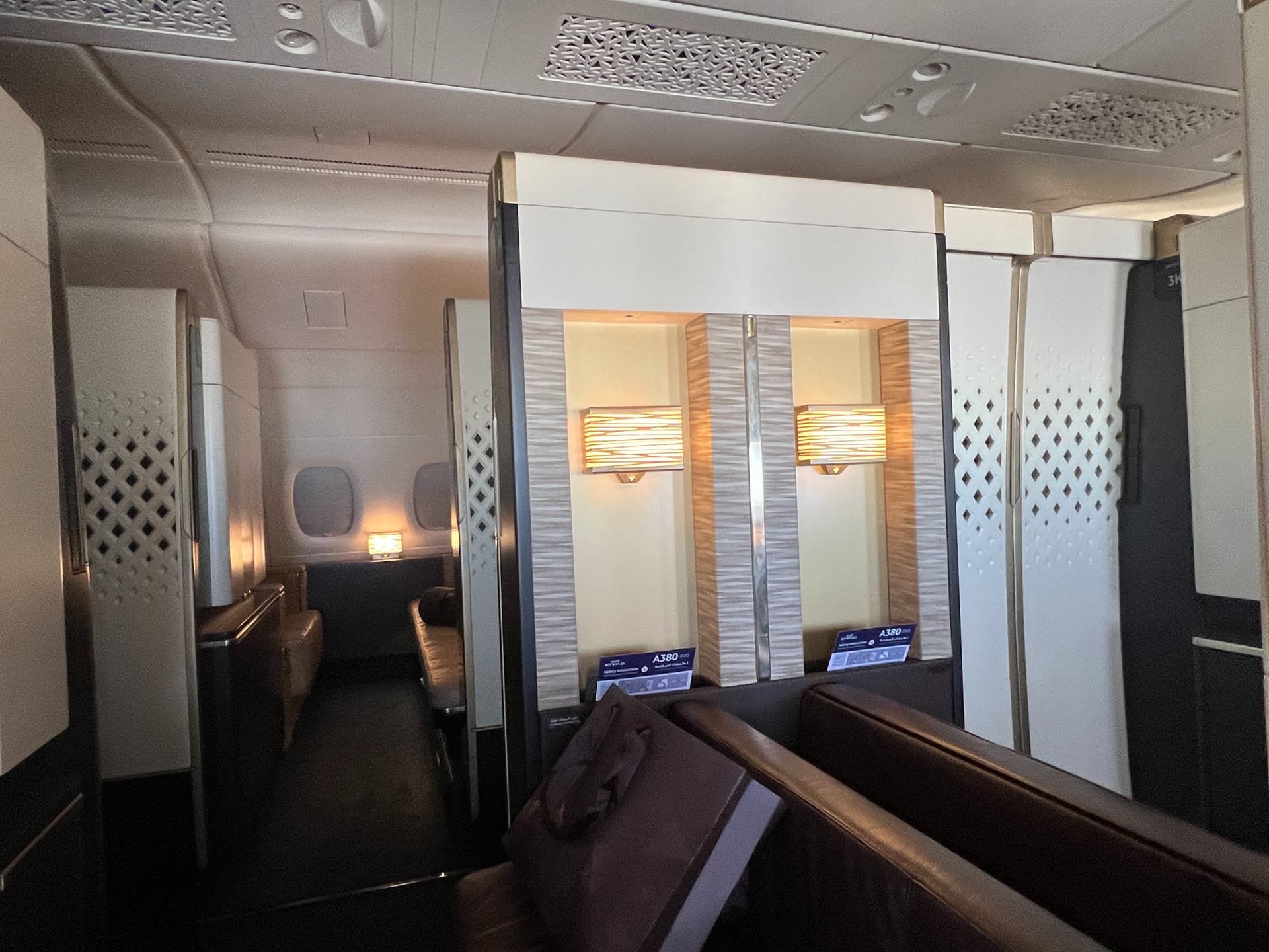 AA/AC都可以出62.5k/65k,第一次坐EY A380,是本次旅行最期待的航班。6/9上座率,residence没人。单独的床睡起来比椅子放平要舒服多。空中淋浴有5分钟时间限制,父母都说不想洗澡,FA都惊呆了 当时特别想问她能不能把父母的时间加过来变15分钟