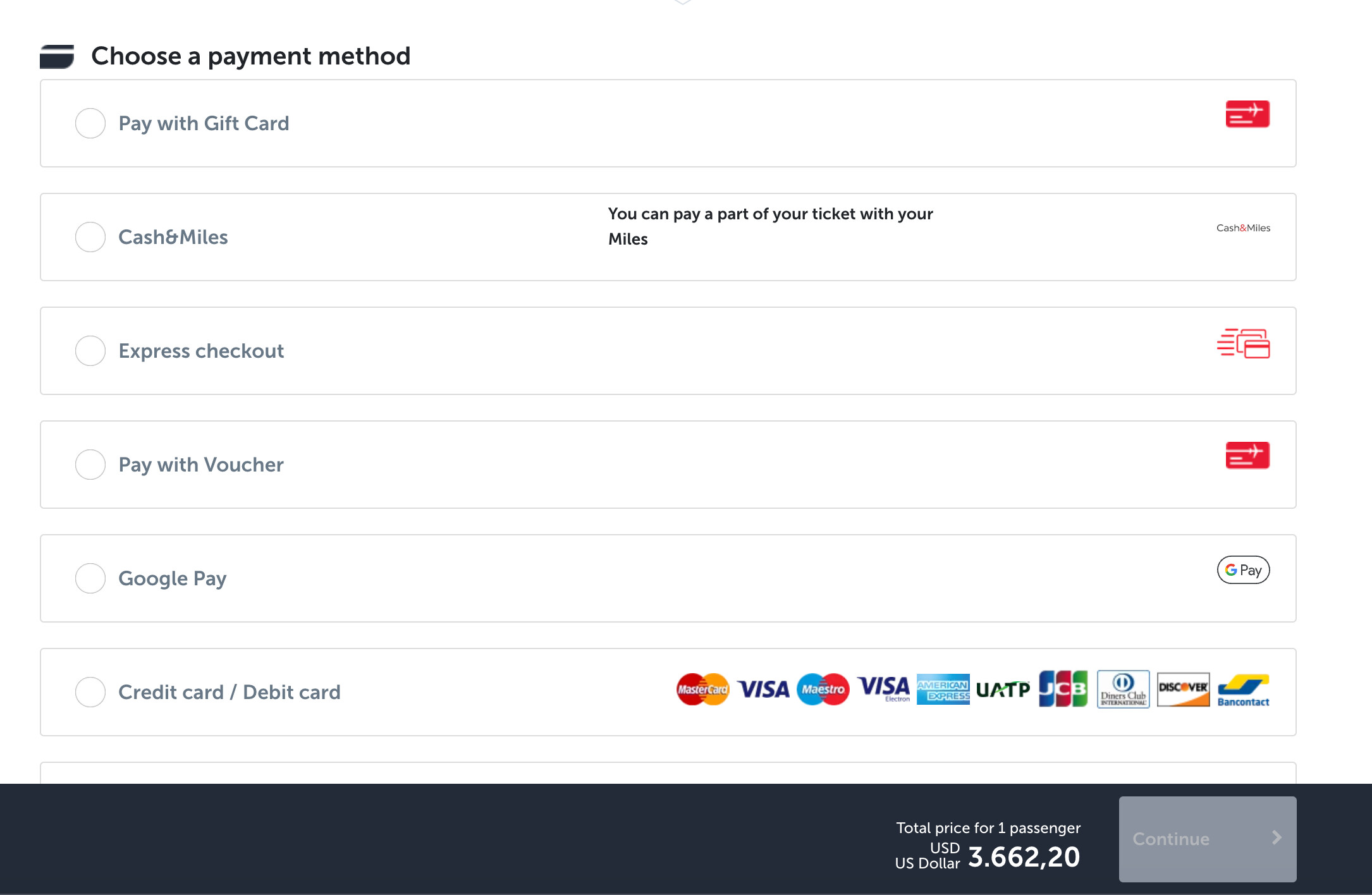 破案了,好像google pay有支付上限,我开始搞的是商务舱,总是没有google pay。然后改成经济舱就看到google pay了
