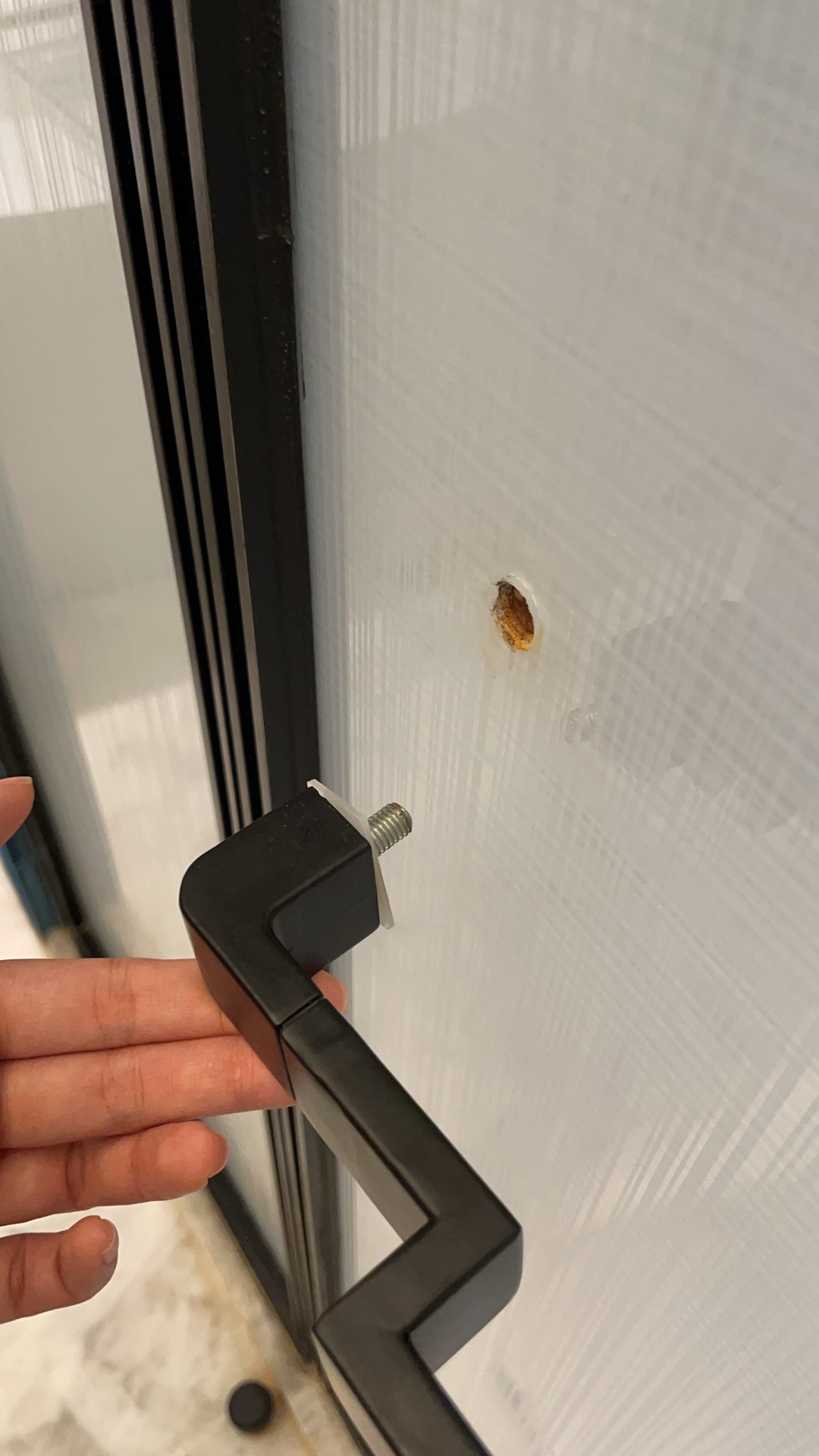 换了之后准备洗澡 结果离谱的事情来了 洗澡把手直接脱落 门上玻璃裂开