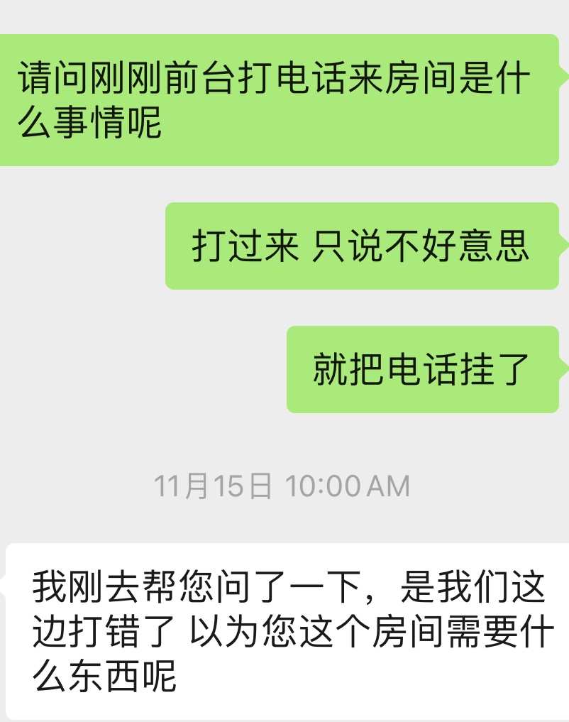 晚上10点 房间电话忽然响了 接起来前台就说 抱歉打错了。我的天 这个真的是非常无法接受 马上问了入住时让我们加微信的前台 给了如下答复