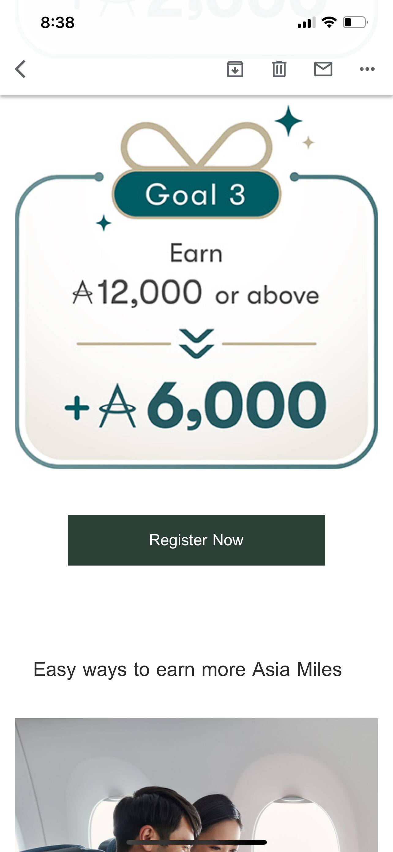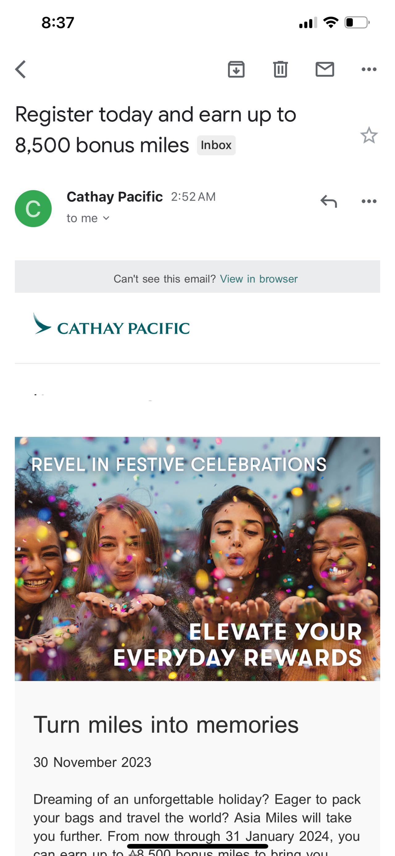 今天收到Asia miles的邮件,发现了一个还不错的活动,完成三次活动就能得到最高8500的miles,需要注册.