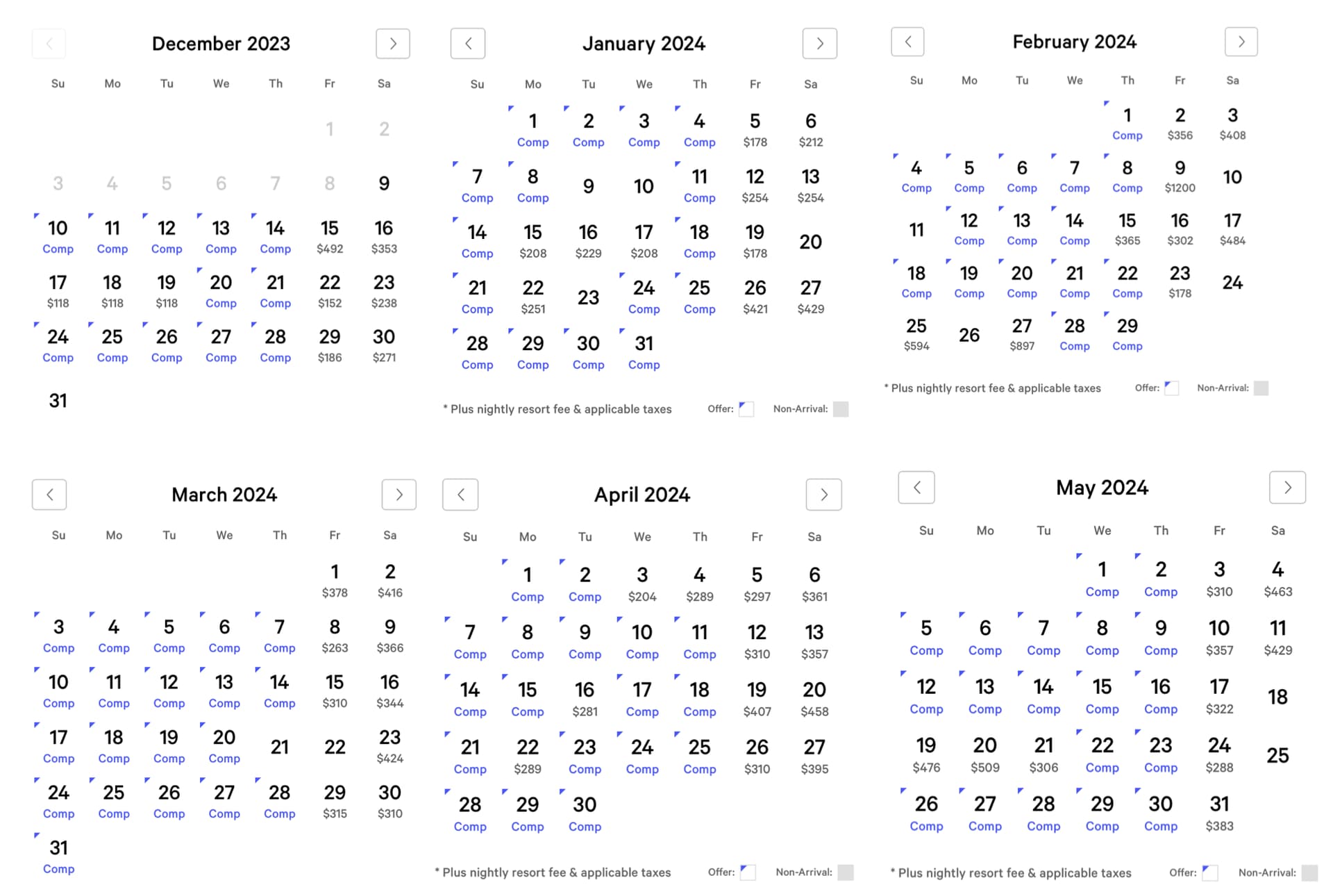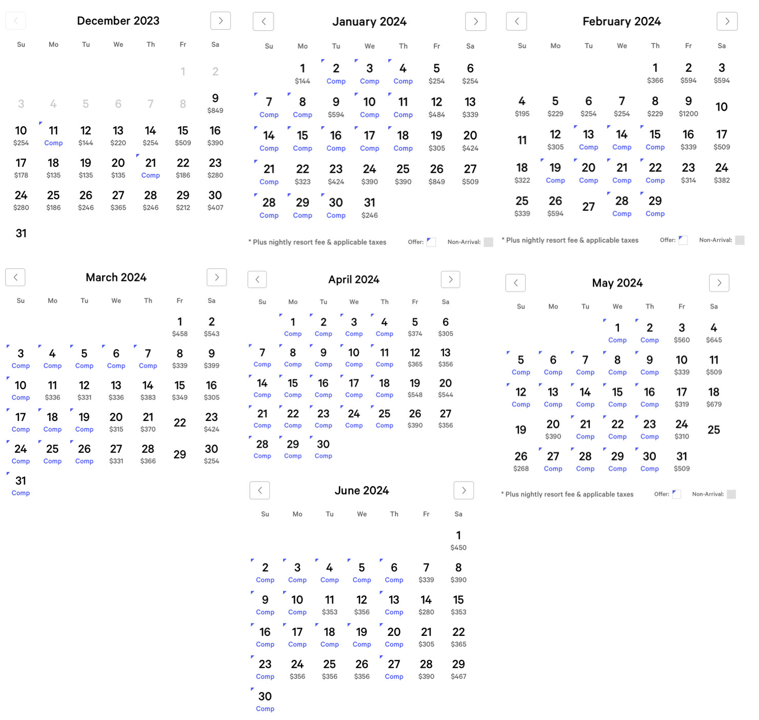 A:除了blackout日期(基本都是各种event)以外没有限制,查看blackout的日期方法是兑换Comp stay然后点击邮件里的link就可以看到calendar,这里分享一下Aria和bellagio的calendar(availability随时可能变),reddit和各种网站也有分享