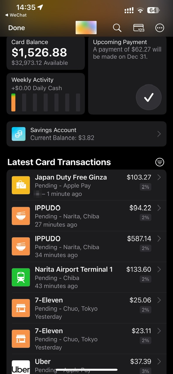 所以最终大部分开支居然都是这张卡负责了,老实说最佳时候,用最佳的卡其实不是问题,但是在特殊环境下,Apple Card 确实堪用,临时加卡时没有额外的验证需求,无 FTF,2% cb,甚至 cb 本身丢在苹果还有 4.1% 利息,而且作为抽屉卡,年费没有, App 看账单,看消费做的直观方便,其实也还行。