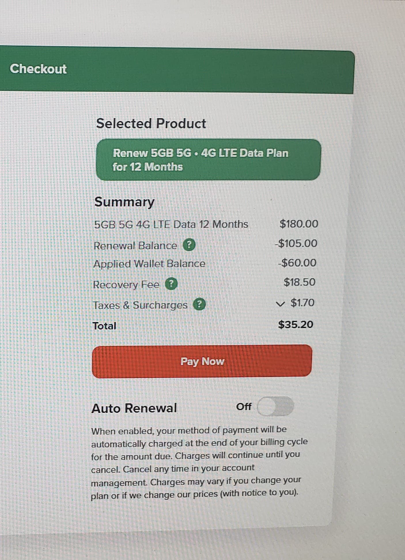 跟着谈心教程和客服聊了四十几分钟,5g一年的套餐,先是offer 1 month free($15 off),然后2月free,然后3月free,最后4个月free,然后给我钱包冲了60刀,最后我钱包实际付了90块,相当于一个月$7.5。所以其实recovery fee和tax加起来一共占了$30。我充值钱包的额外成本因为50刀大法基本为$0。泥潭太6了!