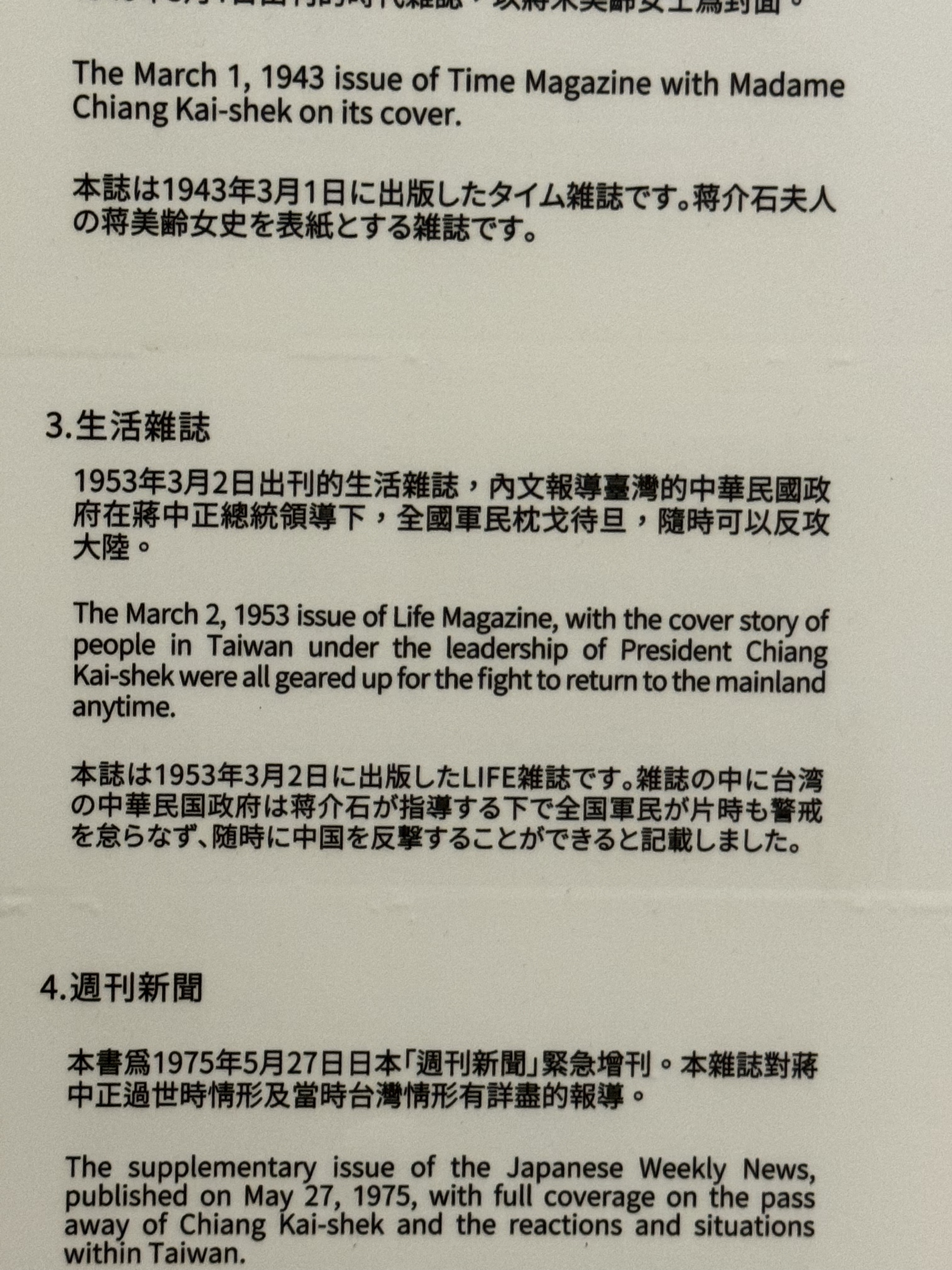 一楼便是关于先总统的常设展览,很有意思的是左手边是纪念展,右手边是台湾的民主化之路,对比下来挺有意思的,也会对台湾人民的诉求有更深刻的理解,毕竟老蒋干的畜生事简直罄竹难书。