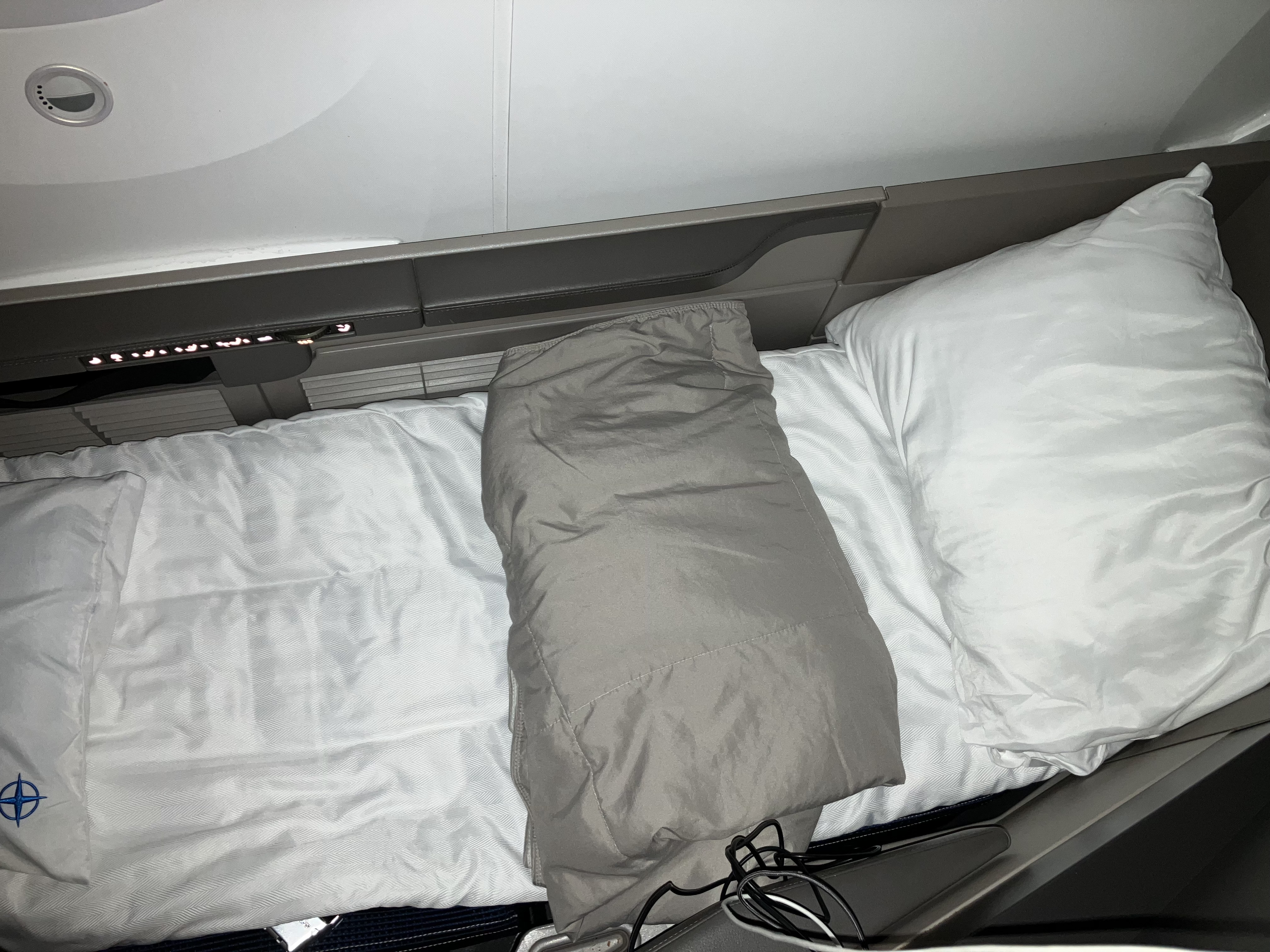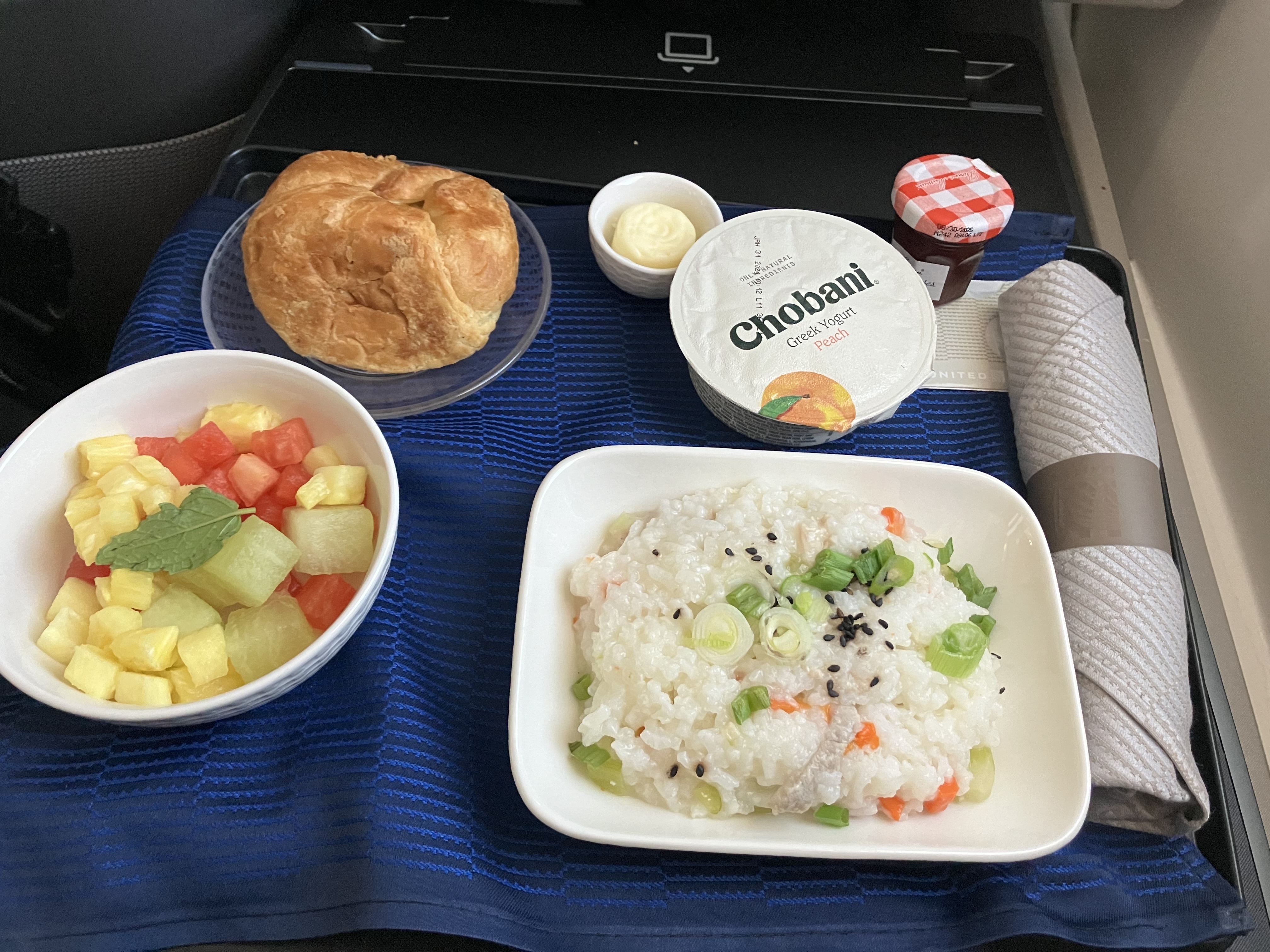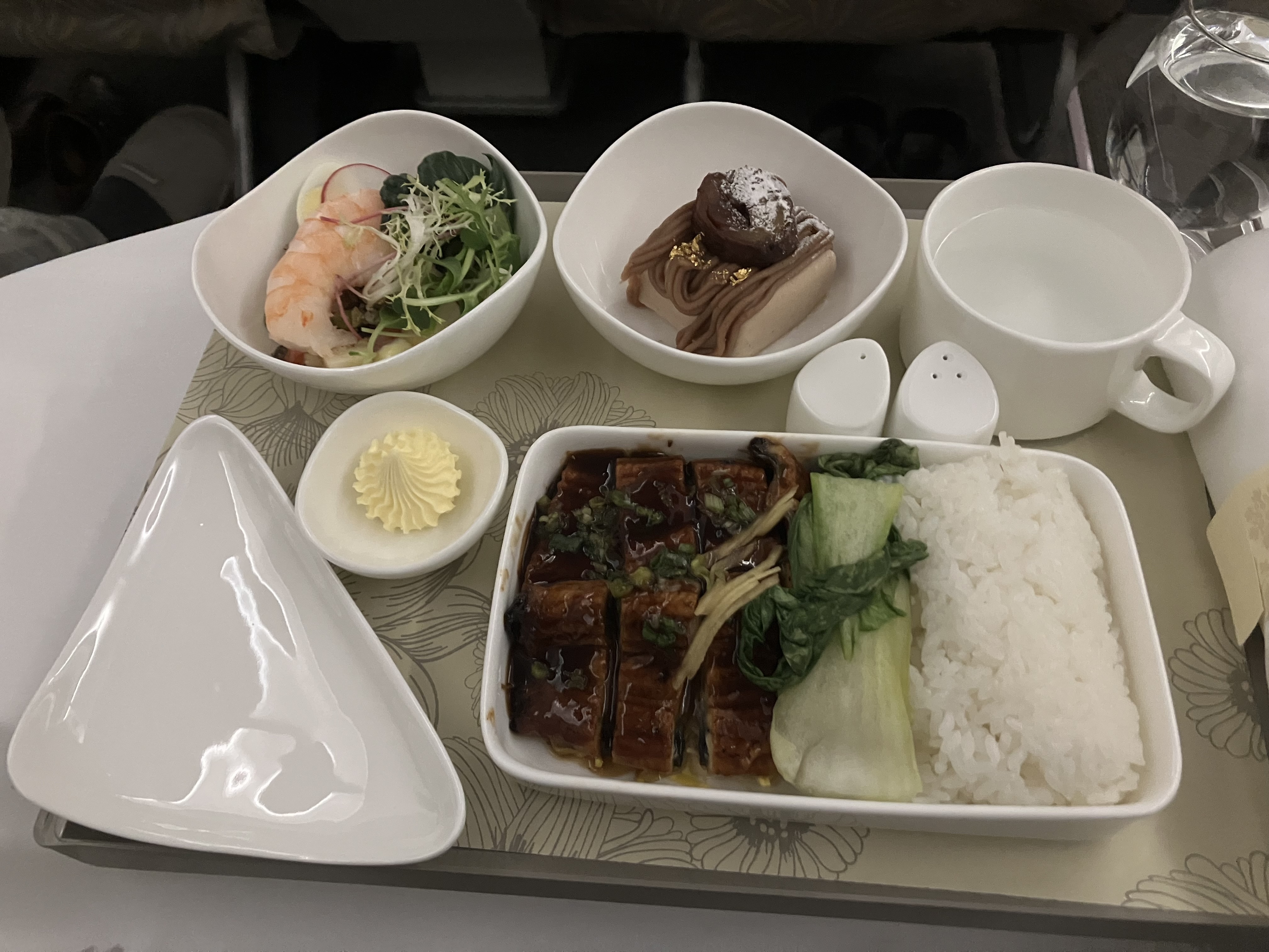 缺点自然是设备,机型看着像老旧的A322,大板凳商务舱,备品是韩亚长途经济舱那种毯子和枕头,于是UA的枕头被子再次登场。优点也很明显,空乘态度特别好,没事儿就来欢迎一下,问有什么需要。经过UA鞭打对飞机餐食抱着可有可无的心态,结果菜单上来一眼发现了照烧鳗鱼饭。味道虽然不比正经日餐的鳗鱼饭,但已经不亚于日本超市熟食部能买到的了,瞬间觉得大板凳也能接受。