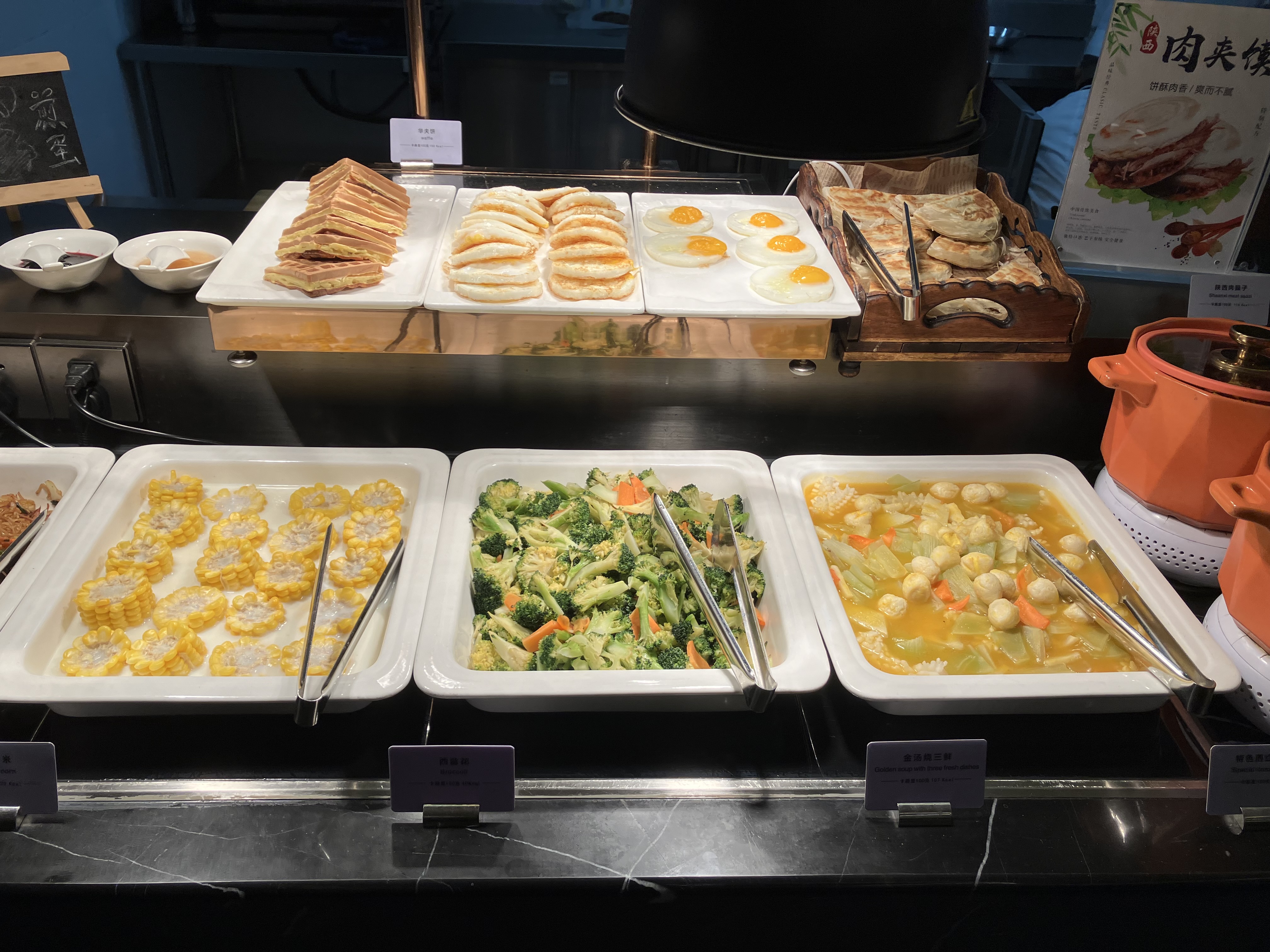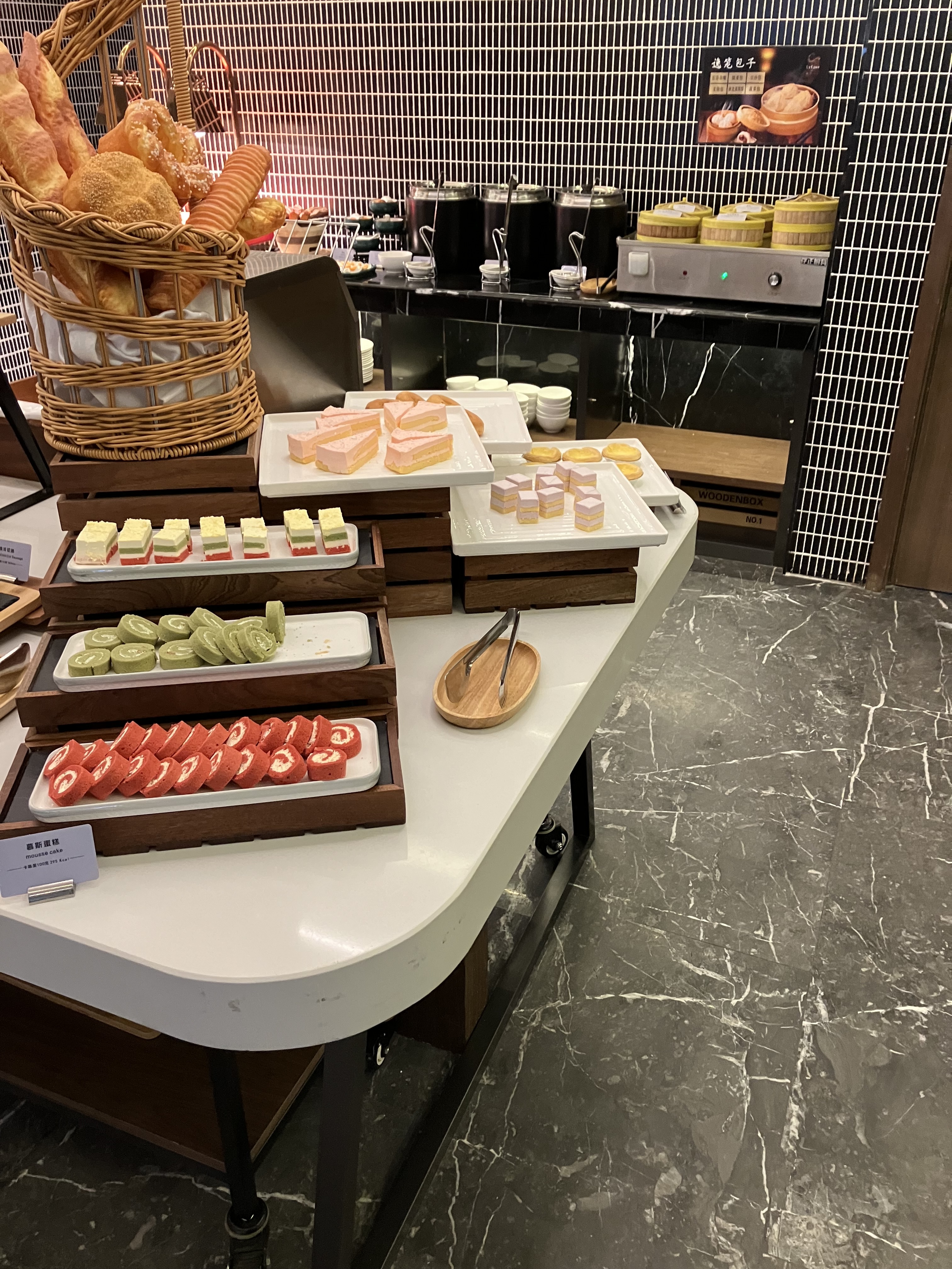 非球客,早餐是开业特惠赠送的,如果付费大概率不会在这吃。早餐样式大致中规中矩,基础选择和逸扉差不多——油条豆浆,肉夹馍,荤素包子,几样粥,几样热菜,各式蛋,水果,鲜榨果汁,西餐点心冷肉什么的。