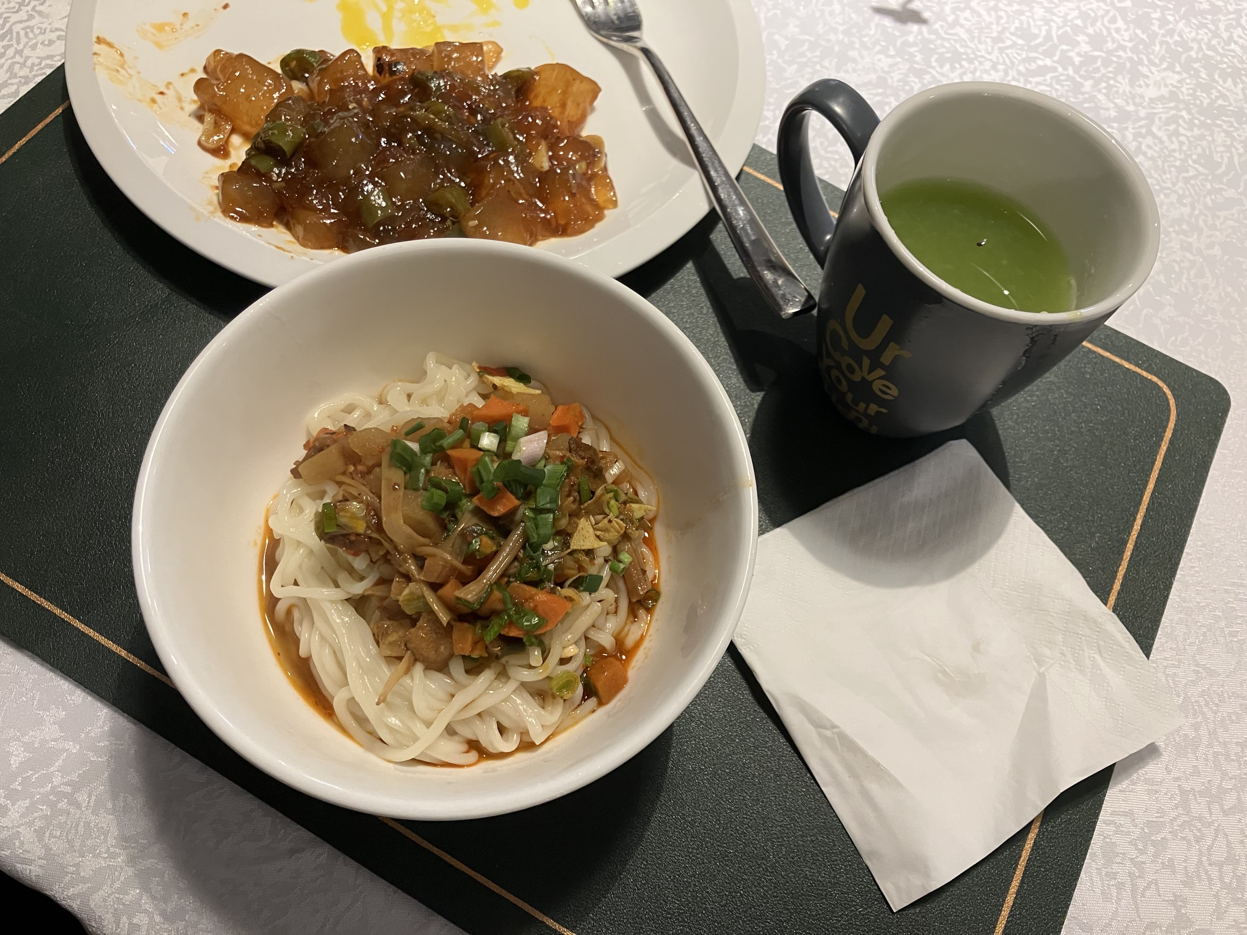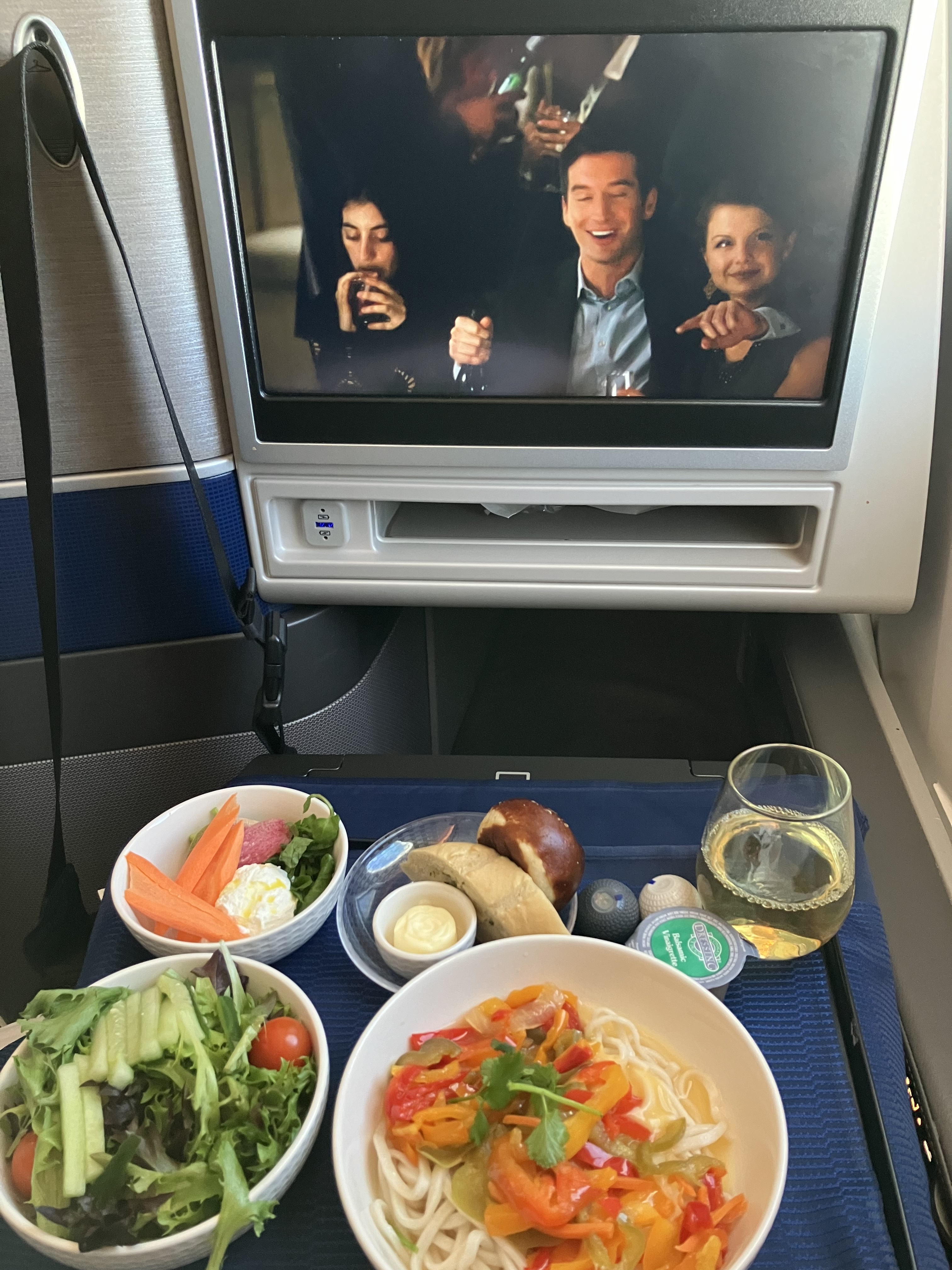 对我来说商务舱最大的吸引力还是躺,单从这点来说UA不错的,床垫体感极好,床品也很舒服。至于饭,一早就没抱太大期望,本着素食比较不容易踩雷点了蔬菜乌冬面。果然正餐上来实至名归,面条只能说勉强可以入口,萝卜片乍一看以为炸成了酥片,想多了,原汁原味的辛辣生萝卜。