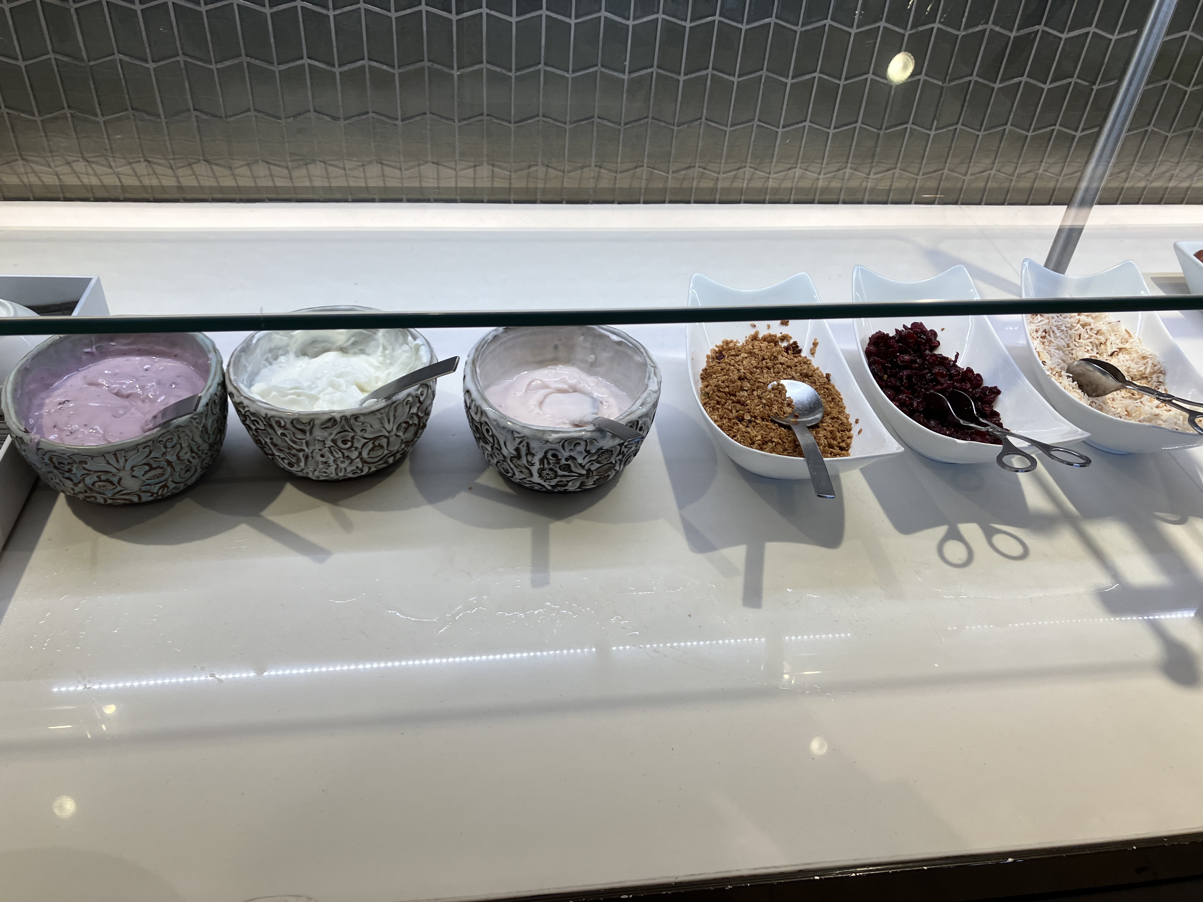 上回在Polaris Lounge尝到一款很好吃的fraiche,这次满怀期望进去结果遇上连大车店都不如的早餐,煎蛋和香肠干到没眼看,唯有草莓酸奶口感正常。上午的就餐区人流不少,遗憾的是waitlist太长仍然没体验到Dining Room。淋浴间倒是不错。
