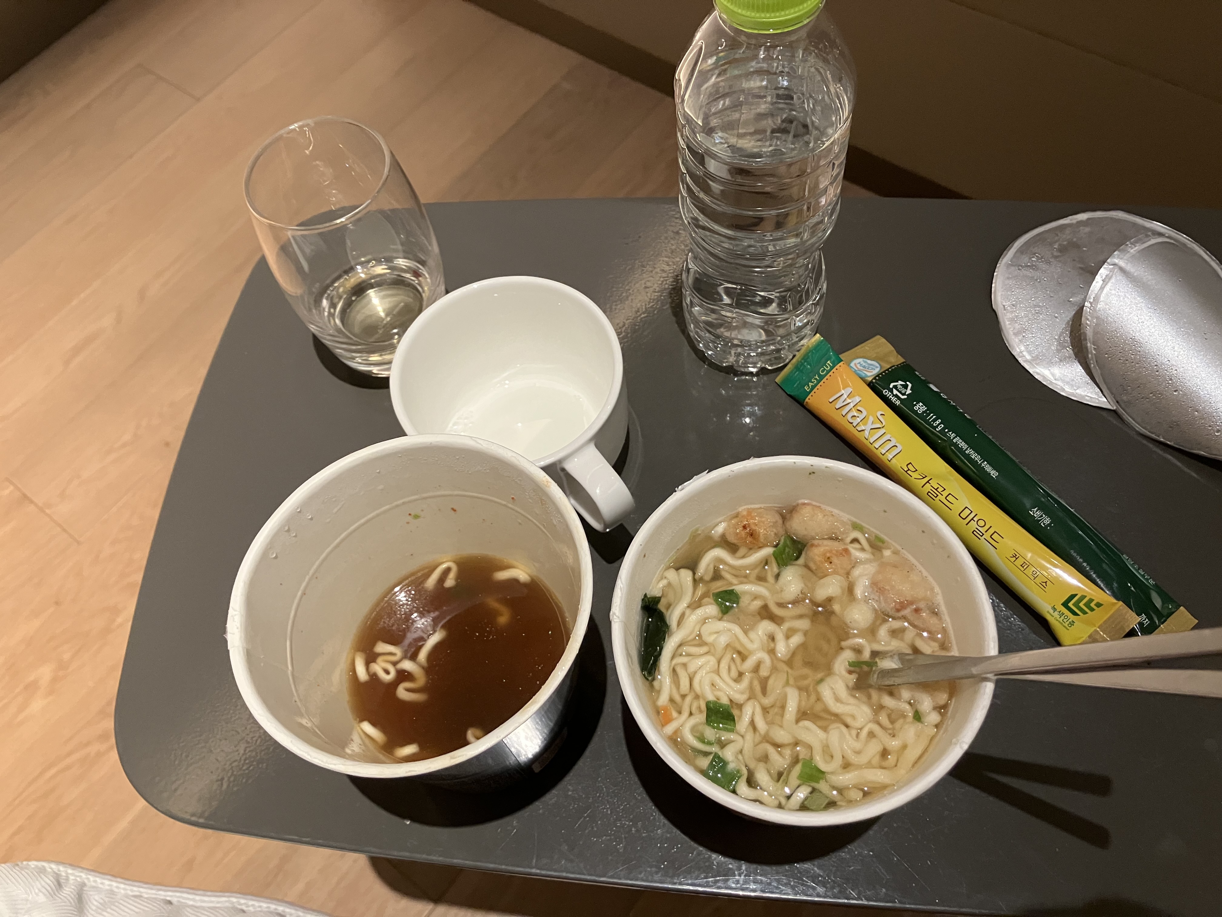韩亚休息室的餐食那就不可同日而语了,可惜担心肠胃最终还是没碰一看就炸得酥脆的韩国炸鸡。临上飞机前吃了碗泡面,被口味惊艳到了,二话不说又泡了一碗。