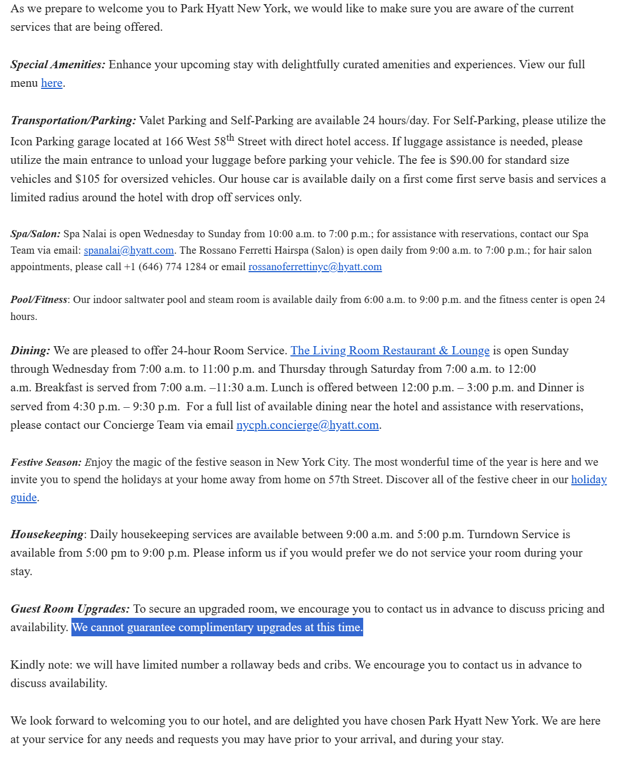 作为尊贵的Globalist,订了跨年Dec 31-Jan 1纽约柏悦积分房。 刚收到PH NYC的问候。其中明目张胆地提到 Guest Room Upgrades: To secure an upgraded room, we encourage you to contact us in advance to discuss pricing and availability. We cannot guarantee complimentary upgrades at this time.