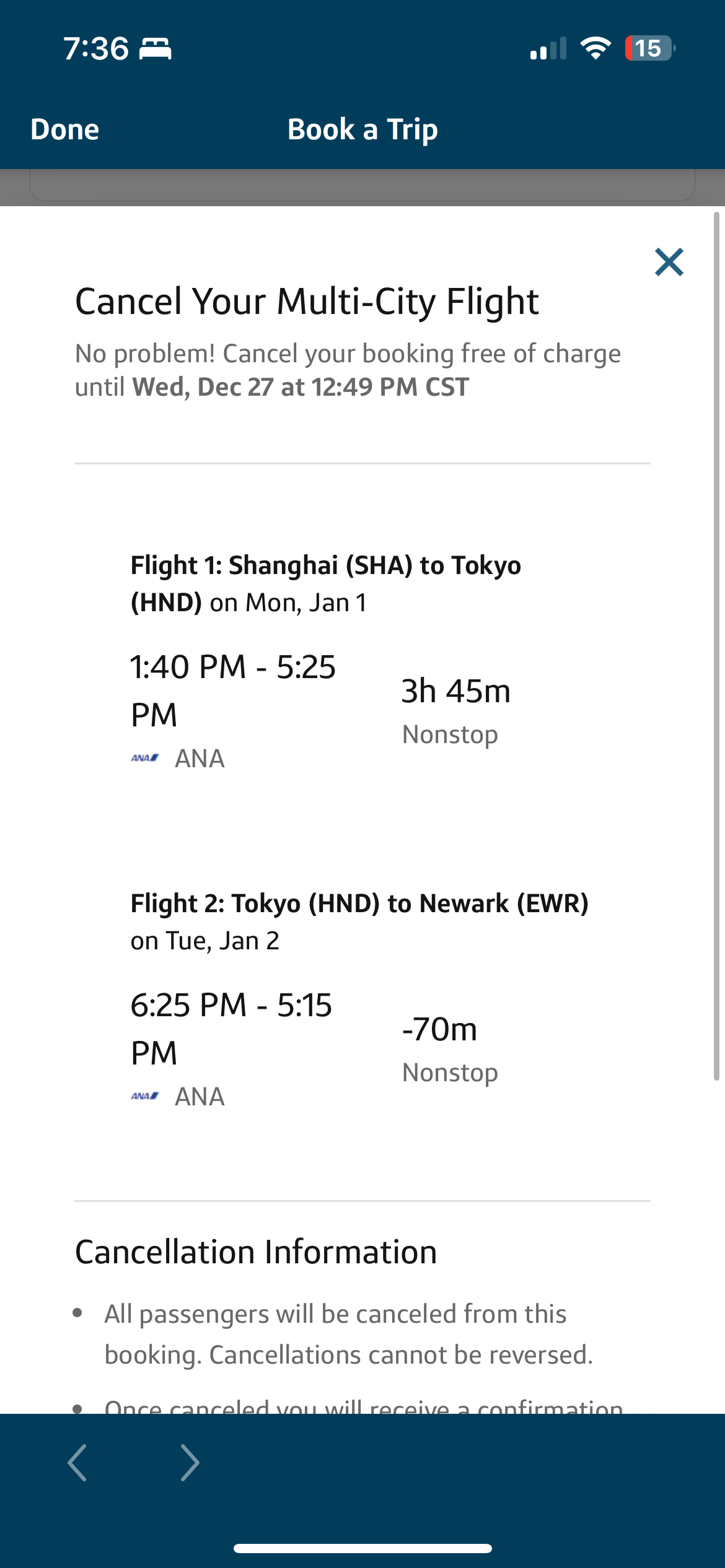 第二个DP(对,300刀还是没花出去,继续买)是美国东部时间12月23日晚买了1月1日回美的票,在日本停留一天,现金900多刀一个人。今天试着点了下取消,显示可以在27日中午前免费取消。