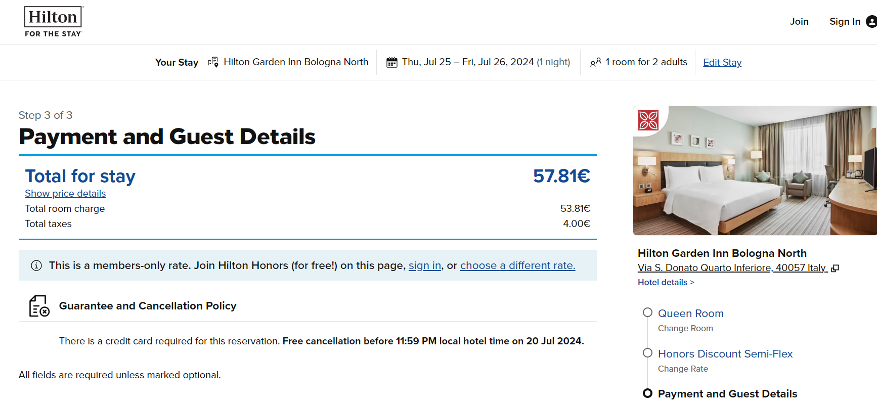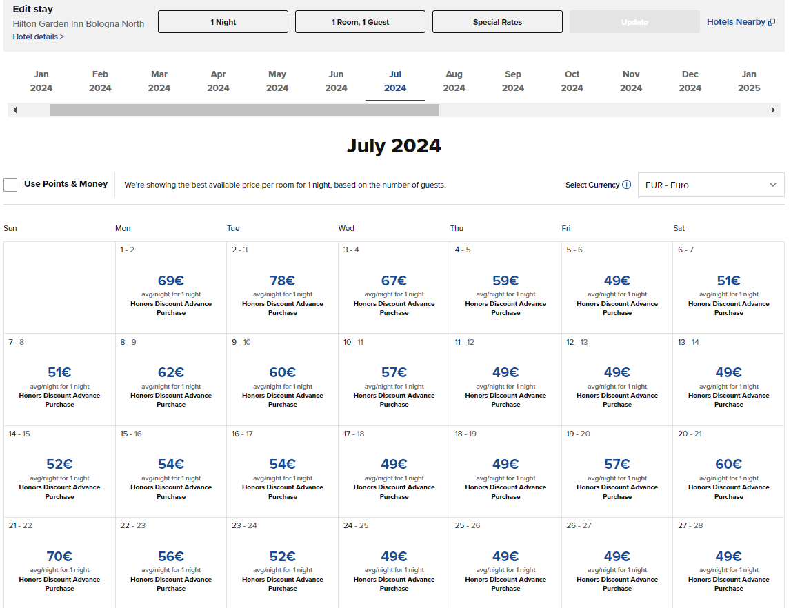 查了一下,整个意大利在7月份没有低于100欧的。夏天<60欧能住希尔顿,这在全欧洲都是白菜价,个人猜测可能是bug。博洛尼亚是交通枢纽城市,有高铁也有很多慢车通往周边城市,交通非常方便,这个价位住不了吃亏,水钻包早餐,如果想夏天去意大利可以在这里住一个星期,每天打卡其他城市。