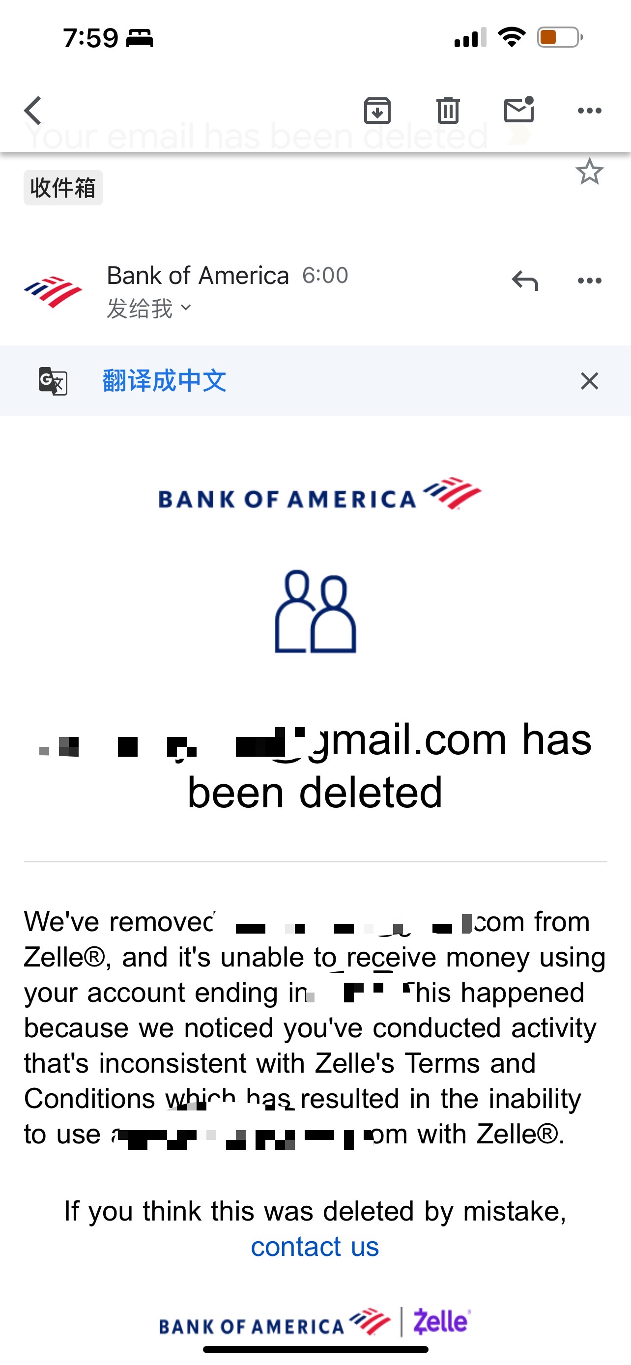 然后最后一笔到账的时候,过了几分钟,收到邮件说我的邮箱被zelle删除了。