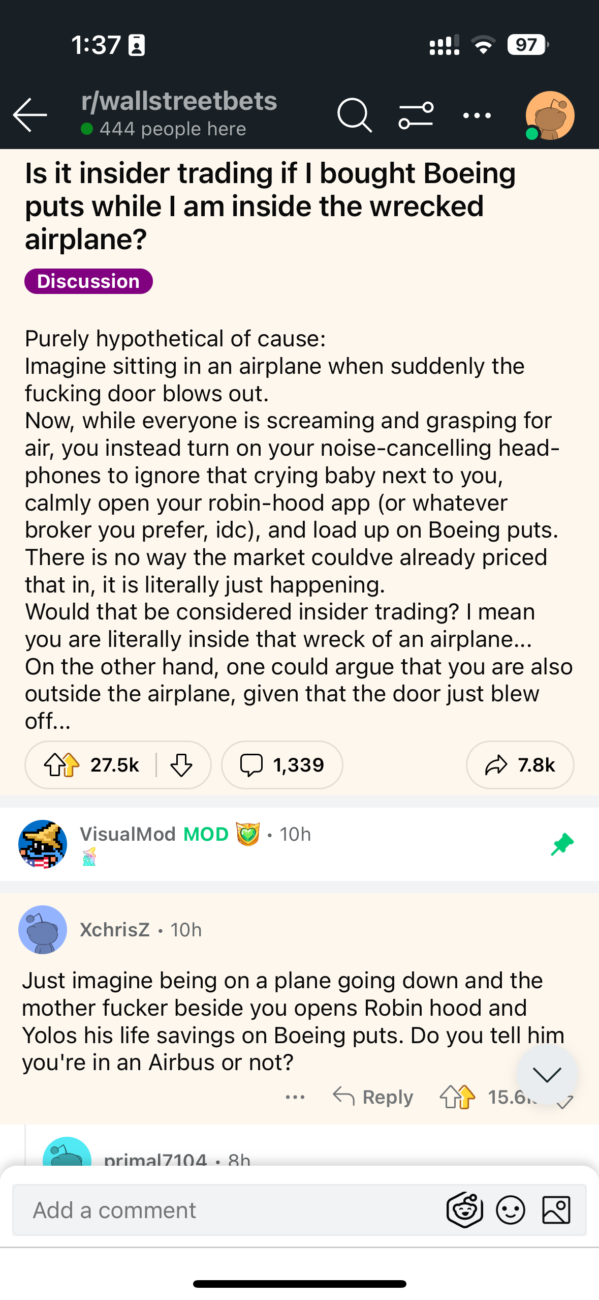 这边也建议换飞机哦。实在不能换记得连好wi-fi,打开券商app填好做空期权order,眼看飞机不对劲就火速下单赚一笔大的。