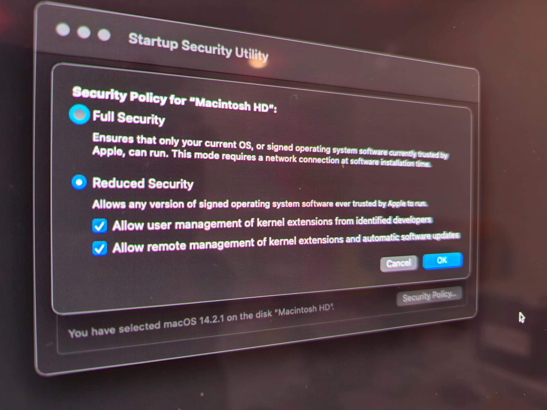 - 再重启进入recovery mode, 找到utilities → startup security utility → reduced security (disclaimer: 此处应自己决定是否能接受added risks)