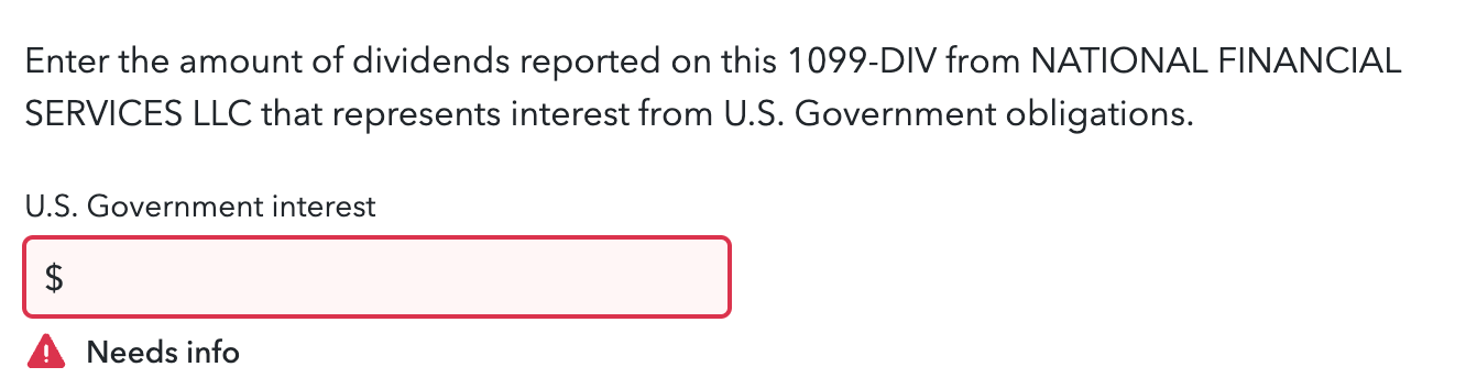 Enter the amount of dividends reported on this 1099-DIV from NATIONAL FINANCIAL SERVICES LLC that represents interest from U.S. Government obligations.