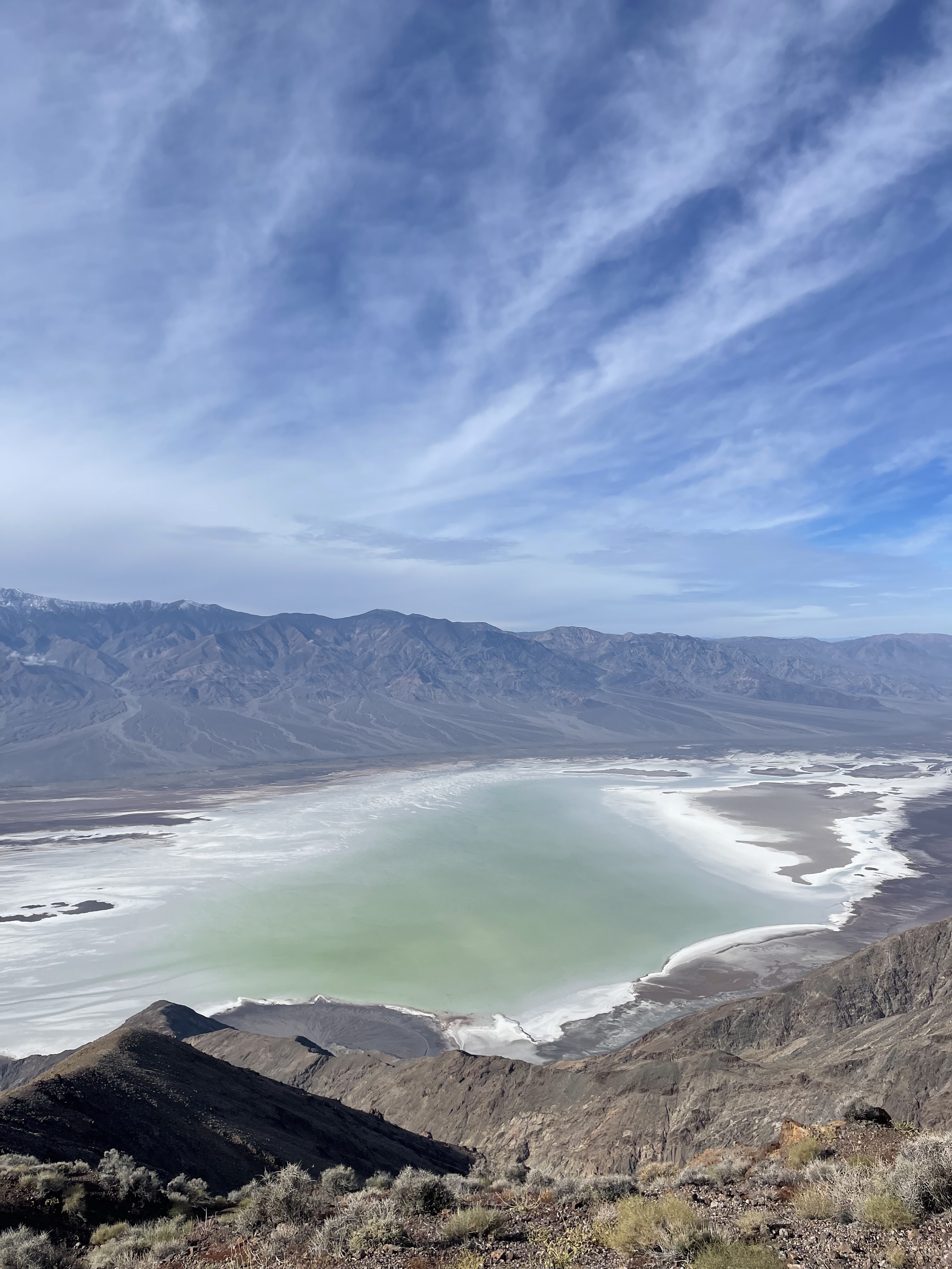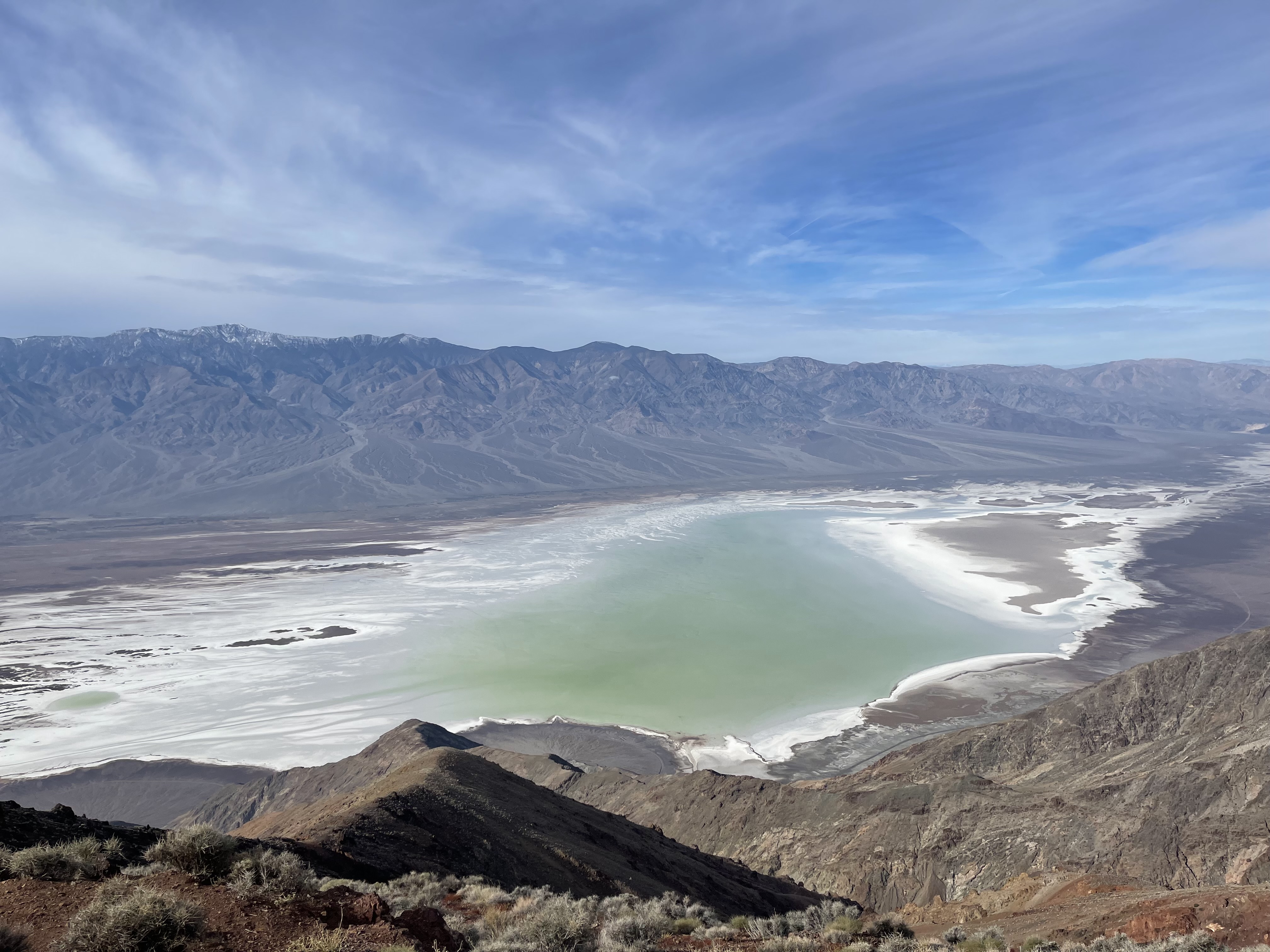Dante’s View虽然和Badwater Basin在地图上看起来非常近,但是海拔相差很大,Dante’s View实际上是在山上俯瞰Badwater Basin的观景点。第一站从这里开始俯瞰Badwater Basin的盐湖。上午天气不错,从山上望去在白色结晶盐中的盐湖泛着青绿色。在Dante’s View没有徒步需求,把车停在停车场走两步就可以获得非常开阔的视野。