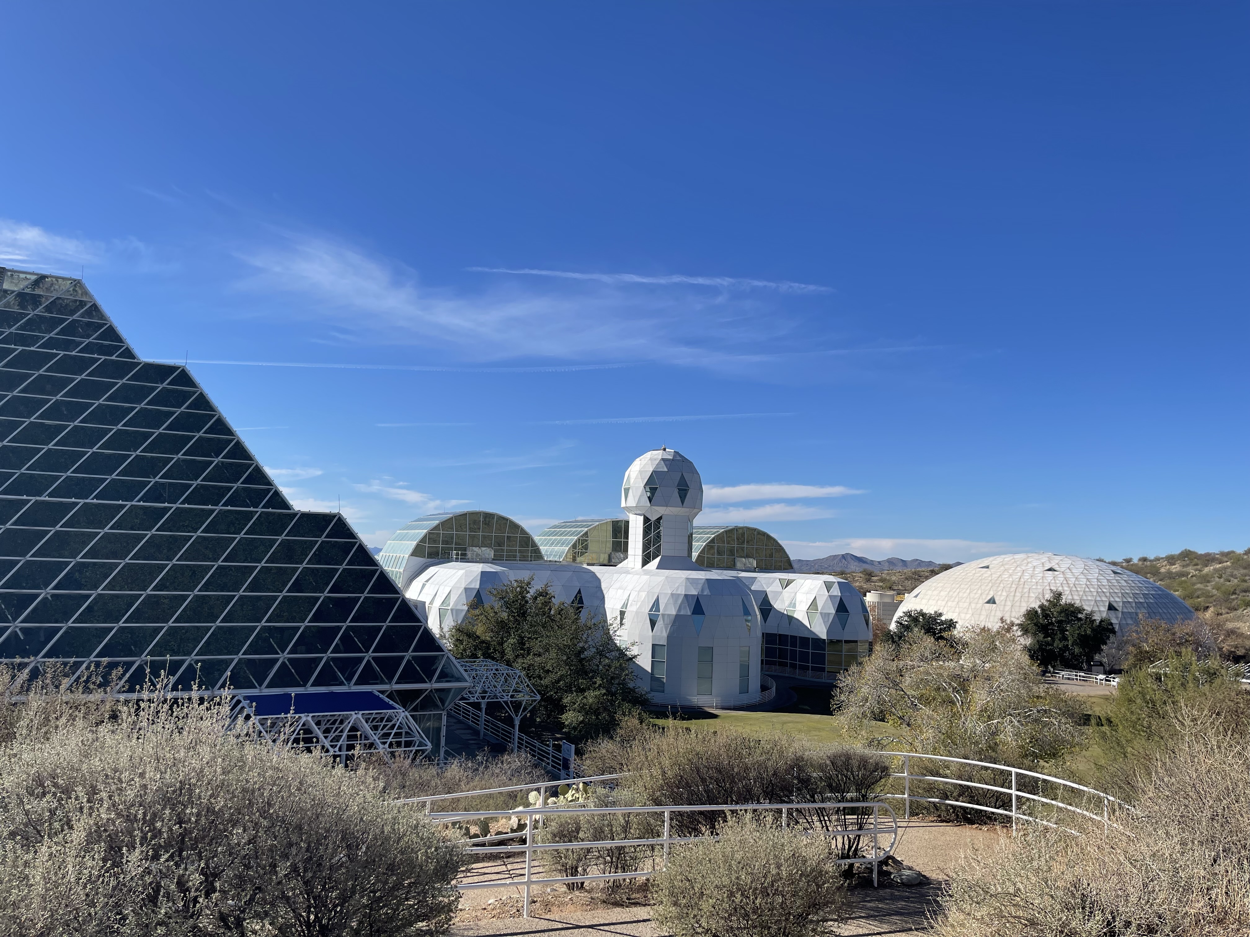 在看过地理课本上的大峡谷之后,在Tucson的第一站便是生物课本上的Biosphere 2。作为曾经当年度生物竞赛全省1200多名的本人向往这个当时影响力不比曾经登月计划现在登陆火星计划低的实验场地也是有一段时间了。在接受私人资金资助建立,经历了1991和1994年两次实验失败,辗转了Columbia University的管理之后,现在Biosphere 2由University of Arizona全权管理运营,在开放给大众的同时也作为科研平台使用。