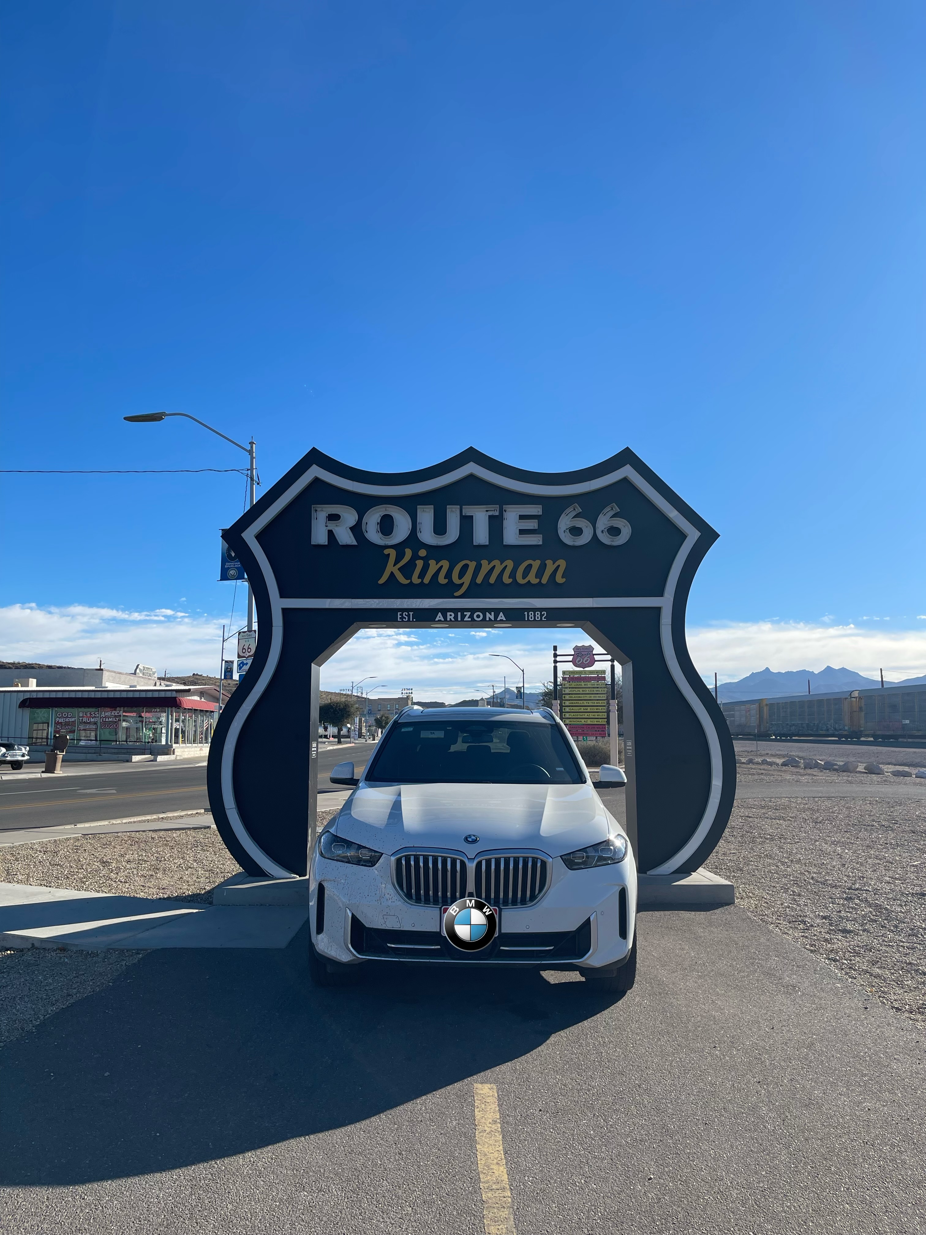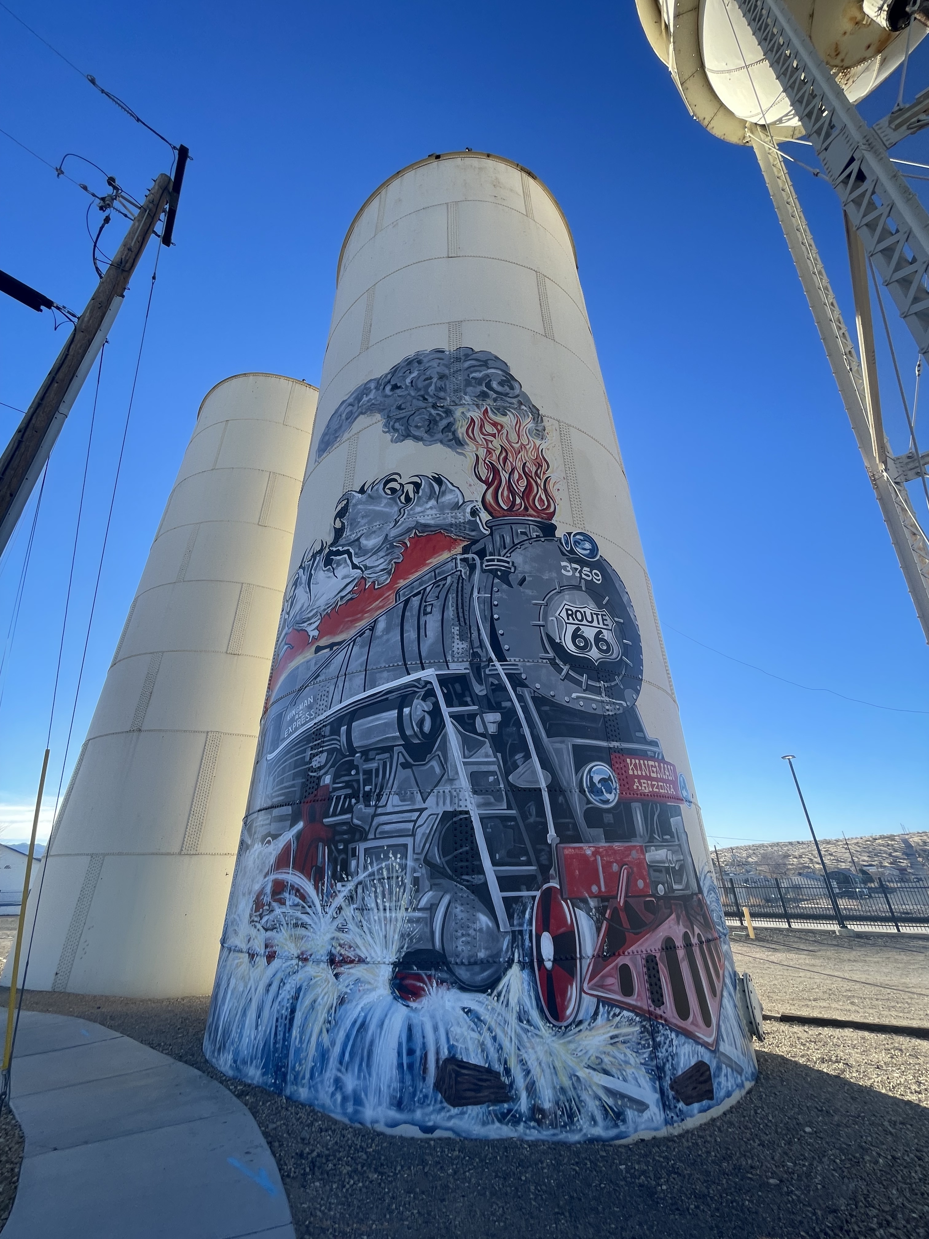 和Flagstaff类似,Kingman也是一座位于Route 66和Southwest Chief铁路上的城市。于是早上在回Vegas的路上先去Kingman的visitor center停留了一下。相比于Flagstaff还算有所节制的把Route 66的标志印在Visitor Center的地上,Kingman就是毫不掩饰来自于Route 66的自豪,在水塔上画着,在铁路旁立着。Visitor Center门口还有一块巨大的Route 66的路牌可以把车开进去合影。