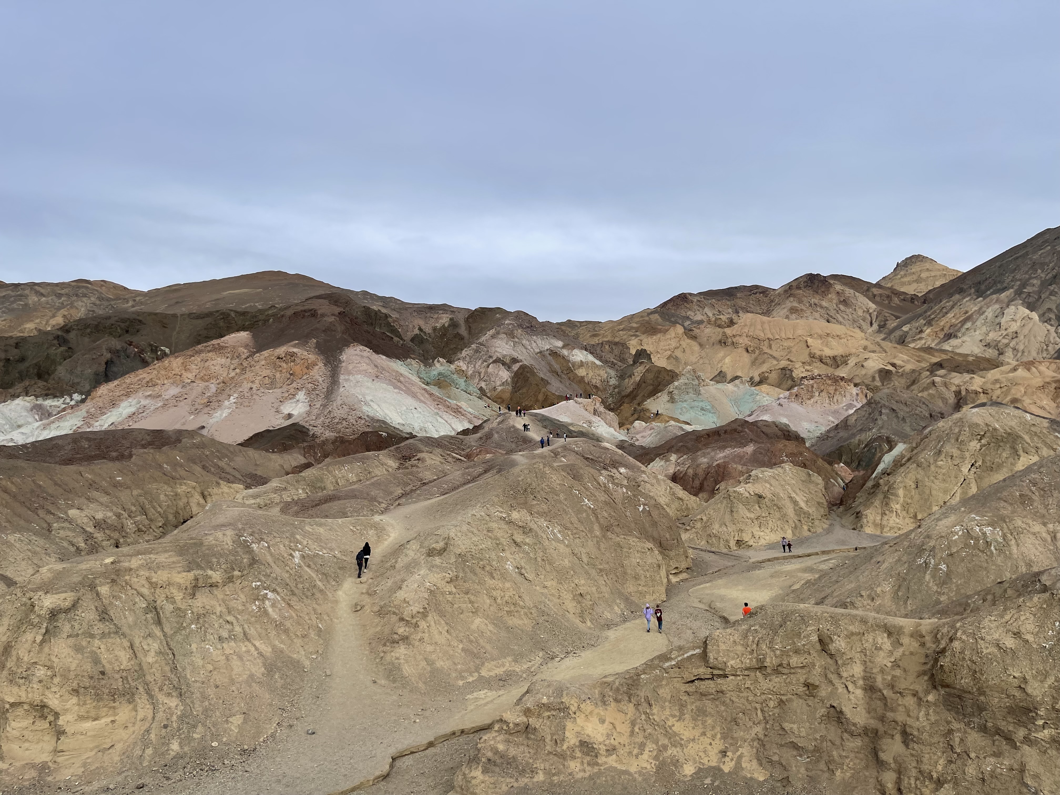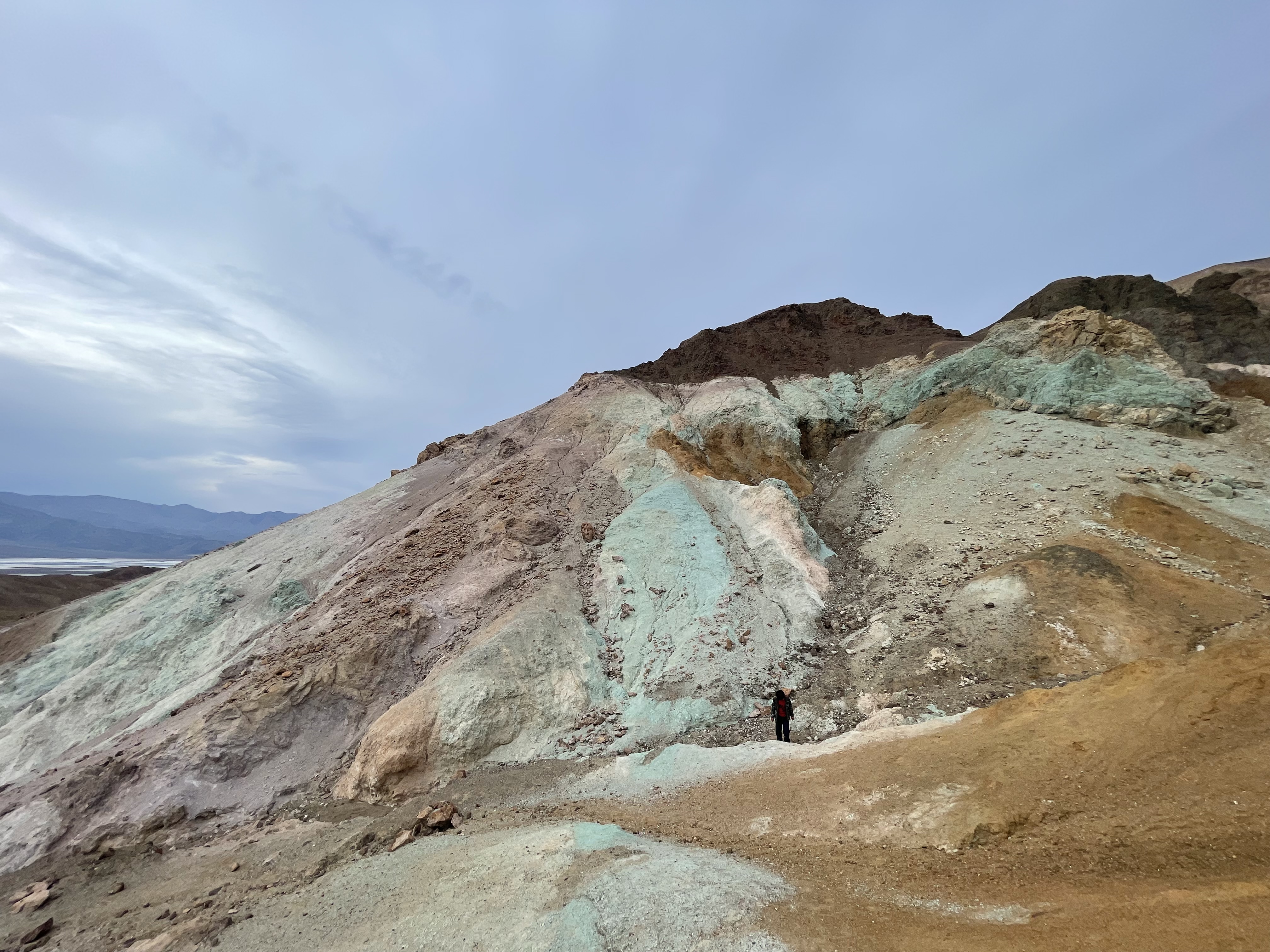 到调色盘的时候天更阴了,所以颜色没有晴天这么丰富。主要能看到的颜色是粉绿色和紫色,可以沿着Trail走近观察颜色。通向Artists Palette的道路Artists Drive loop是单行loop,因此留意好路口千万别错过了。有趣的是绿色的来源其实是亚氯酸盐而非大部分人猜测的铜和铁。