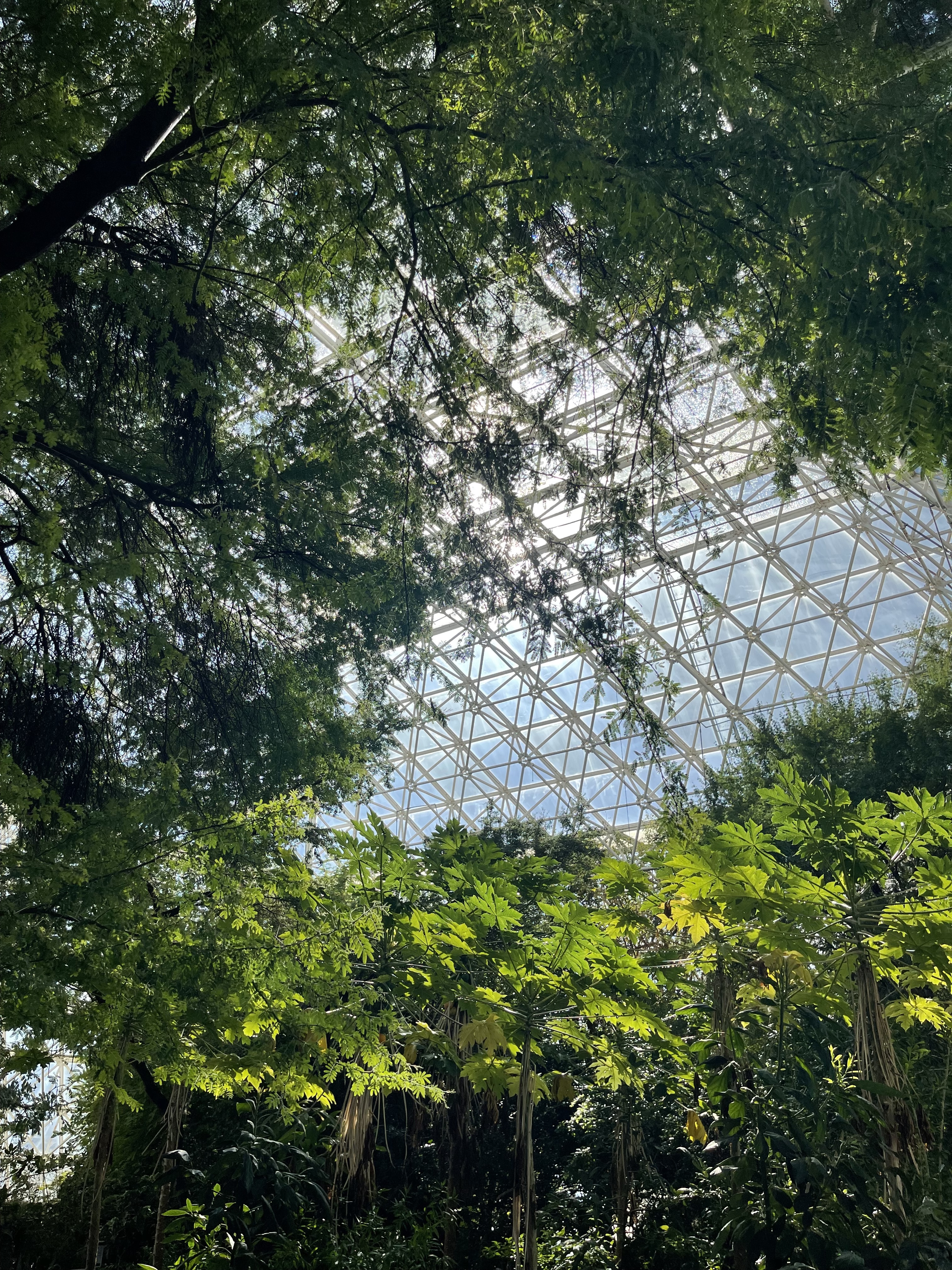 从Tucson到Biosphere 2路途大约一小时,而贴心的园方也早就在Spotify上准备了一个大约一小时的Podcast,由当时参与实验的科学家讲述一些当时实验时发生的故事供游客路上听。目前在Biosphere 2主体部分的参观是Self-guided Tour,通过手机上的app听讲解(但是这个app做的很差,经常延迟卡顿白屏),整个tour讲述了当时科研人员在这个完全封闭的设施内的生活居住工作环境,也覆盖到了一些目前不作为科研平台的模拟生态系统包括雨林和海洋。雨林生态系统的植物和玻璃幕墙给人一种新加坡滨海湾花园的即视感。而作为模拟人体肺部为整个系统供氧的装置需要购买额外的guided tour进入,因为时间问题我们就暂时放弃了。