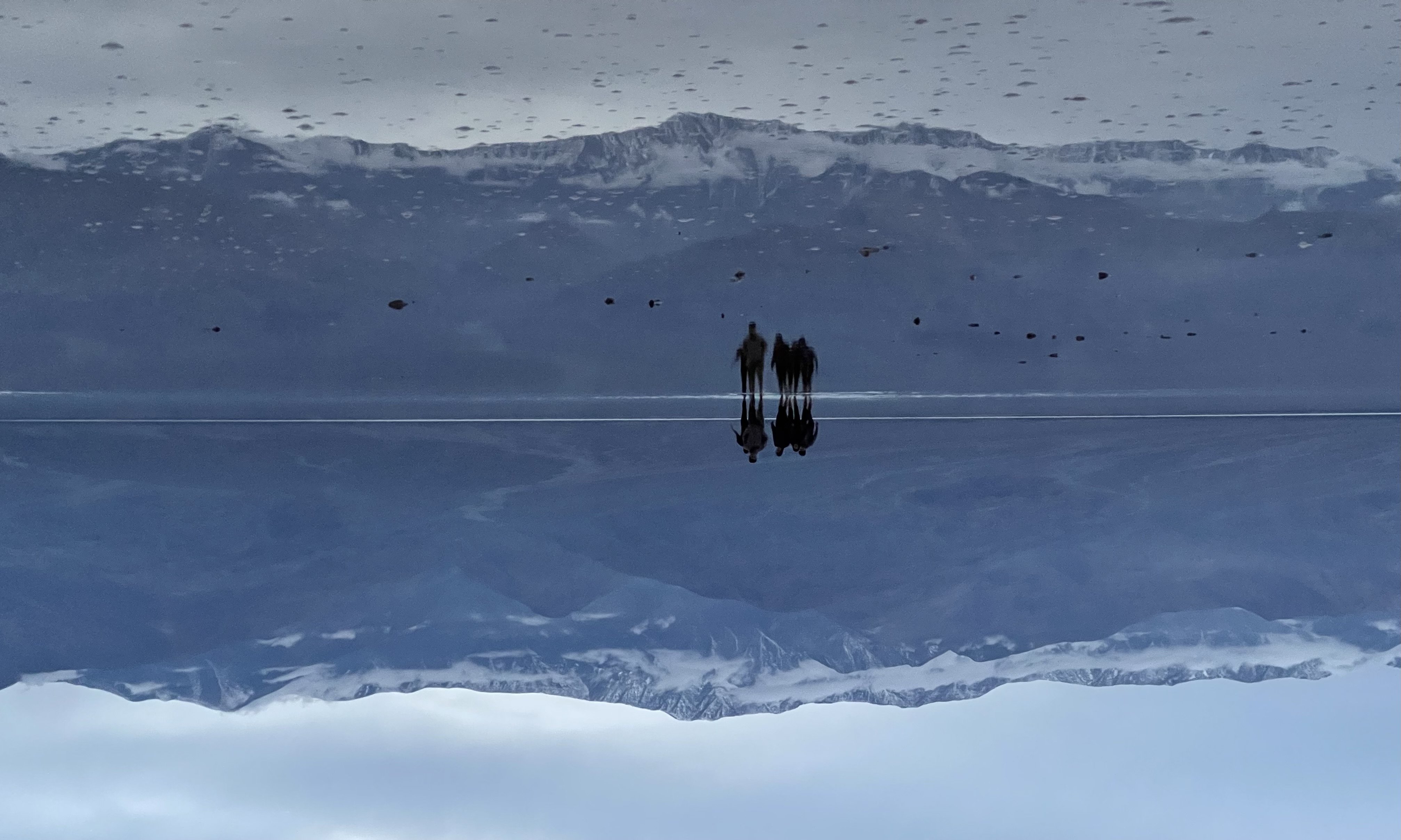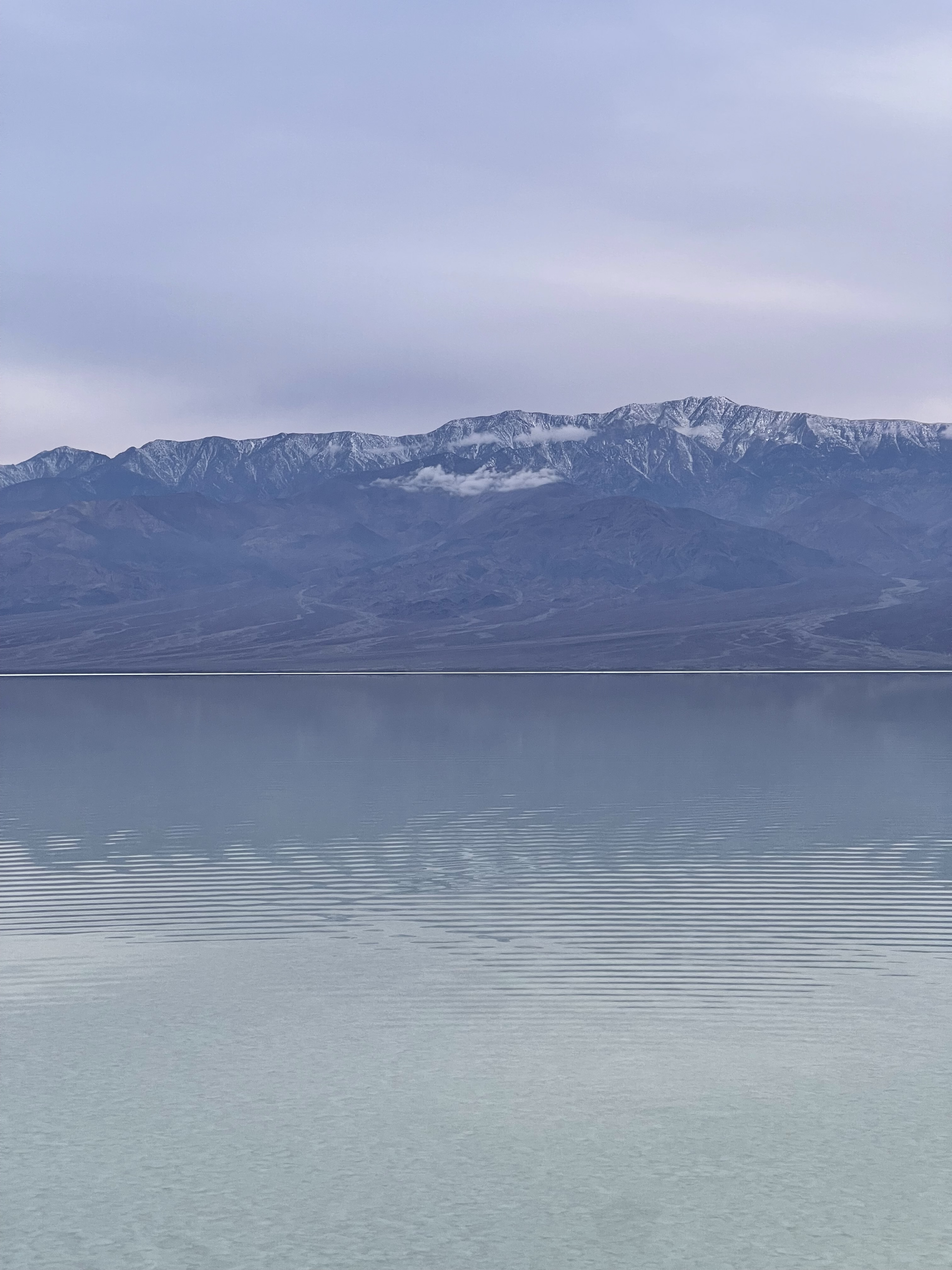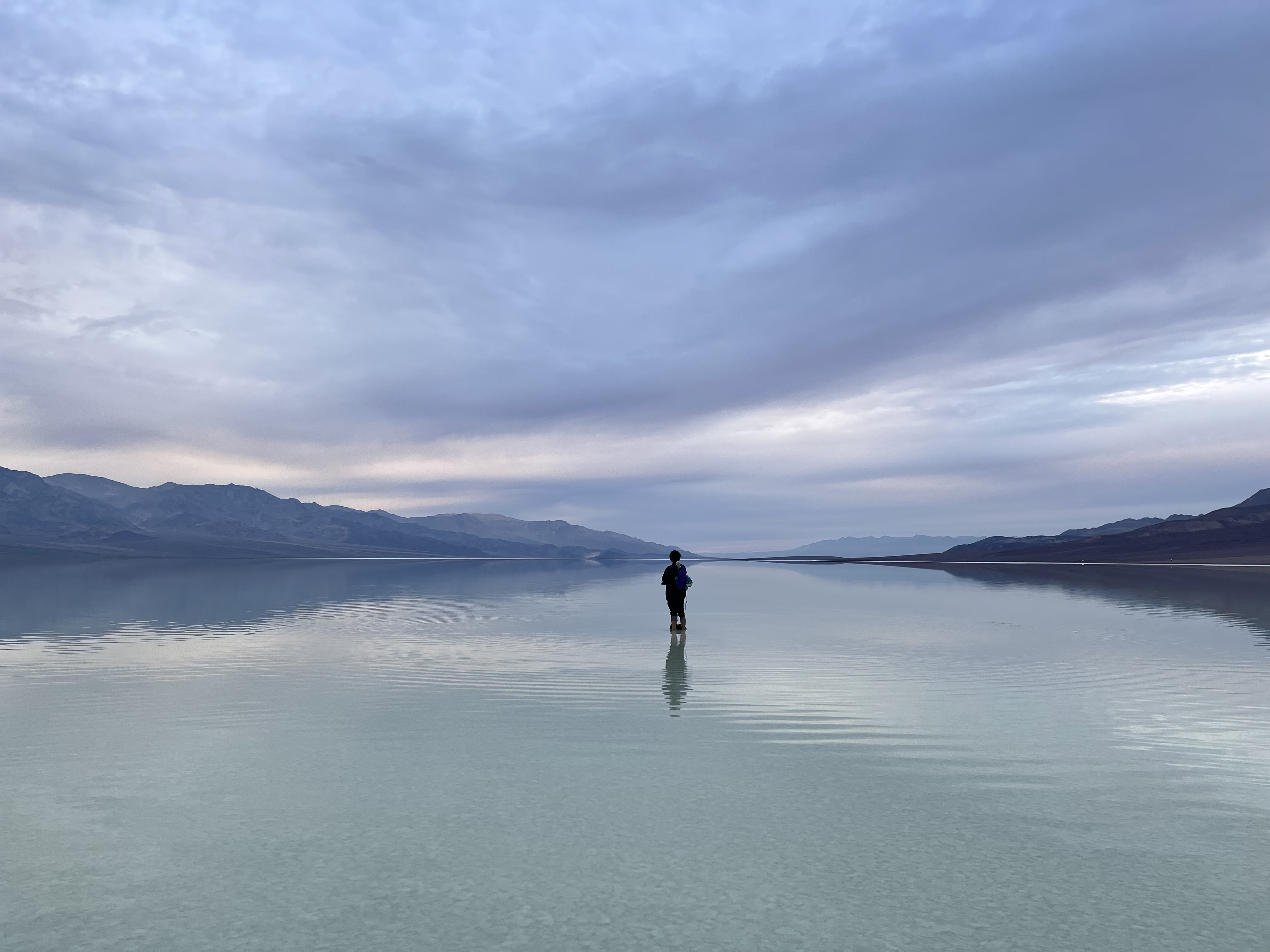 原本打算最后去Badwater Basin拍日落下的天空之镜,怎料当天阴天且有风,即没有日落也没有天空之镜。靠近岸边的湖里会有很多黑色砂石影响拍照,最好还是可以走到湖中间干净的区域拍摄(但是真的很冷)。阴天下的湖没有颜色,后面的雪山也显得些许单调。天空之镜对于湖面平整度的要求非常高,如果有一点风或者旁边人稍微挪动了一下掀起了涟漪就会失去天空之镜的效果,所以非常看缘分。