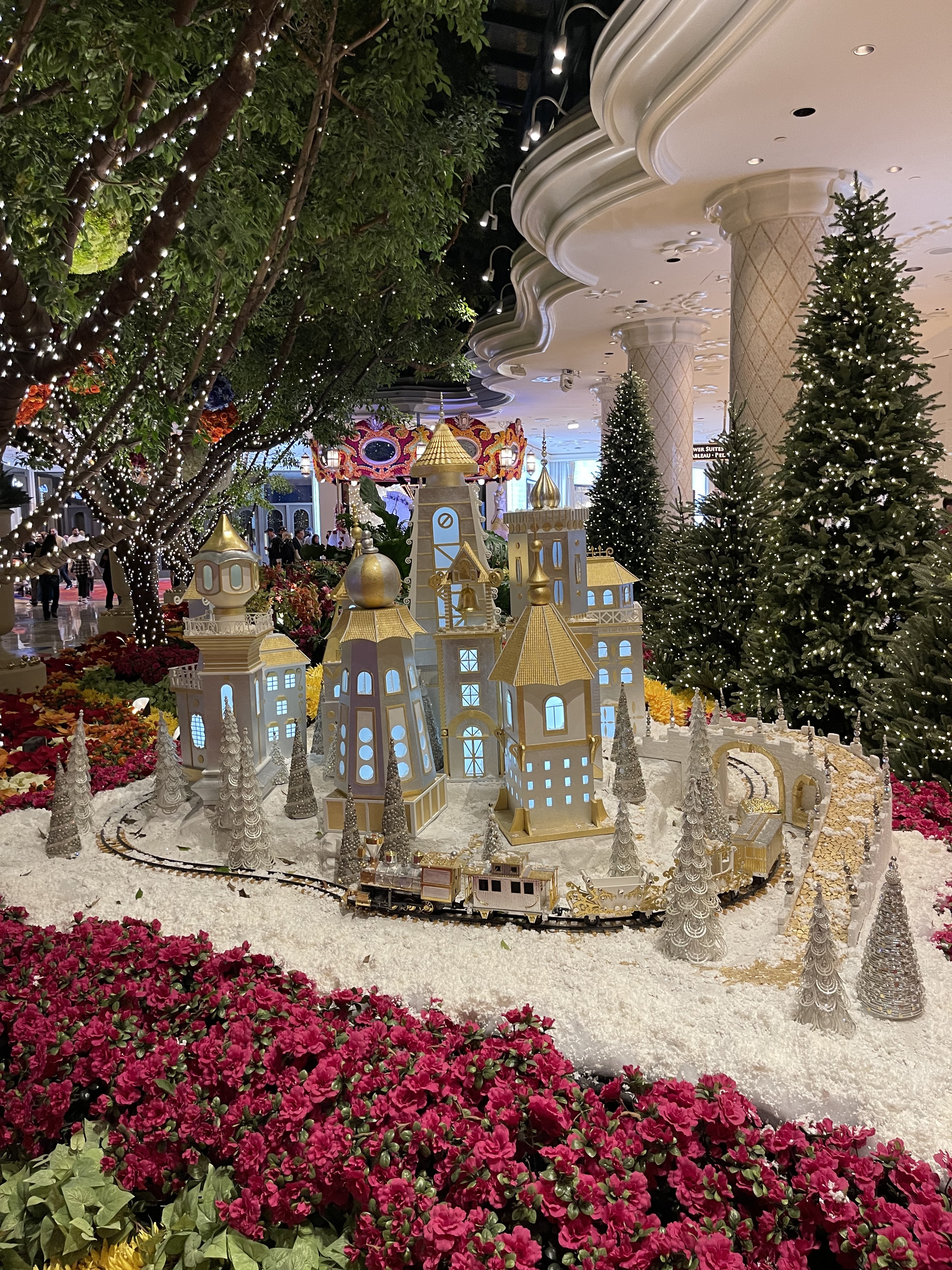 Wynn没有像Bellagio一样从头开始搭建一个圣诞主题的装饰,而是保留了原有的旋转木马的基础上在花丛中摆上了很多和雪相关的元素,包括雪中的小房子和小火车,整体上还是很协调的。