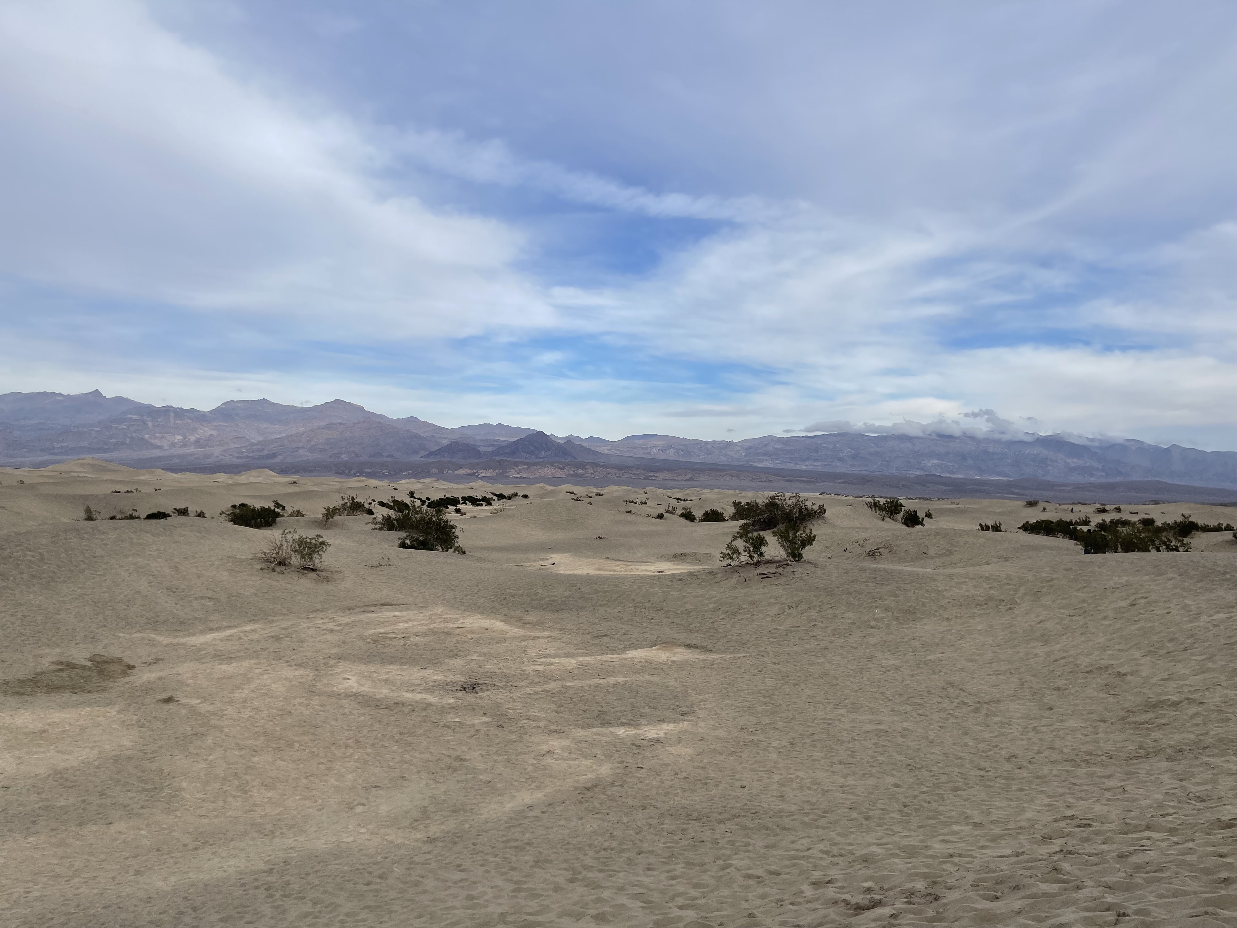 在Visitor Center拿了地图买了冰箱贴(夏天如果车内储水不够的话请务必在这接足够的水)之后,继续往北到了公园相对比较北边的景点Mesquite Flat Sand Dunes。这时候天气已经完全转阴,因此沙丘看起来比较一言难尽。相比白沙这里的沙丘从颜色到规模都没什么特色,算是踩雷景点,时间不够的话完全可以略过。
