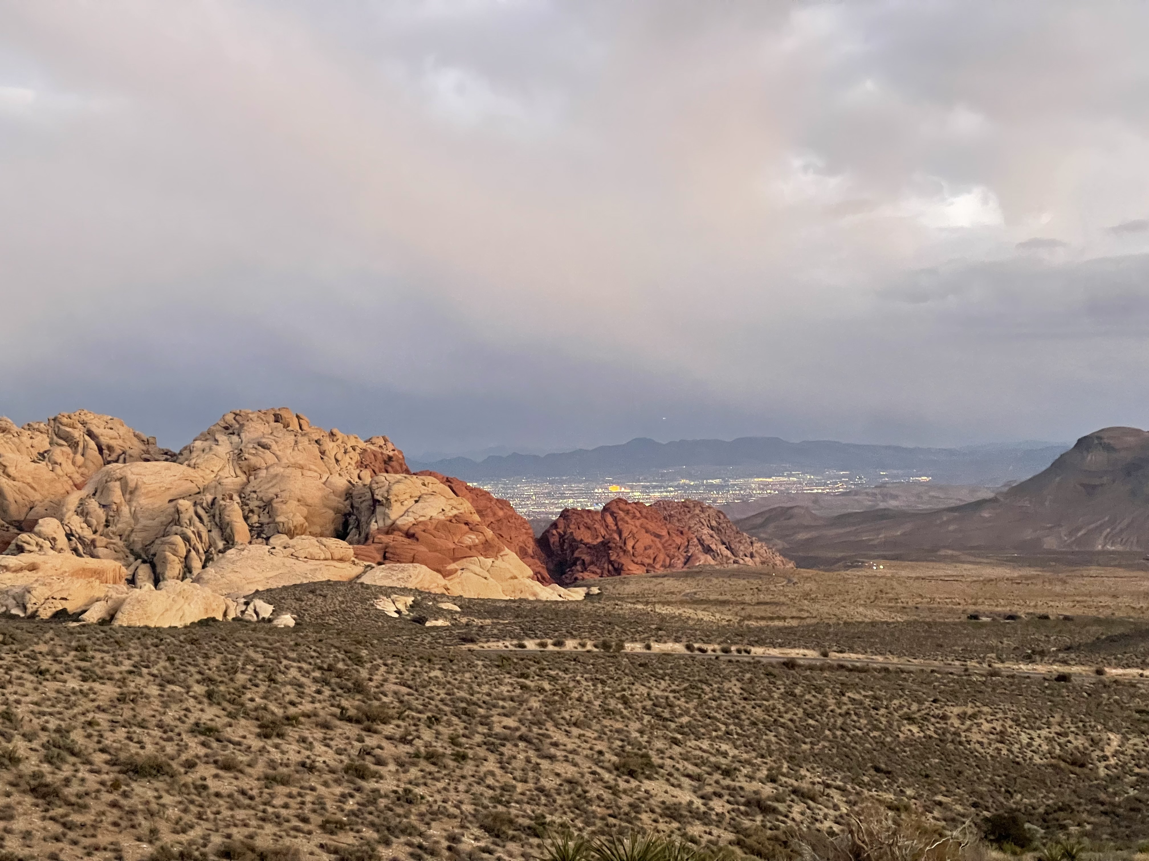 在轮盘赌上all in了几个号码最后摇到一个00输光之后,一无所有的我回到了我(租)的宝马上出发去Red Rock Canyon散散心。因为忽视了时区变化所以日落时间比前几天差不多提前了一个小时,因此到达Red Rock Canyon的时候天色已晚,而且天气也是阴天。进门除了需要买票/出示国家公园年票外,还要有提前网上预约,通常网上预约每个时间段都有充足的位置,但就是要付2刀的service fee。如果在网上没有预约,虽然大概率在门口也会让进去,但是补交2刀还是免不了(回哺热心网友dp),但是似乎我的Amex卡一直刷不出来就没收钱把我放进去了。至于园内的景色,如果刚从Arizona和Utah回来的应该是很难看得上的。