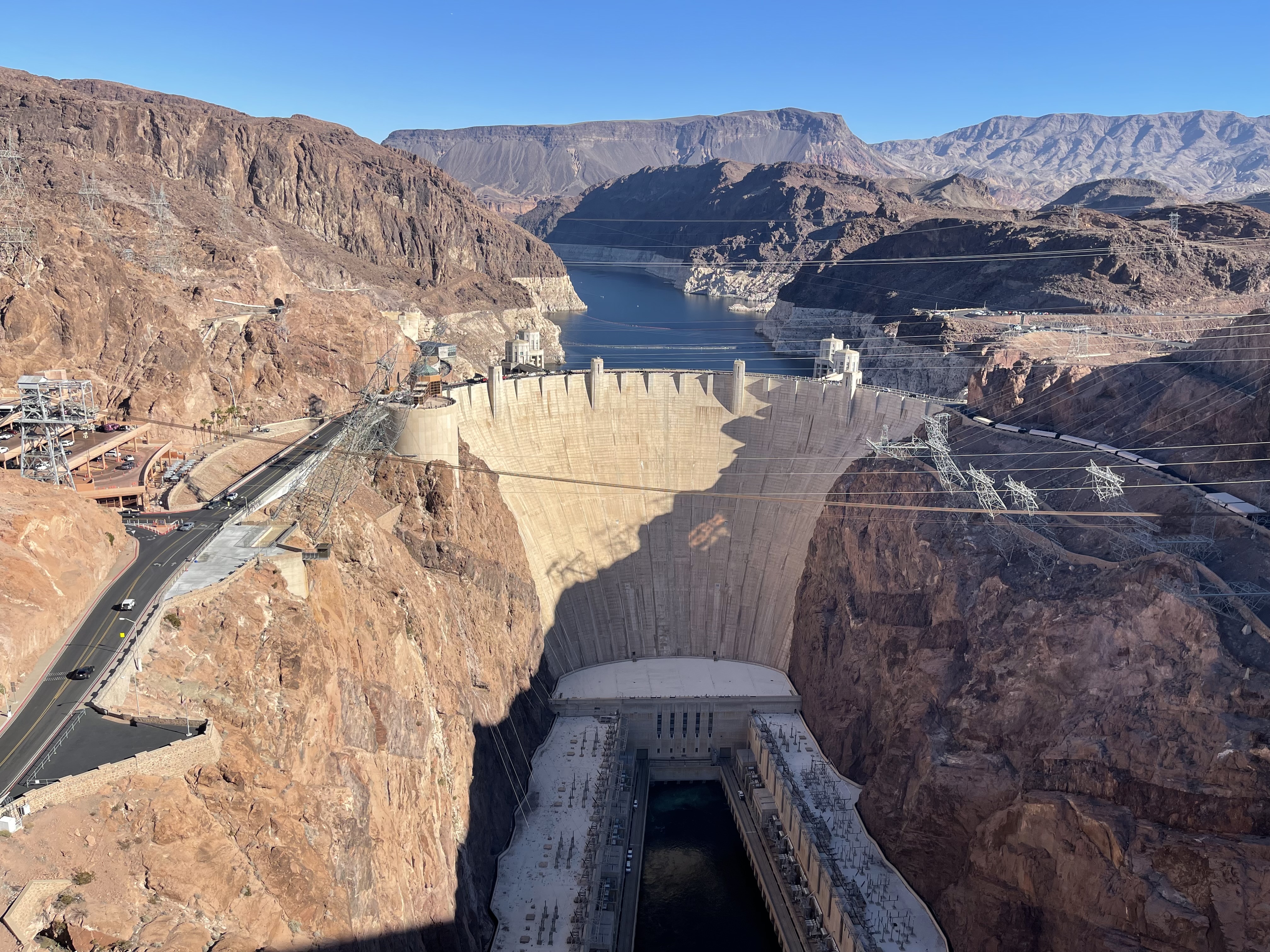 继地理课本和生物课本之后,历史课本上的内容也在倒数第二天粉墨登场了。Hoover Dam始建于Hoover的任期内,作为经济大萧条时期以工代赈兴建基建发展西南部的重要建设工程之一,同时也是Arizona和Nevada州界的一部分,因此大坝两边有一个小时的时差。在进入景区之前会有安全检查站,但也只是敷衍地看一眼车里有没有什么可疑物品。如果时间充裕可以开车上大坝和参观Visitor Center,不过我们赶时间走马观花就把车停在大坝旁的停车场走上US-93的桥上俯瞰大坝全貌了。