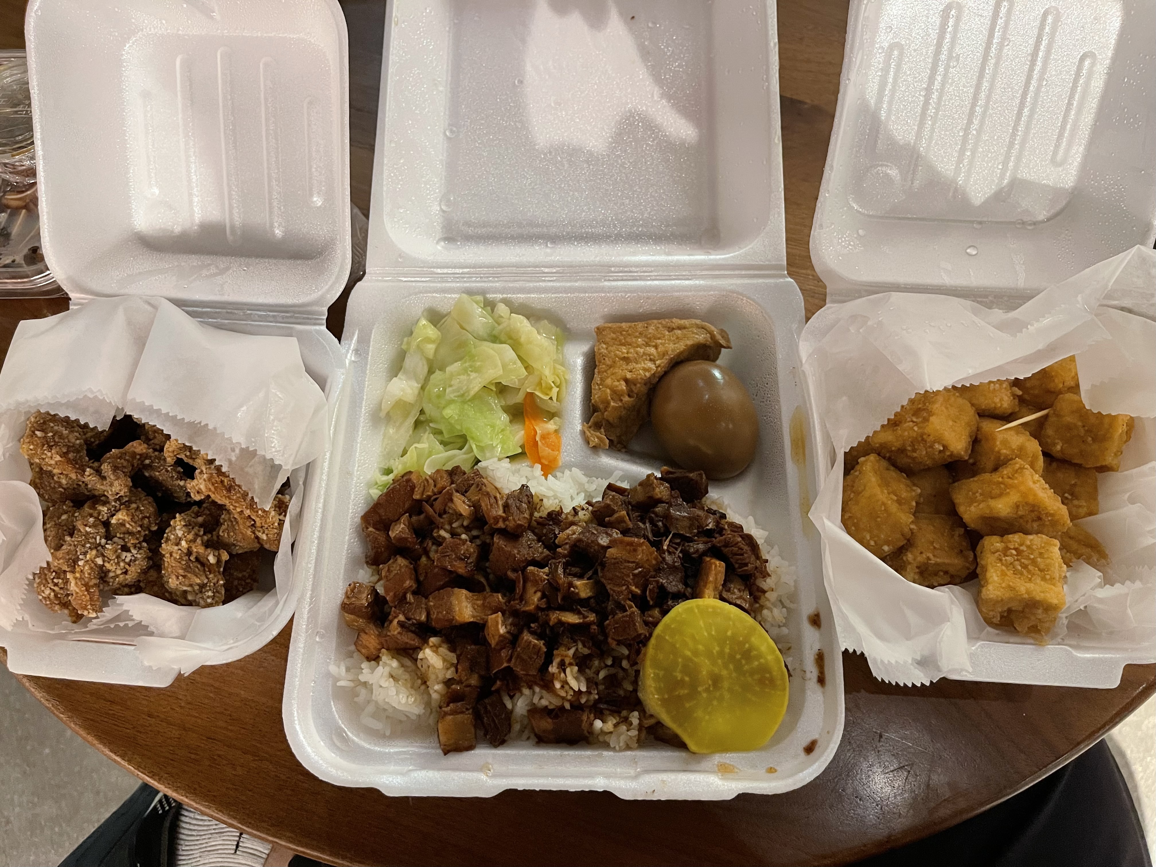晚上从Tucson往Kingman赶的时候在Phoenix附近找吃的解决晚餐。因为护国神山在Pheonix建厂也有一阵子了,我们天真的认为这里的台菜应该不错,于是找了一家评分超高4.7的台菜Yes Cafe Chandler。由于我们到Chandler已经靠近店家关门时间,于是我们决定提前点外带然后找家Starbucks解决。点完之后店家立马打电话说我点的控肉饭卖完了,想换成彰化肉丸也没有,最后只能被迫换成卤肉饭还得加钱。拿到菜的时候就知道不太对,盐酥鸡里没有九层塔,炸豆腐软塌塌,卤肉很柴米饭很干,没有一道菜能上及格线。看评论说这家店在Chandler是老店了,那我只能表示还是等TSM Arizona工厂再多带一些台湾正宗的在地美食来Phoenix之后再来这里试台菜吧。