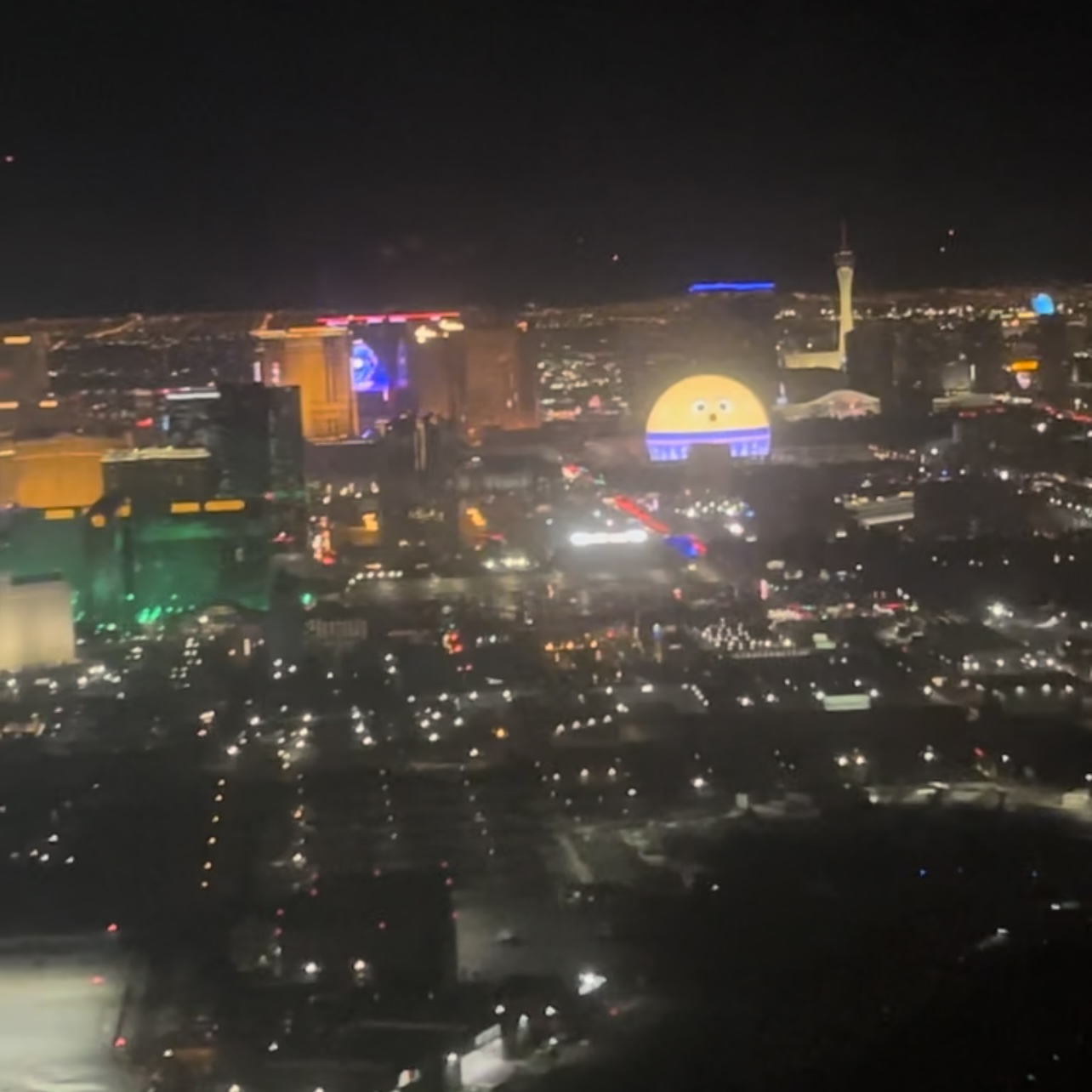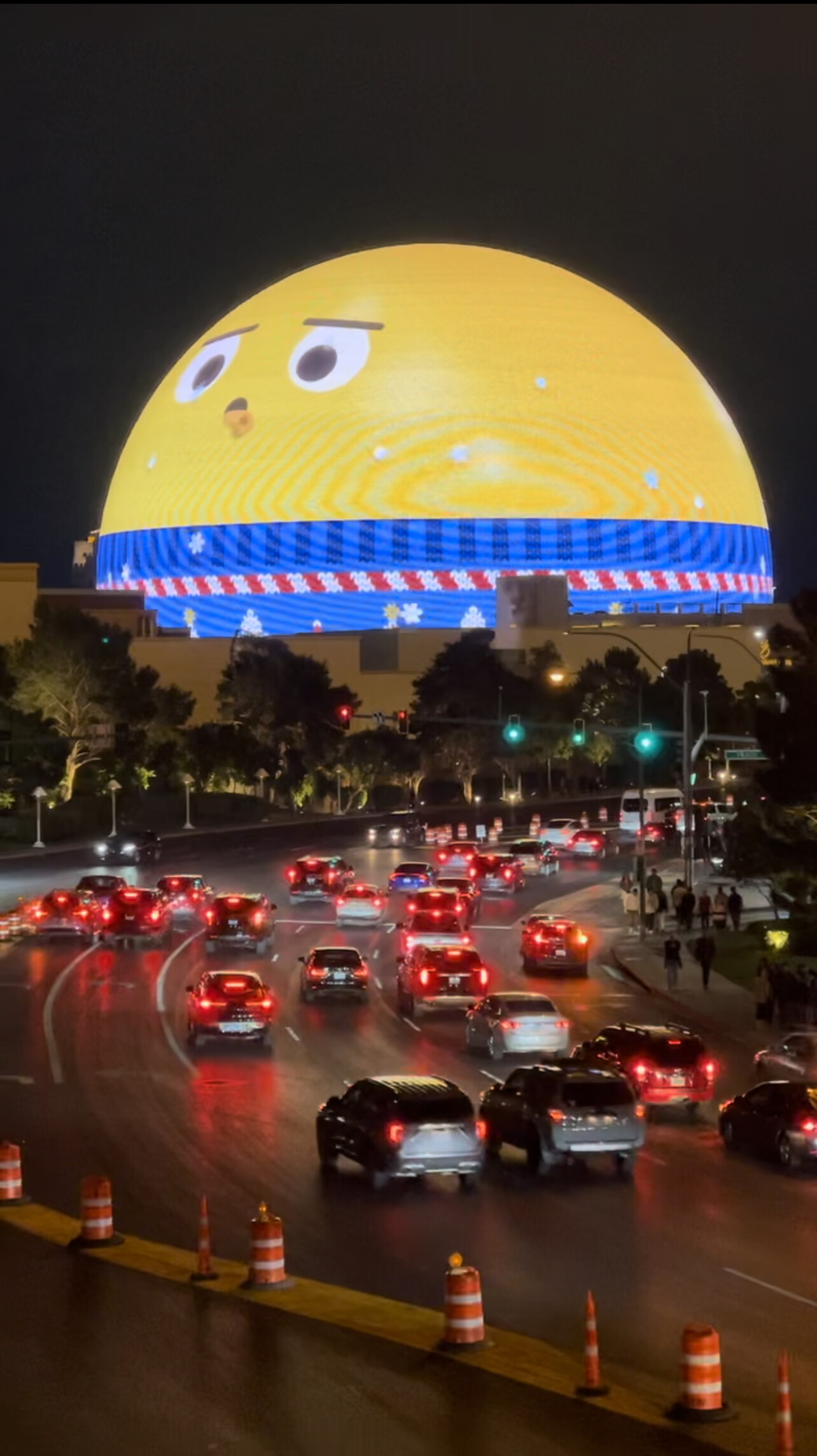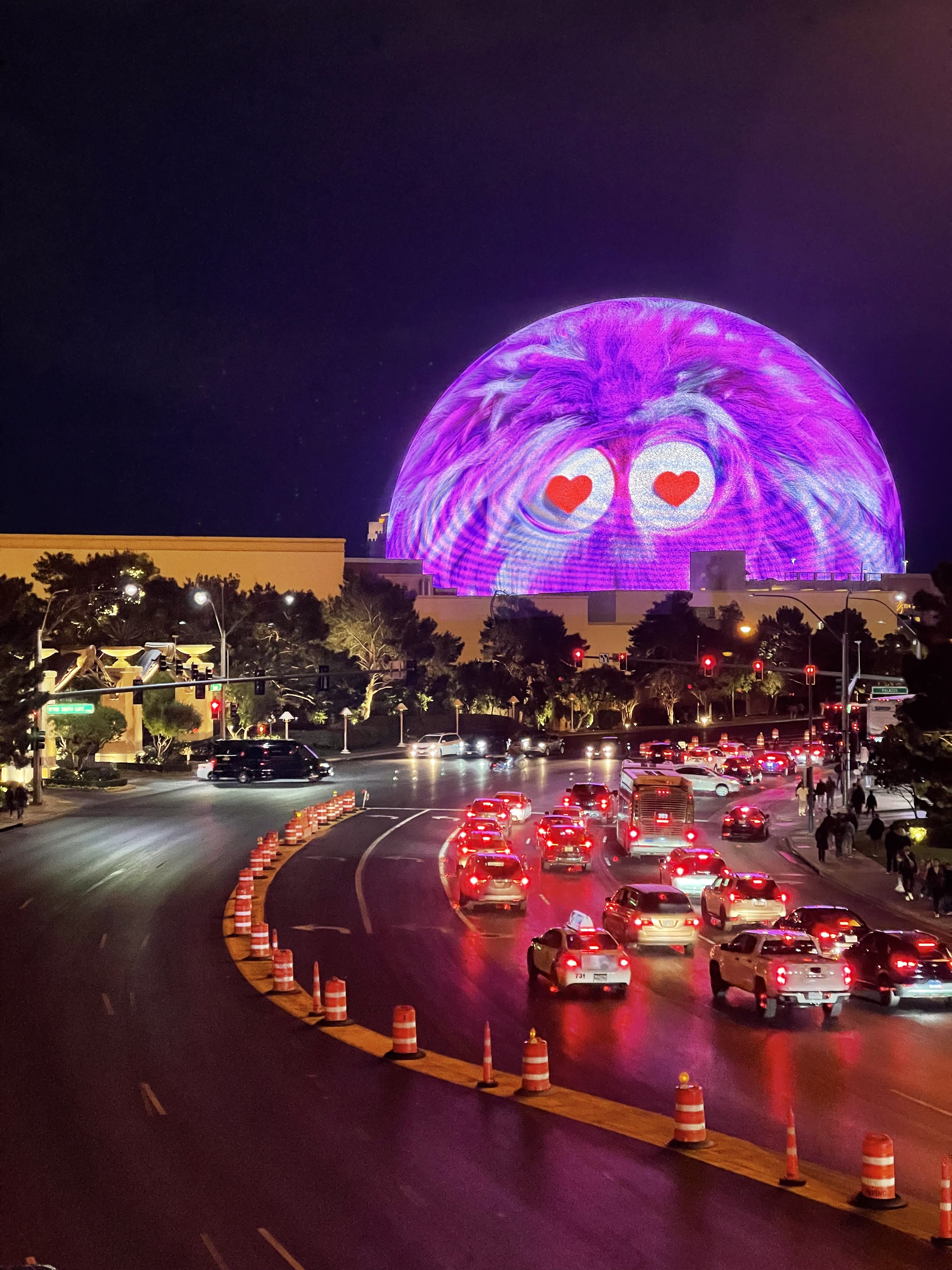 年底The Sphere的风吹的太大,以至于我原本没有这个行程的安排,但是想着来都来了就去看一眼好了。泥潭和xhs上都已经讨论了很久观赏大球的观景点有哪些,收费的当然是Wynn和Encore的球景房,Venetian球景房,Palazzo球景房,和Westin的球景房,但是因为第二天还要去Death Valley所以已经决定住到Pahrump去了,因此当晚就挑免费的打卡点看一下好了。最佳的免费且不会被赶走的打卡点在Palazzo和Wynn之间的天桥上,在这里看The Sphere除了最底部很少一部分看不到之外,其他的主体部分都能尽收眼底。拍照的话最好从护栏玻璃之间的缝隙拍不会有反光。不过这个打卡点最大的缺陷就是后面有一个非常敬业的墨西哥大叔在天桥上卖唱,再萌的emoji表情拍出来的视频都透着一股taco的味道,甚至中间有一段大球上歌舞秀的广告配上大叔的歌声被我拍成视频发给姐妹,姐妹完全没发现背景音乐并非来自The Sphere官方。Emoji表情的话大概每15-20分钟会出现一次。