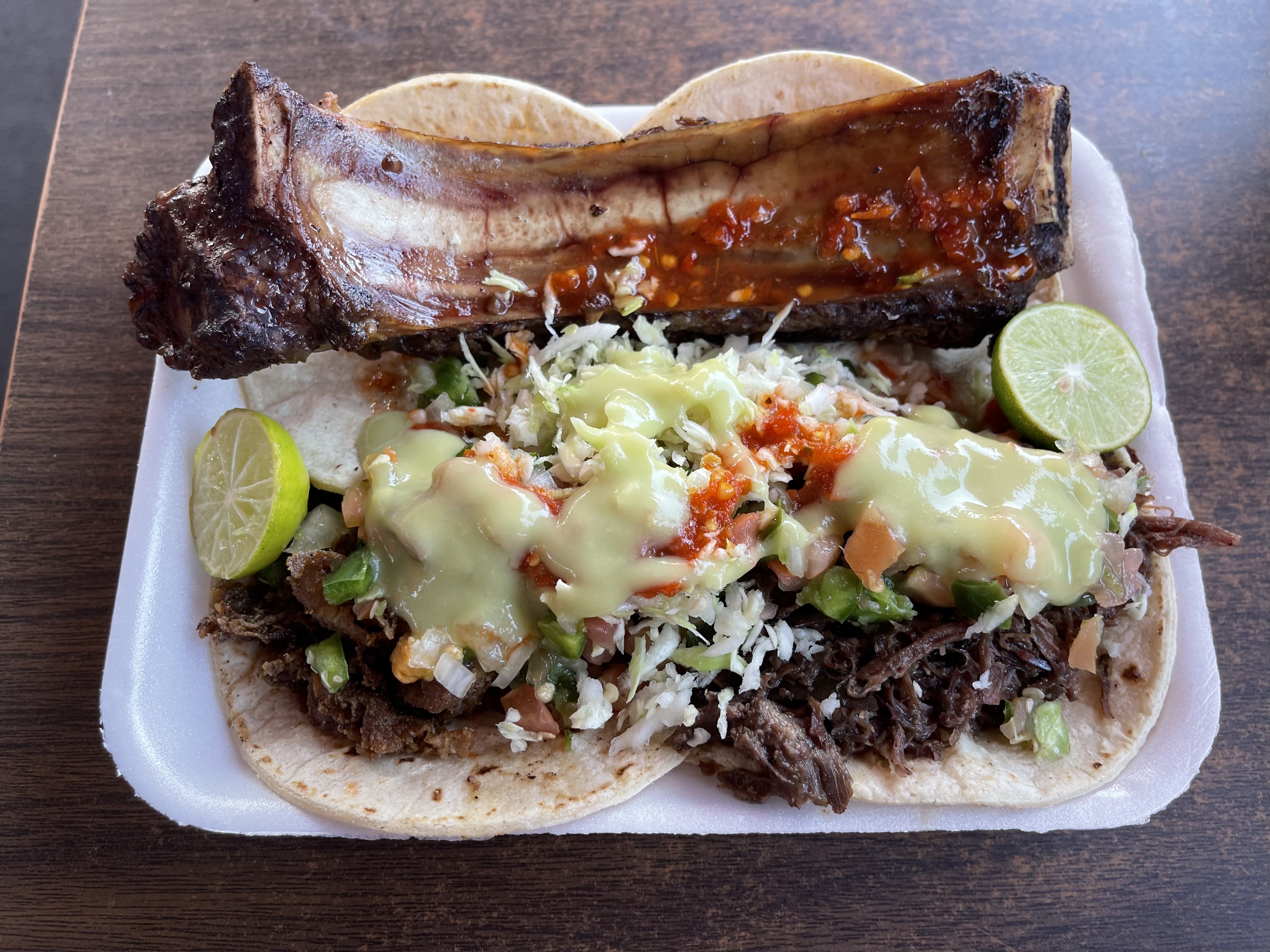 什么Yelp,xhs都是浮云,找吃的还是得看泥潭。在Pima Air & Space Museum逛了两个小时之后满脑子想的就只有Taco了,遂去纪念品商店盖上re-enter的印章直奔这家Los Tacos Apson。正如潭友描述的整家店听不到英文,好在菜单上有英文不至于点完都不知道点了个什么。我点了Cabeza,Tripa和潭友提到的Costillas外加一杯Horchata,真的是给香迷糊了。不过点餐时候我就有疑惑为什么Costillas这么便宜,拿到之后就有了答案:因为Rib上的肉都切给Rasurado了,骨头上的肉很少但是啃着还是很香。